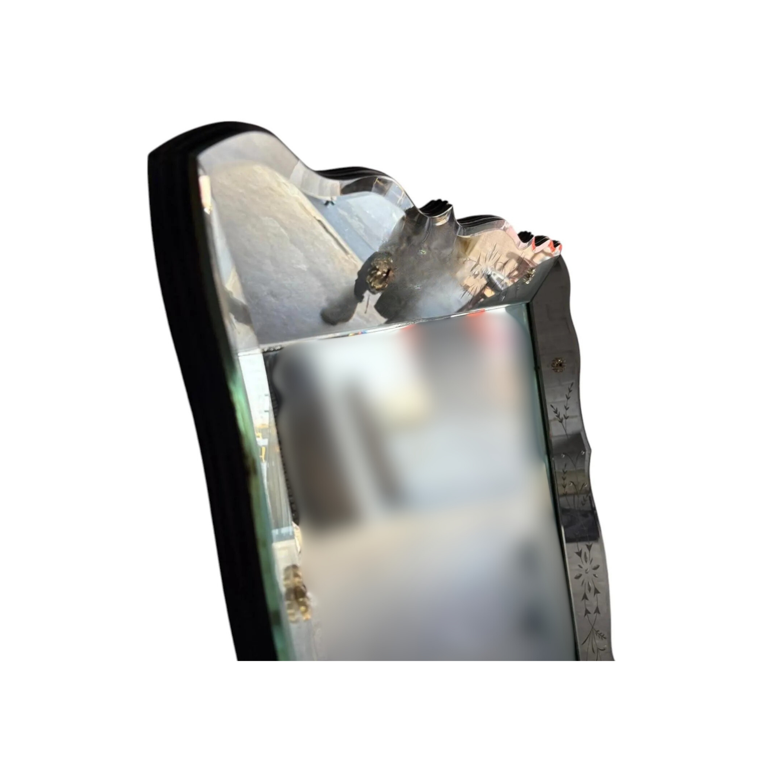 Stunning large mirror with scalloped edges in beautiful condition. Vintage Venetian Art Deco style mirror. Circa 1950 with small rosette pins at the corners.
