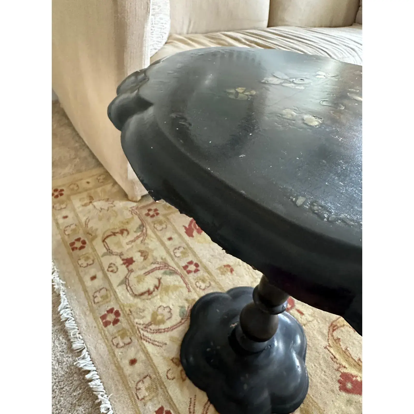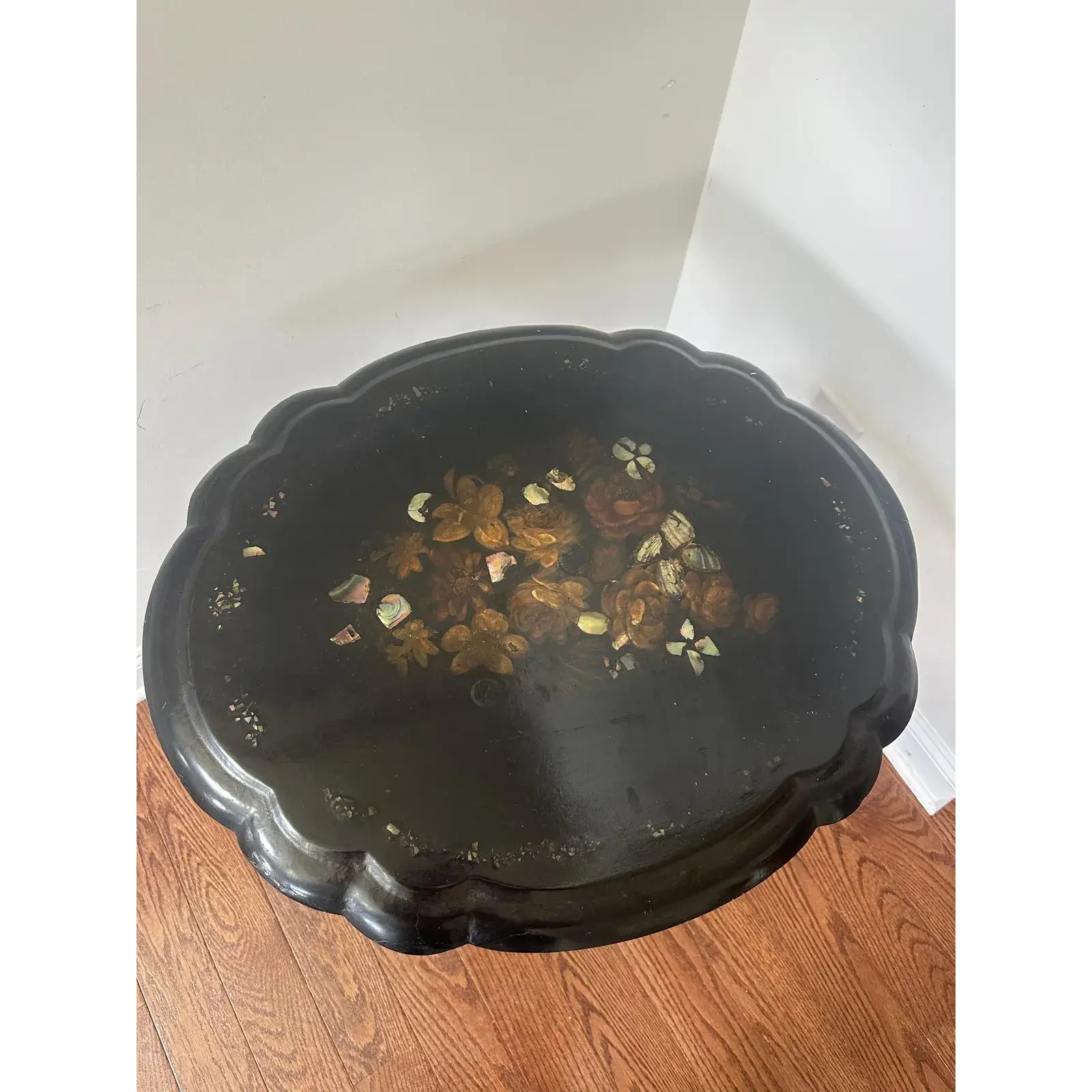 One-of-a-kind paper-mache black hand-painted table. Needs to be stabilized and repaired. The top has ornate detailing.