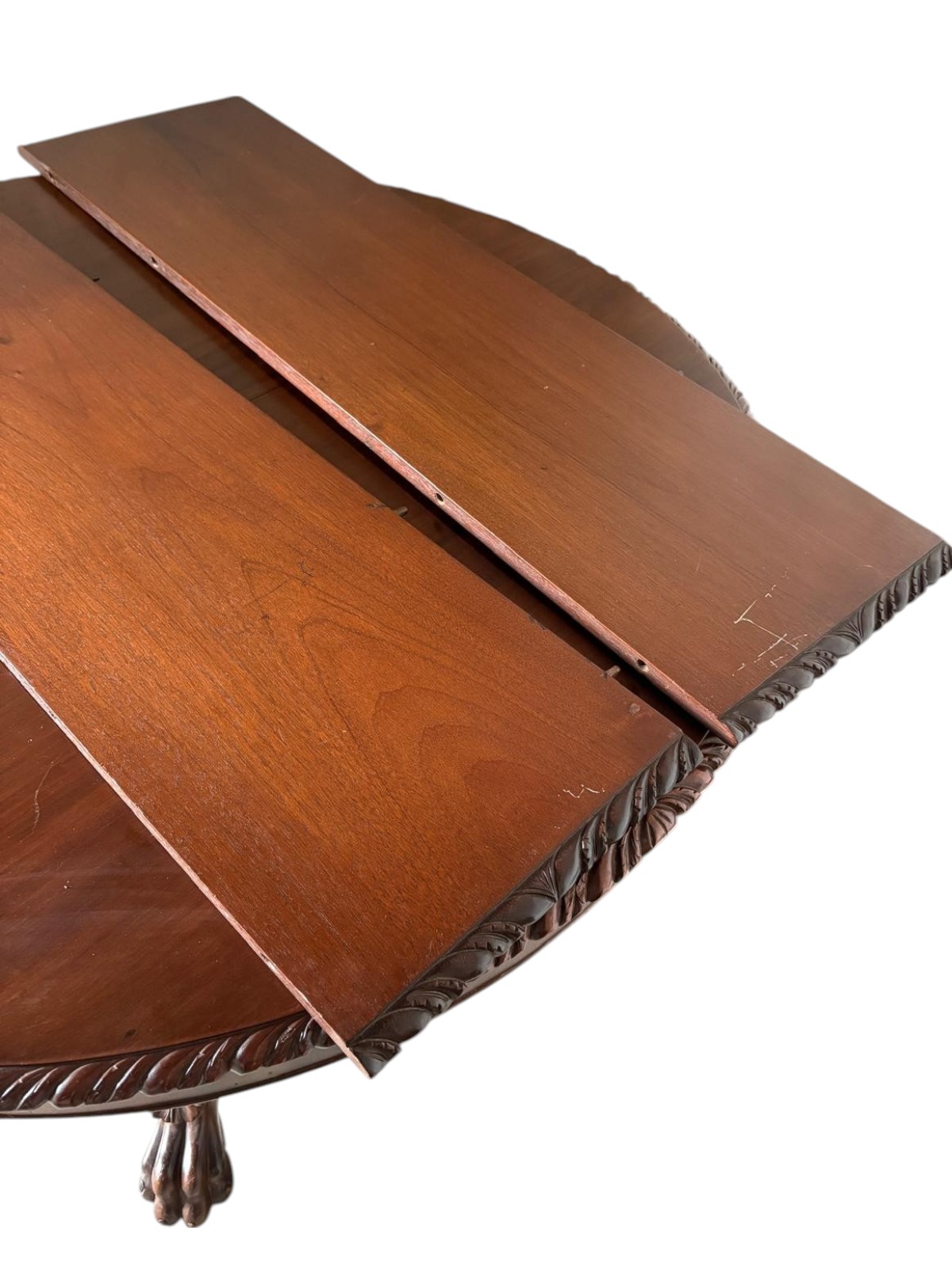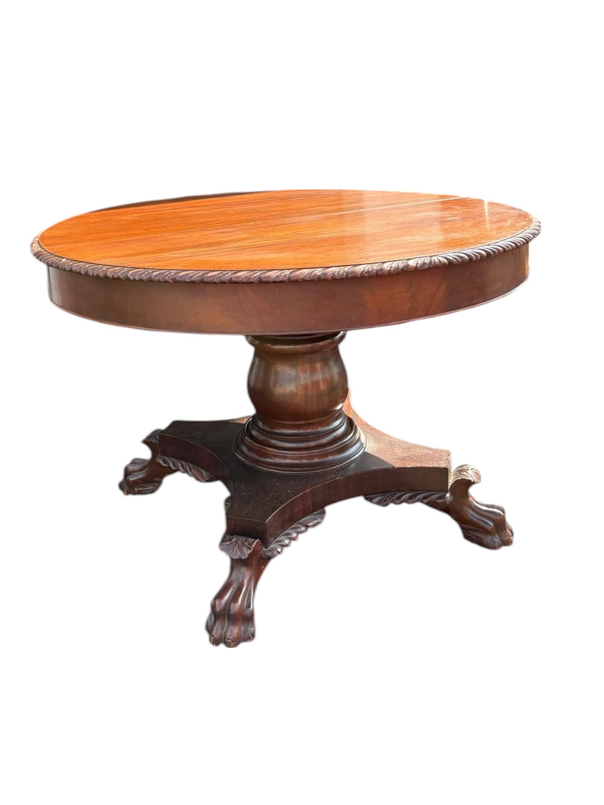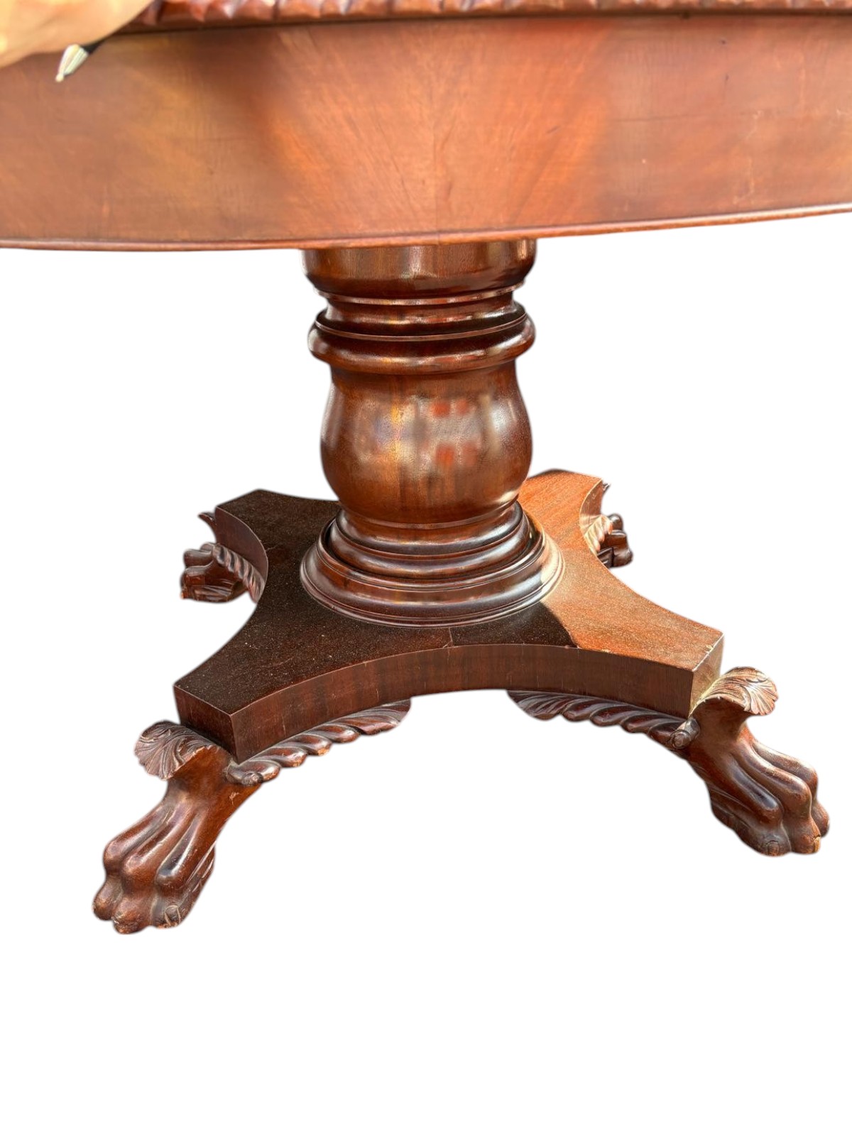 Beautiful 1930s solid mahogany Empire style table. It comes with 2 leaves if you need to extend the table. Hand turned pedestal base with carved paw feet, carved feather trim around the base and around the top of the table.