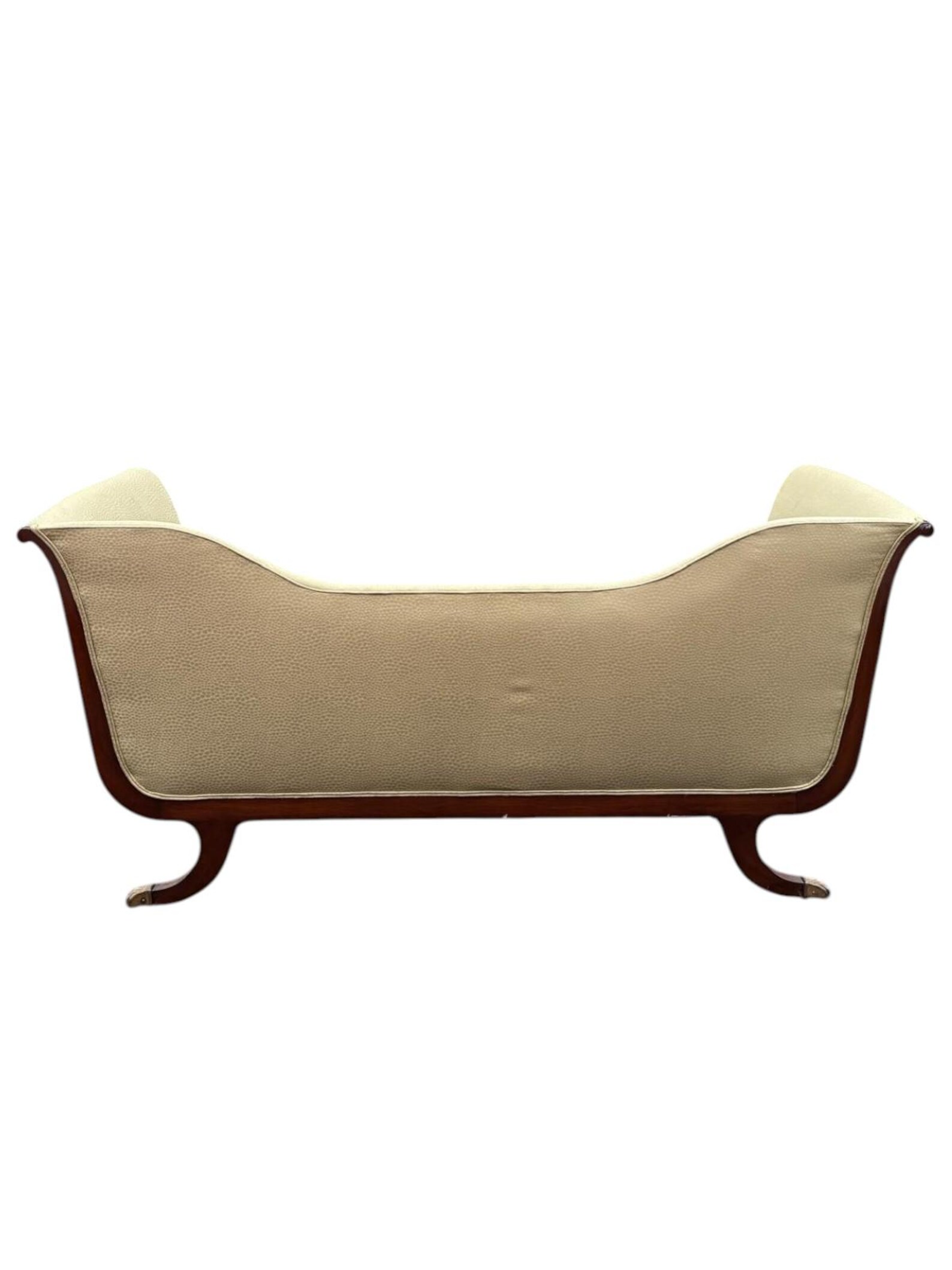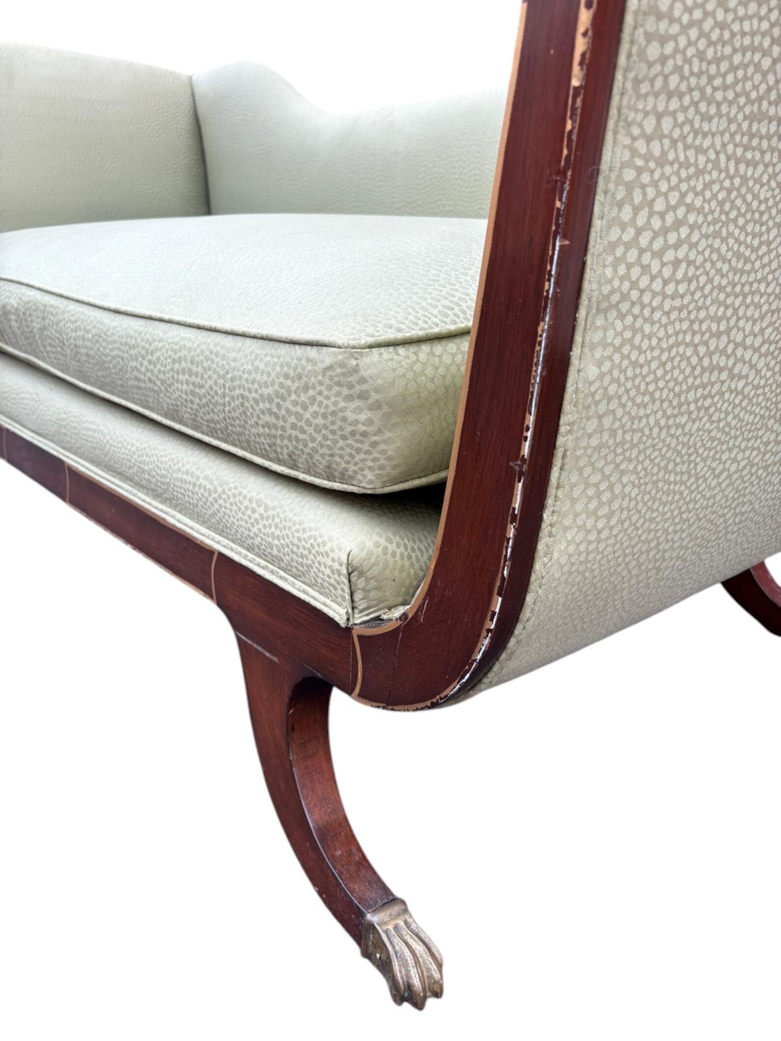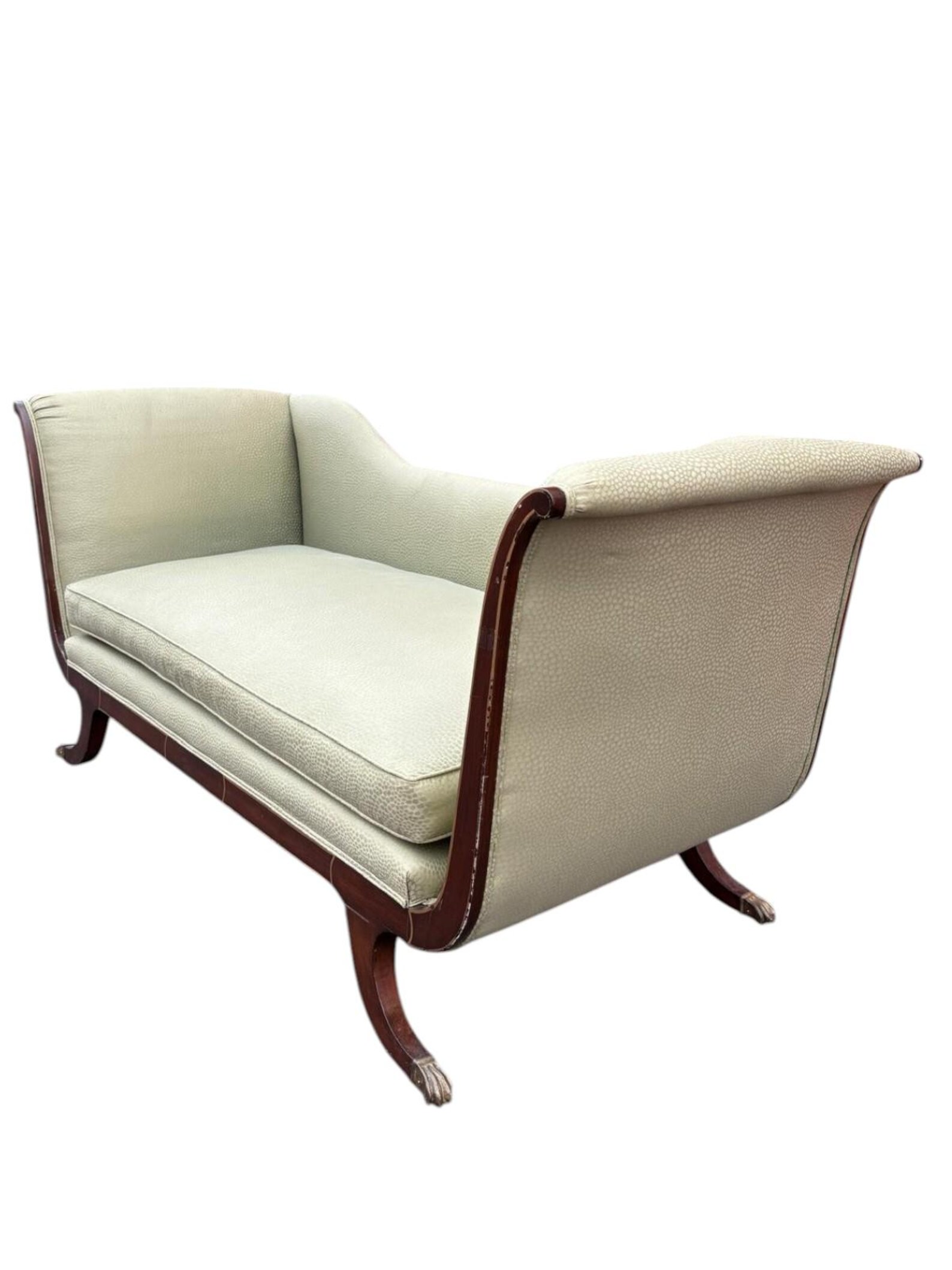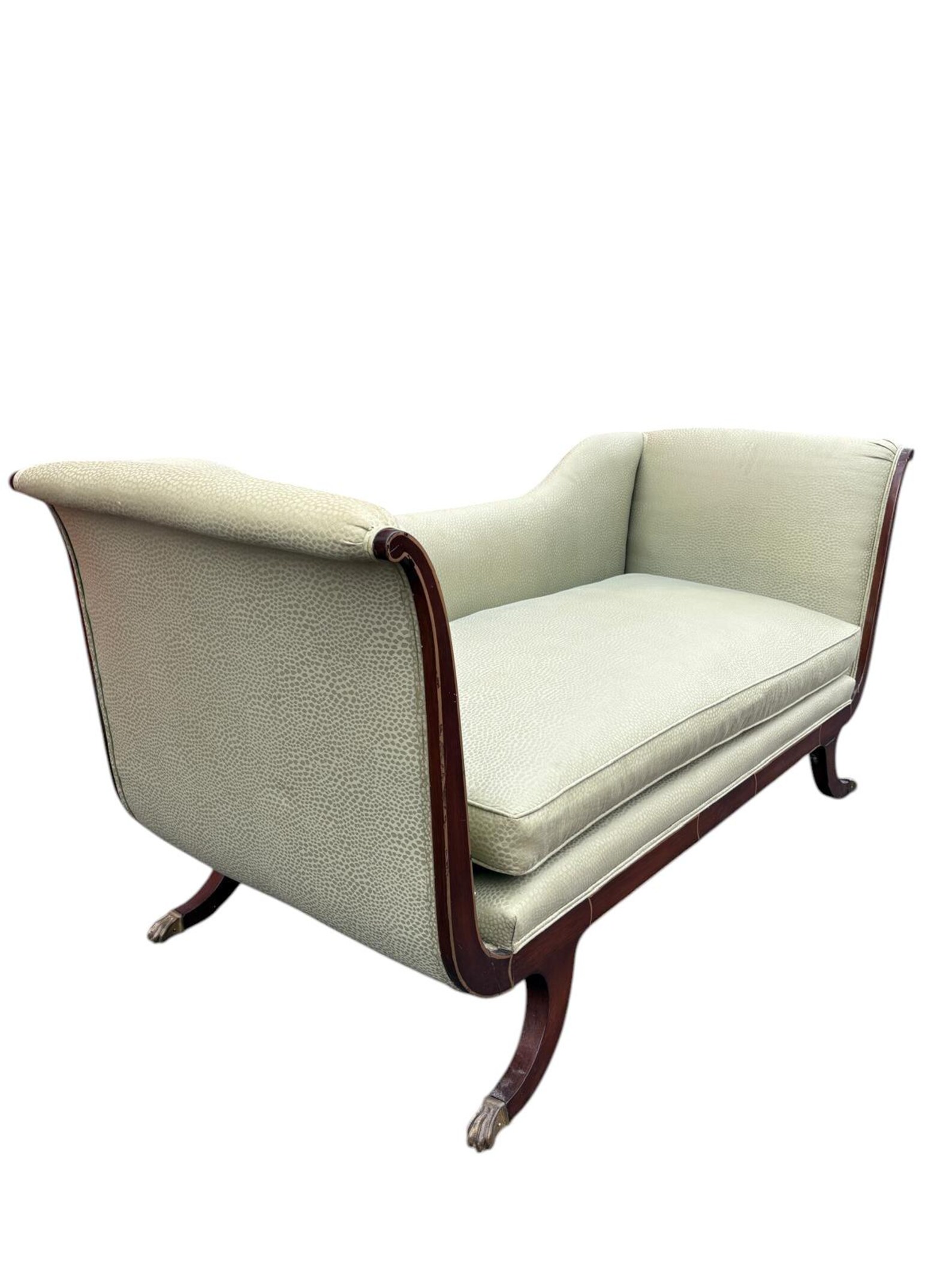 Pristine Neoclassical antique Empire Style 1940s sofa in a light sage green upholstery. Rolled arms with lovely banded wood trim and brass capped feet. The seat cushion is deep and comfortable – perfect for a formal living room or a statement piece in an interior design project. There is minor markings/wood frame & legs from age & moving (pictures included to show).