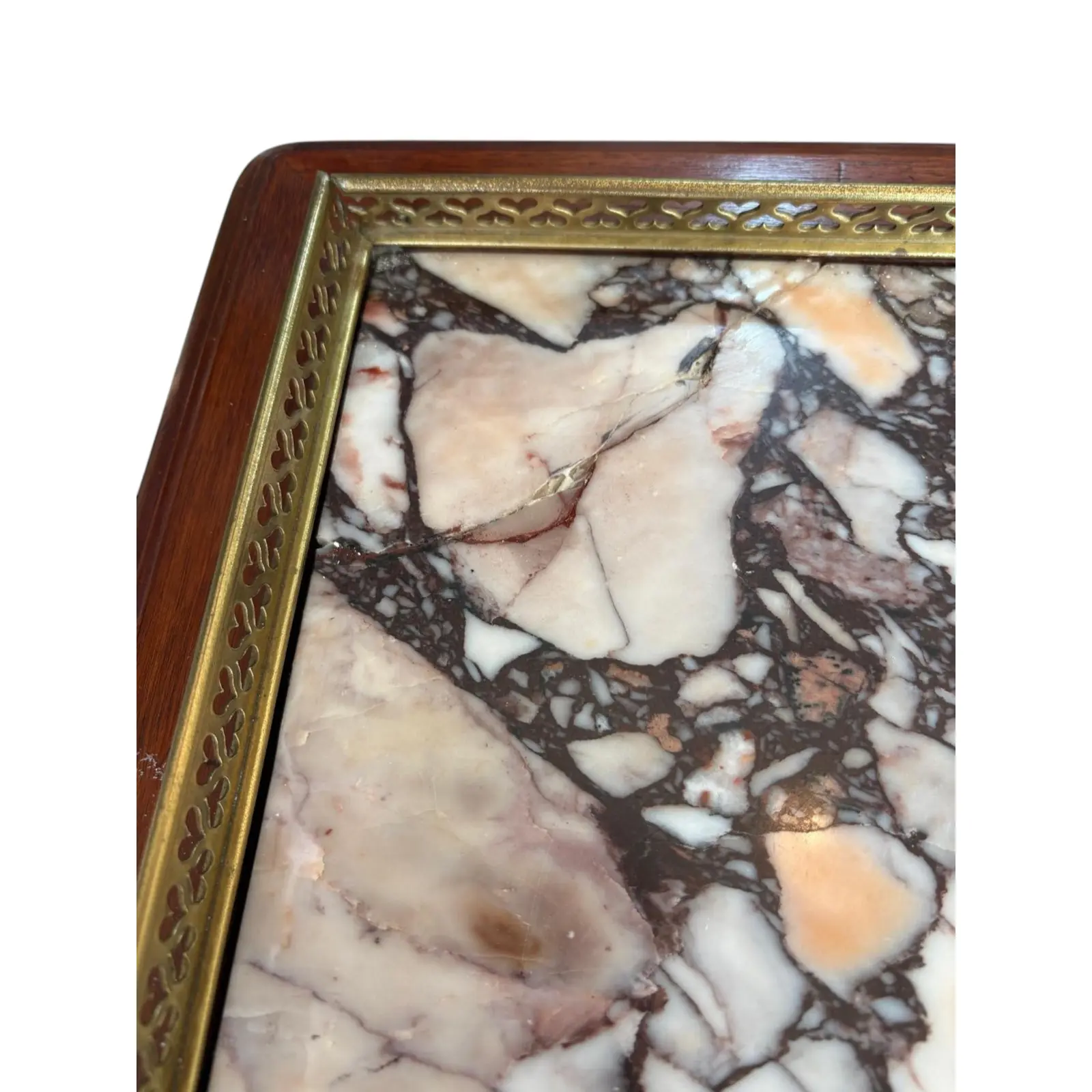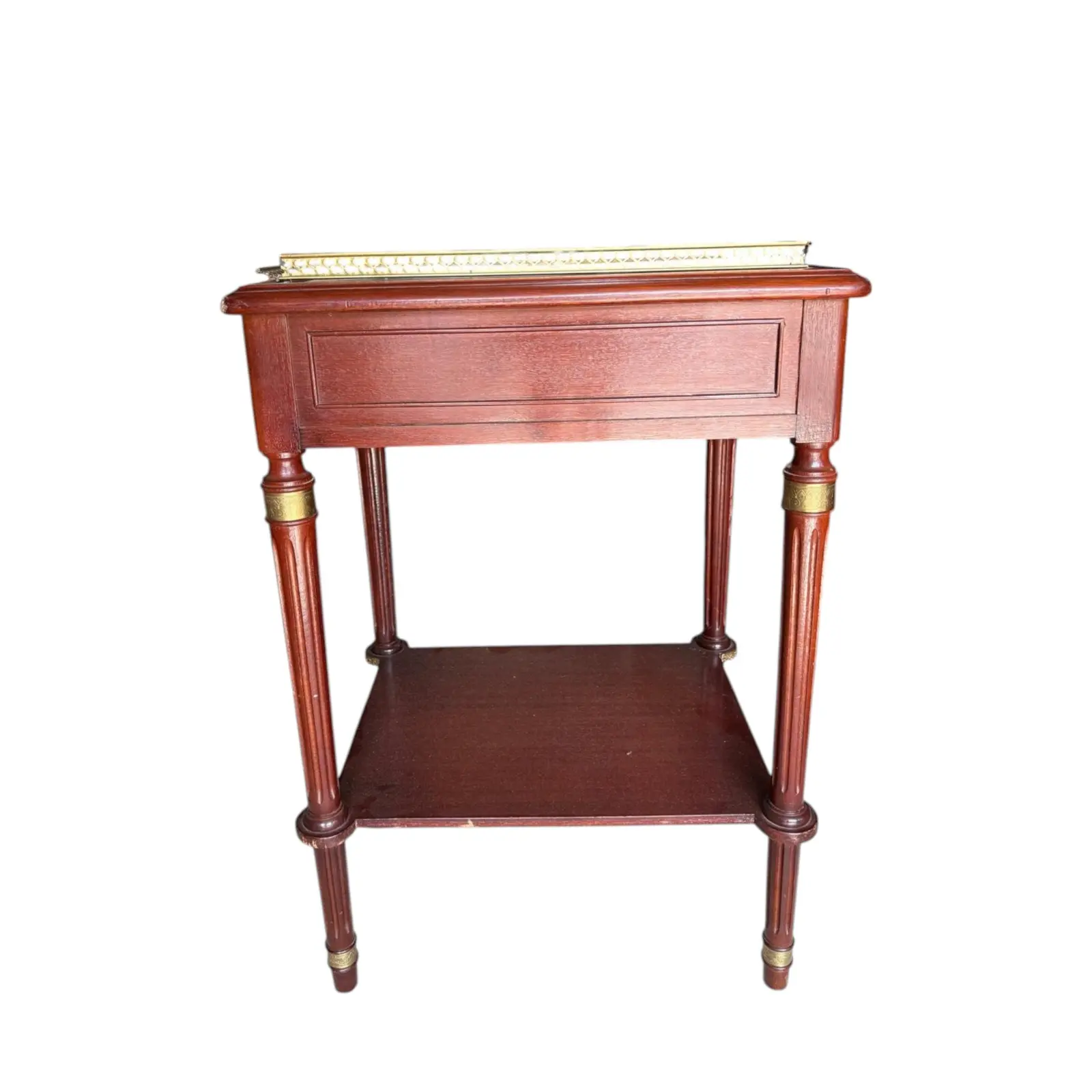 Marble top occasional table with three-quarter pierced gallery surround and ormolu detailing. Louis XVI style from the late 18th century. Perfect as a side table, entryway piece, of nightstand. There is a crack in the marble on the top but it still is gorgeous.
