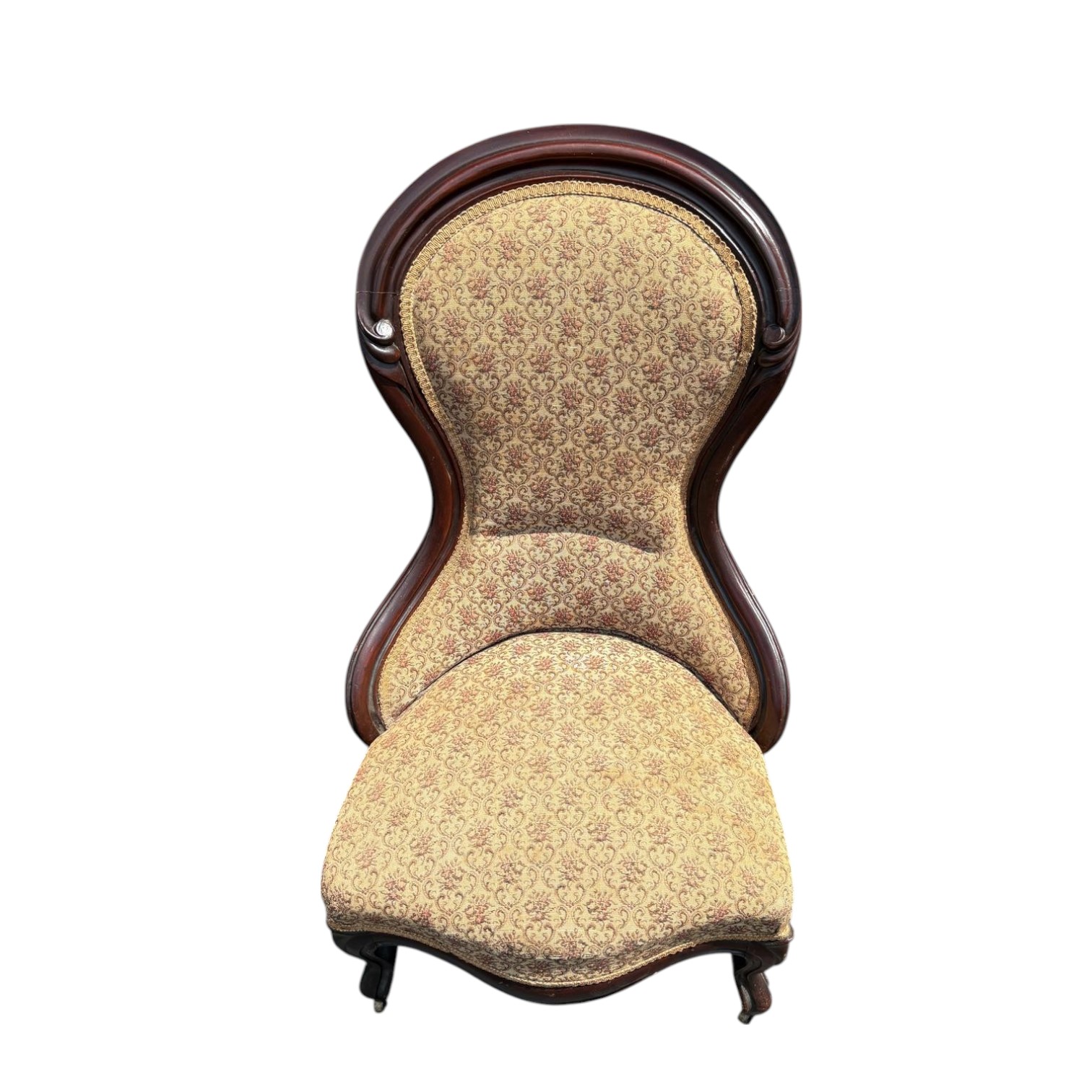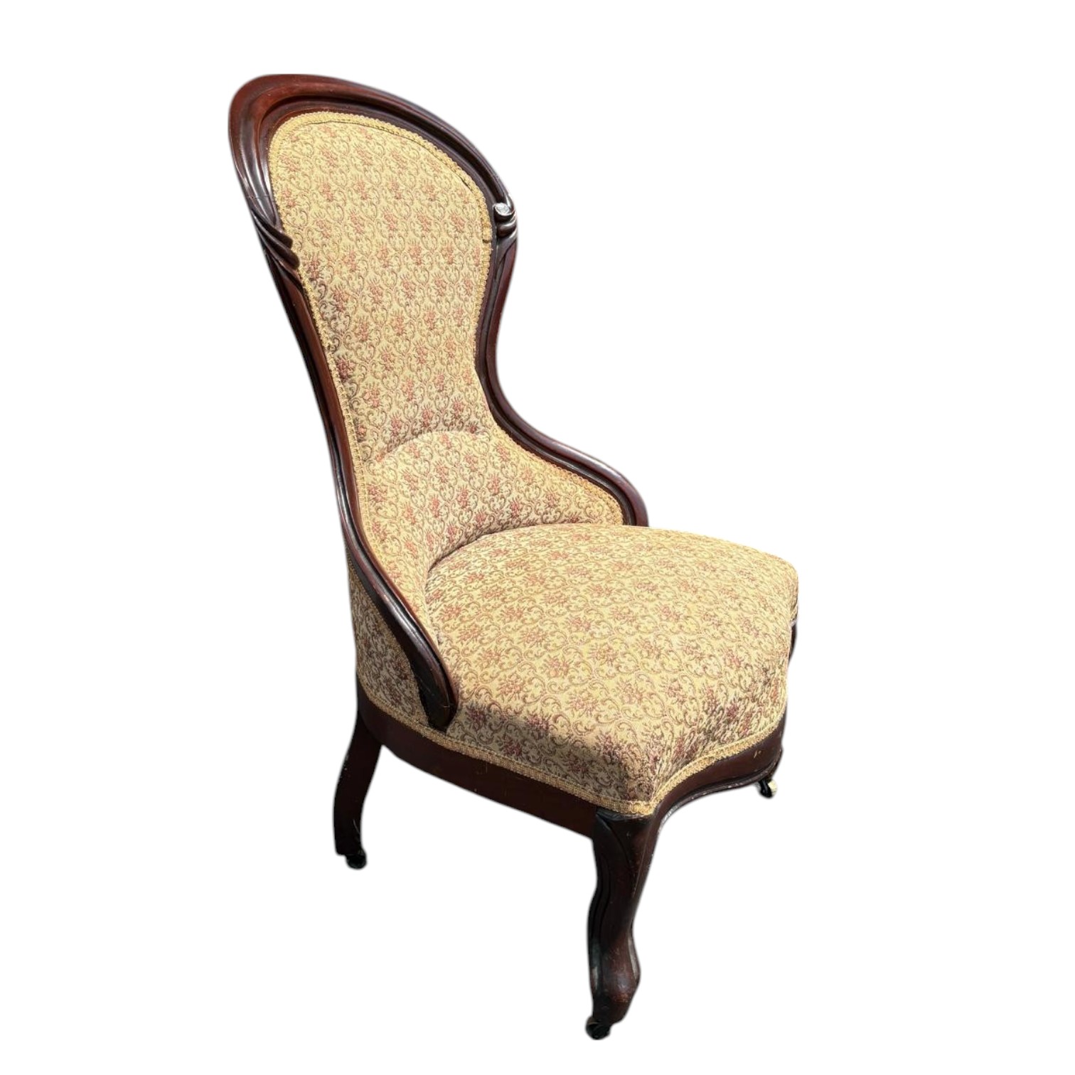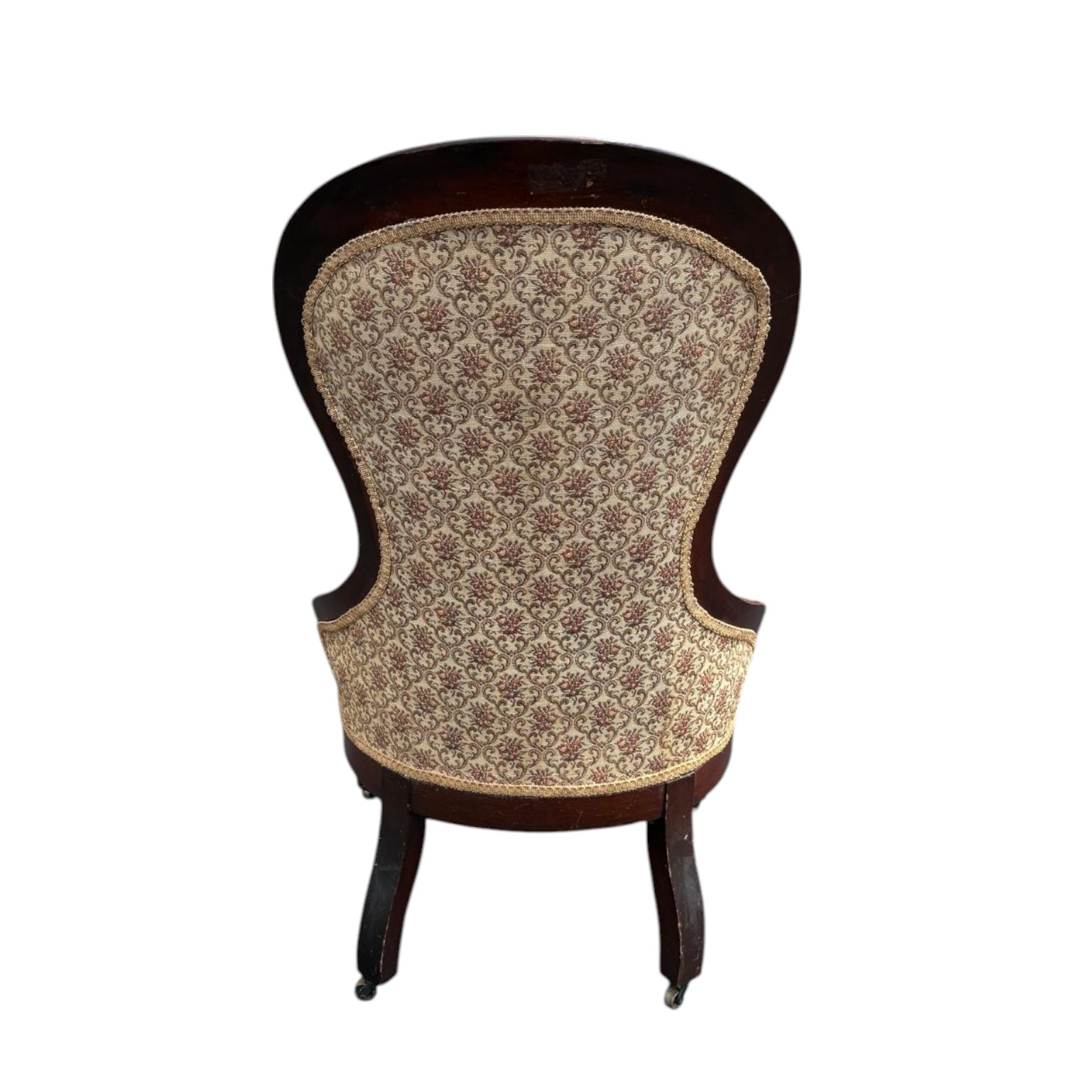 Custom upholstered Victorian chair with a solid wood frame and castors on the two front legs. The upholstery is in excellent condition but the wood frame has some minor scuffs from moving/age.