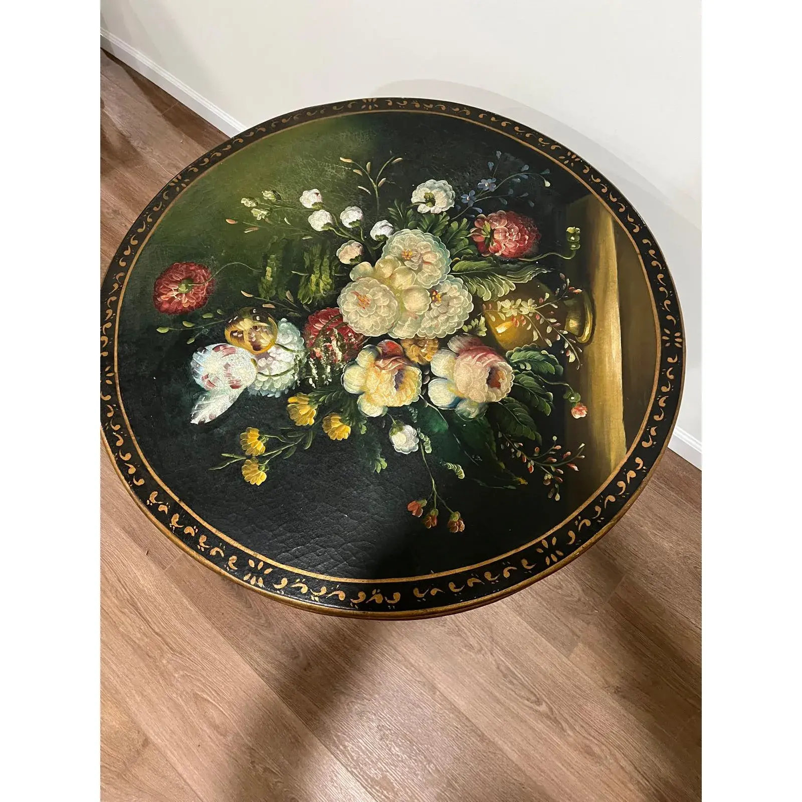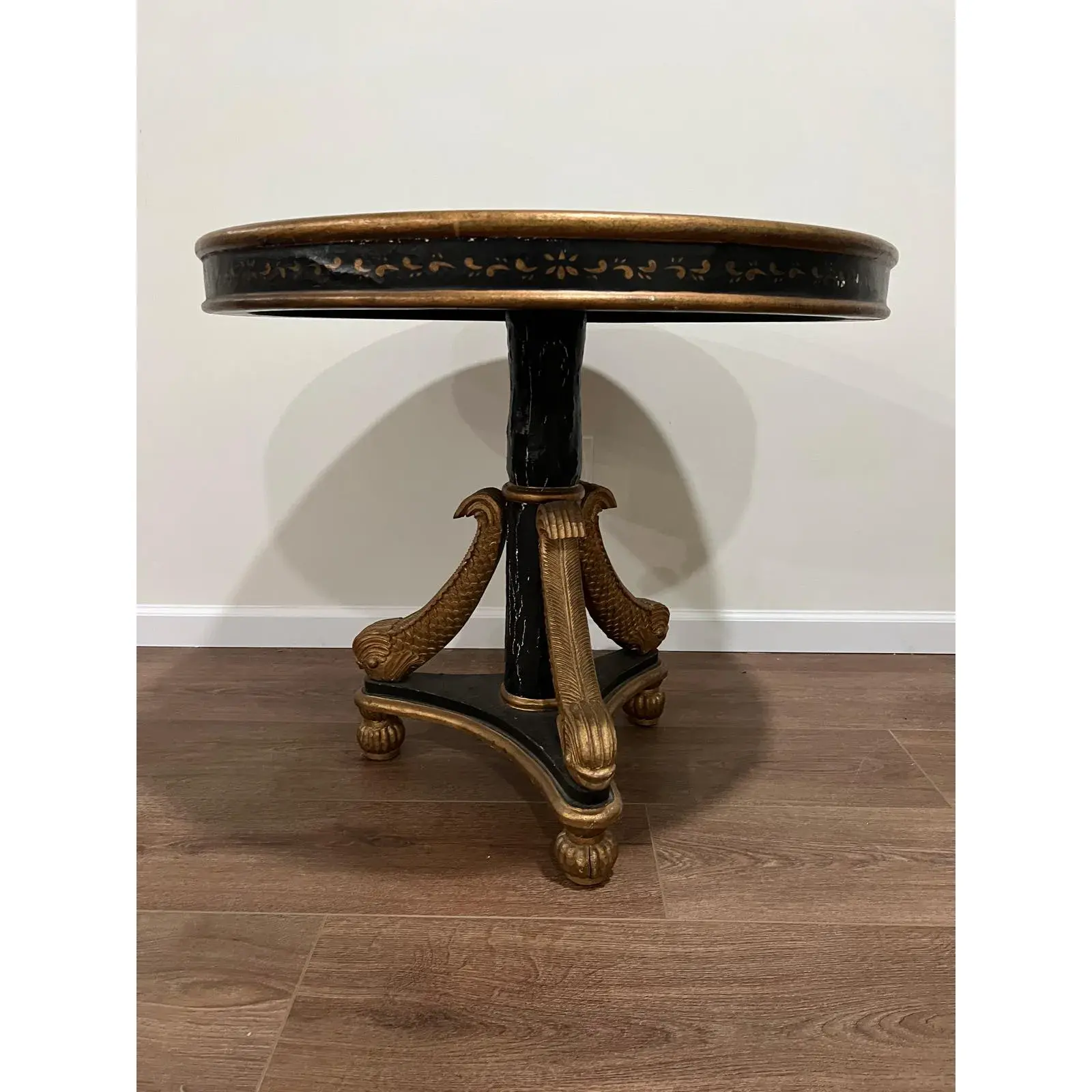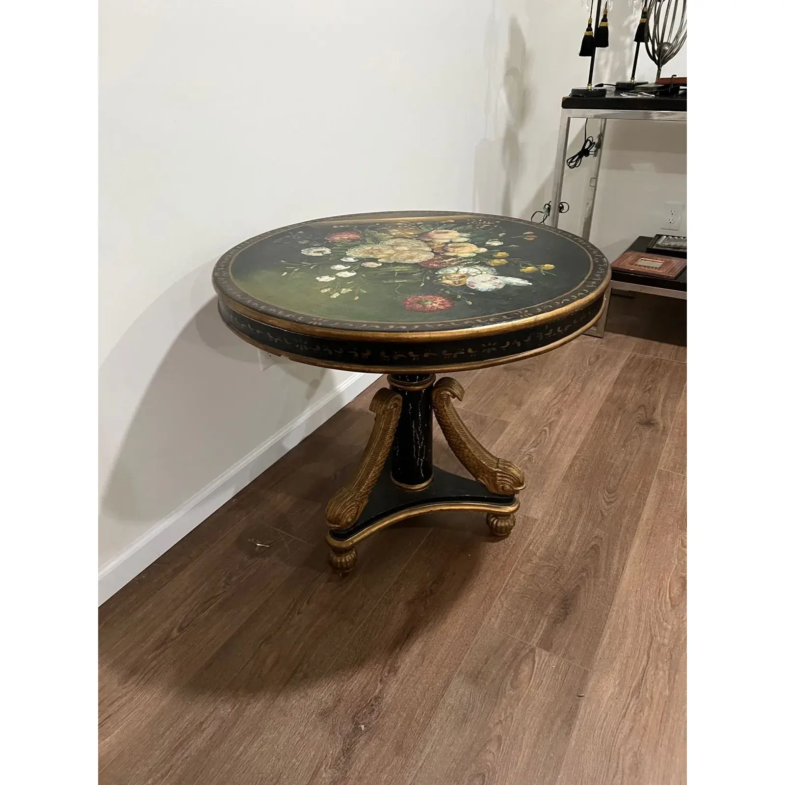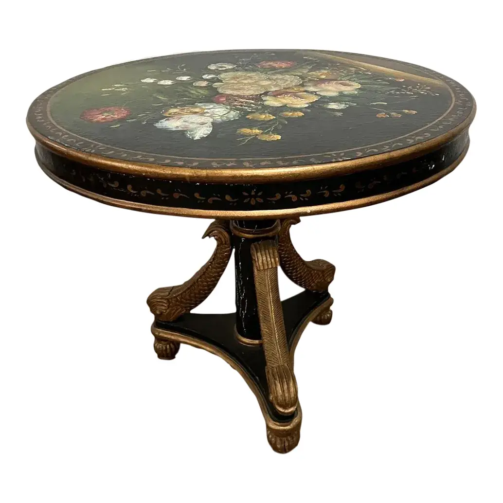 Offering this super antique Regency black paper-mâché over wood pedestal table from 1815. This piece has beautiful hand painted flowers and trims. The base has old gold dolphins. In very good condition, considering the age, but with a few very small marks. This beautiful table has been well cared for for many years.