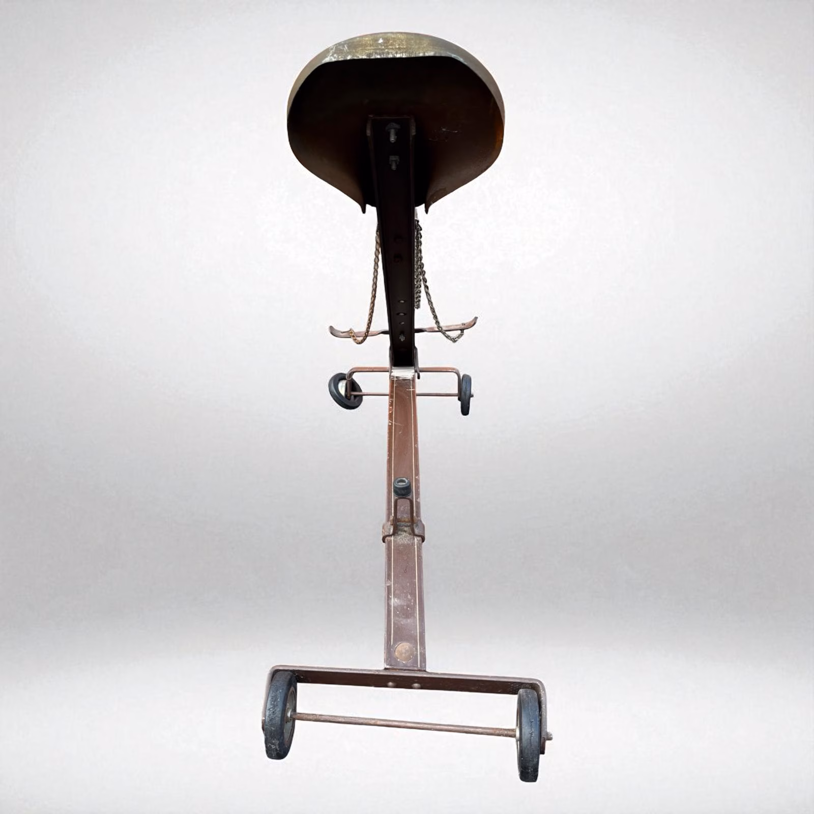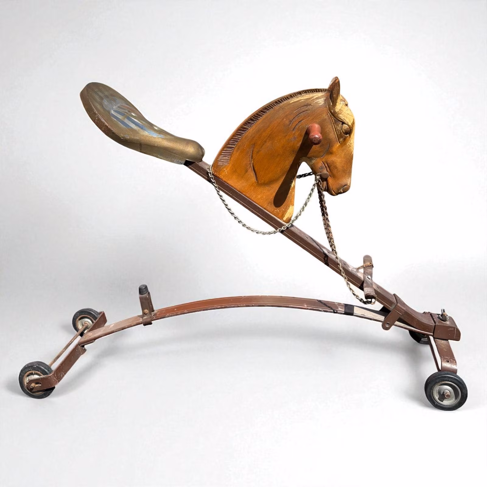 This antique children’s ride-on horse is a rare find, showcasing the beauty of early 20th-century craftsmanship. The toy features a beautifully carved and painted wooden horse head with hand-painted details, complemented by a sturdy curved metal frame and rolling wheels. A vintage metal-style seat sits at the rear, giving it both function and nostalgic appeal. Complete with chain reins and original footrests, this piece captures the spirit of classic childhood play before the age of plastic toys. Its timeworn patina, scuffs, and weathered finish only add to its authentic vintage character, making it a wonderful display piece for collectors of antique toys, equestrian decor, or Americana.