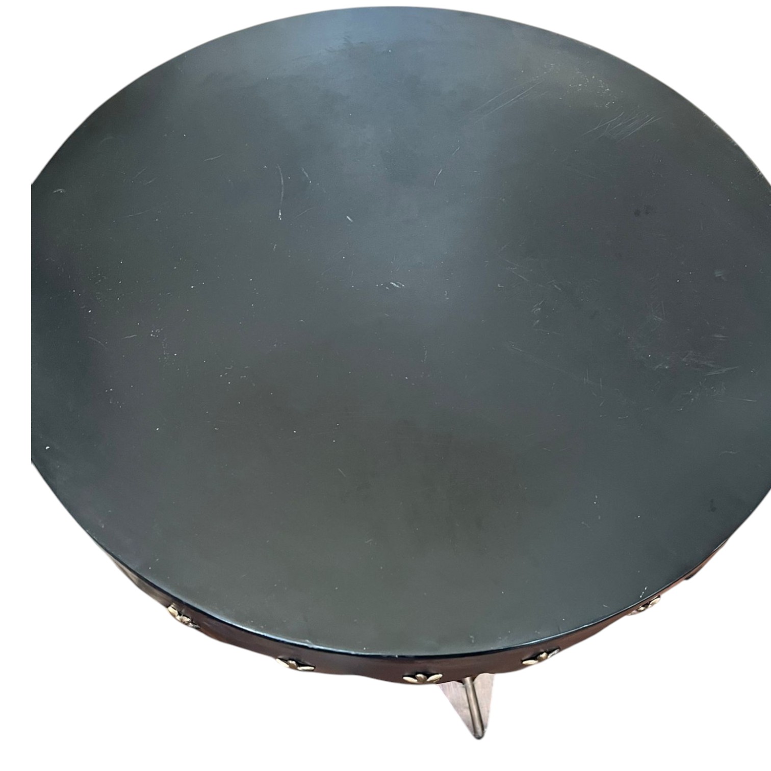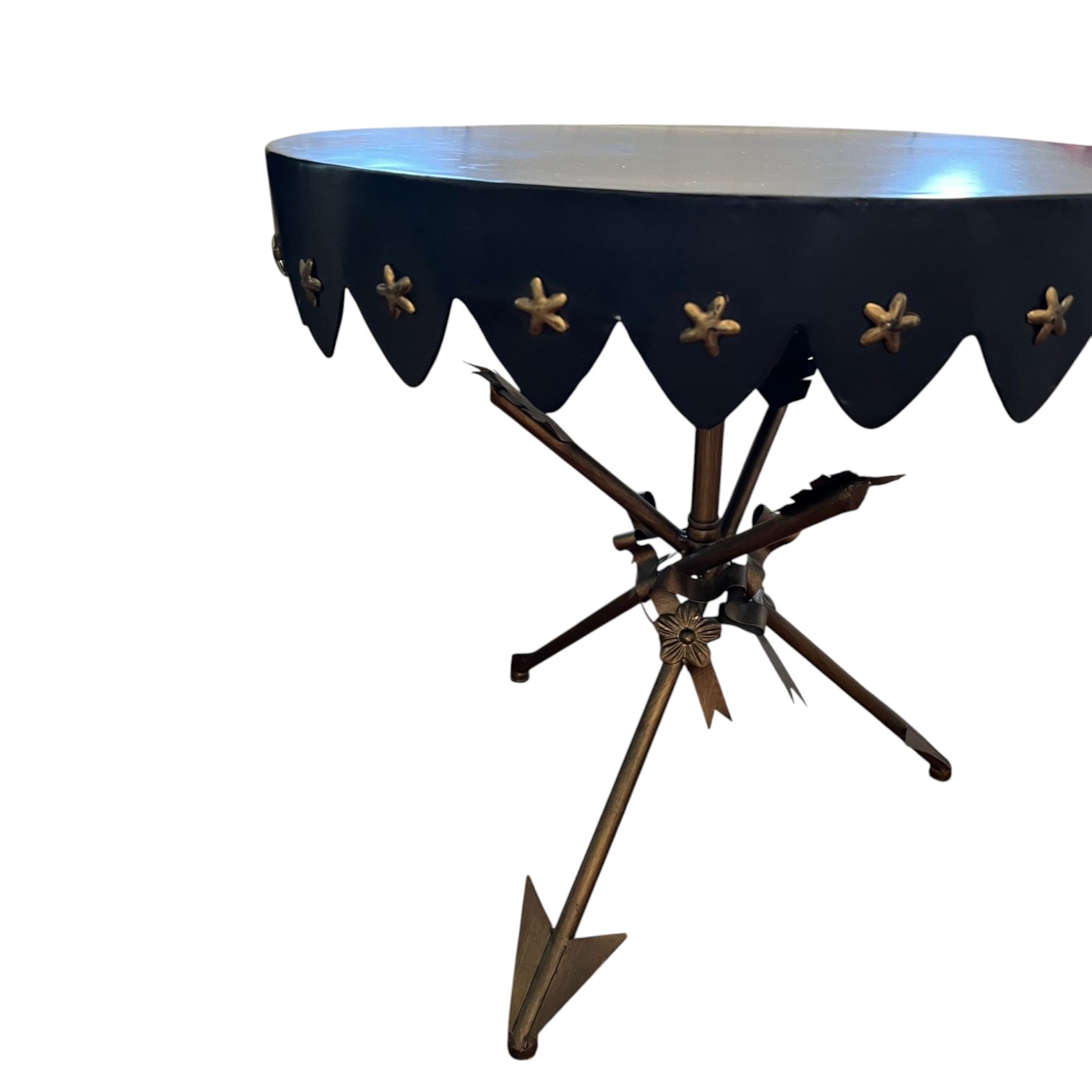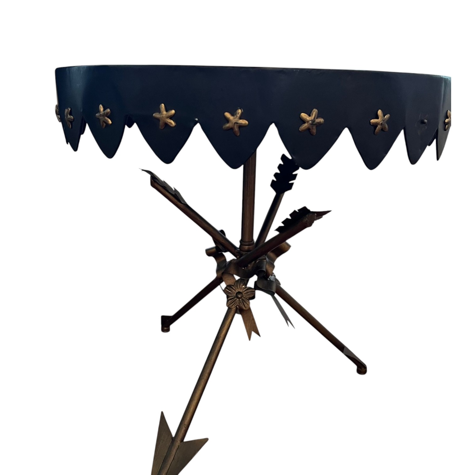 Handcrafted antique Neoclassical crossed arrow side table. The all metal black top has a napkin cut rim decorated with raised stars. The arrow legs are gathered with antiqued brass finished flowers and ribbons. This unusual piece is from the 1920?s and has minimal marks on top for its age and one star is missing.