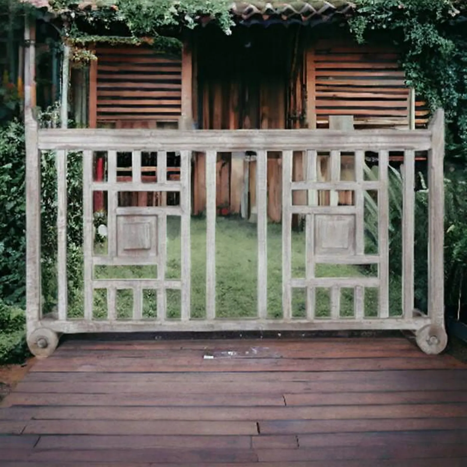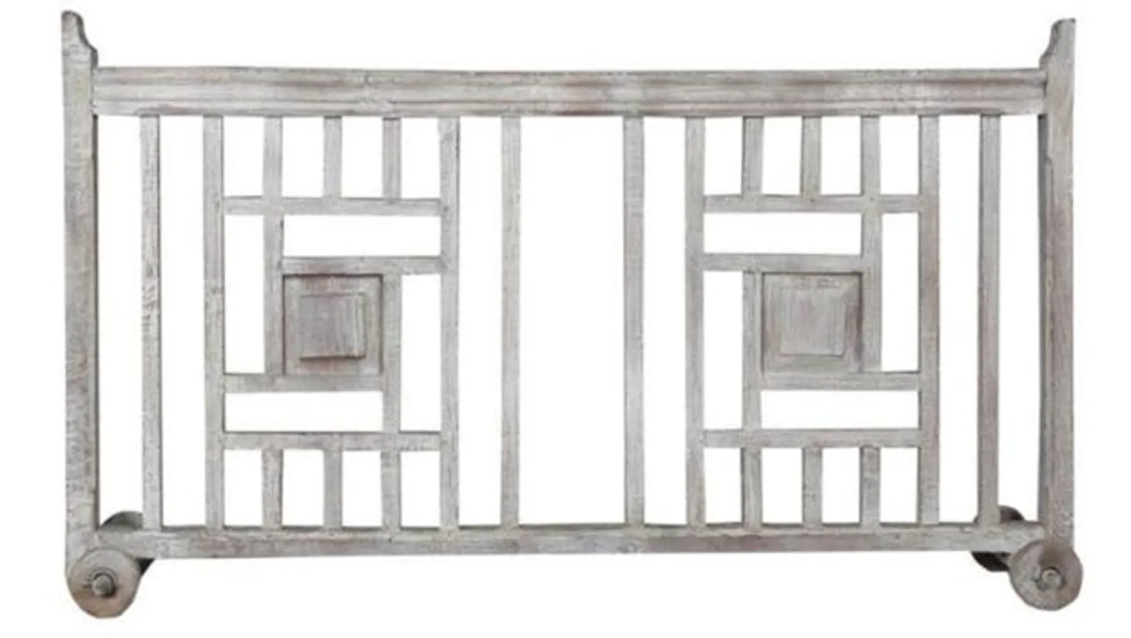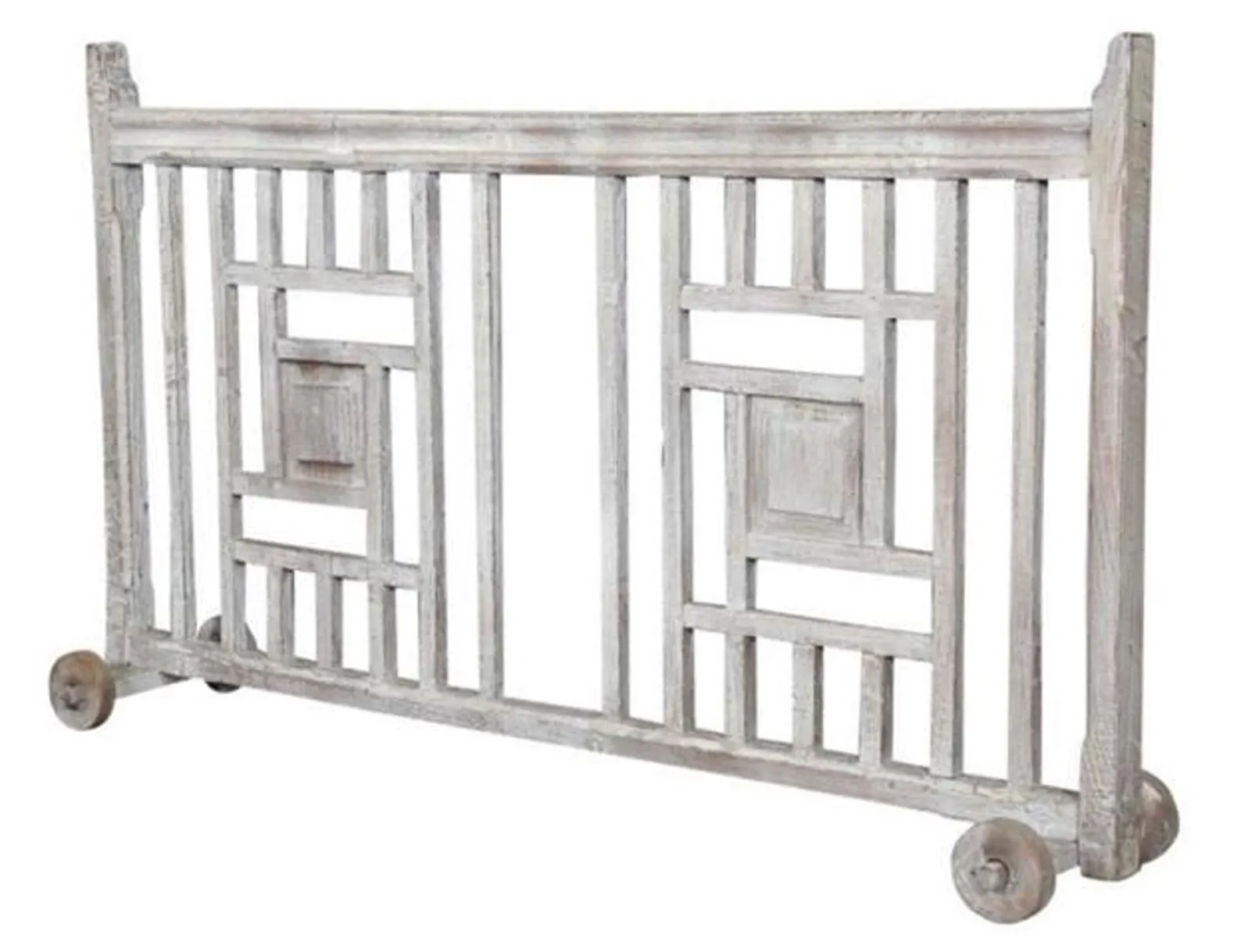 This Beachy Boho tall, narrow room divider is crafted from solid mango wood with a natural weathered finish, perfect for adding rustic charm to indoor or outdoor spaces. Featuring a rolling base and geometric openwork design, it offers a stylish way to define areas without fully closing them off.