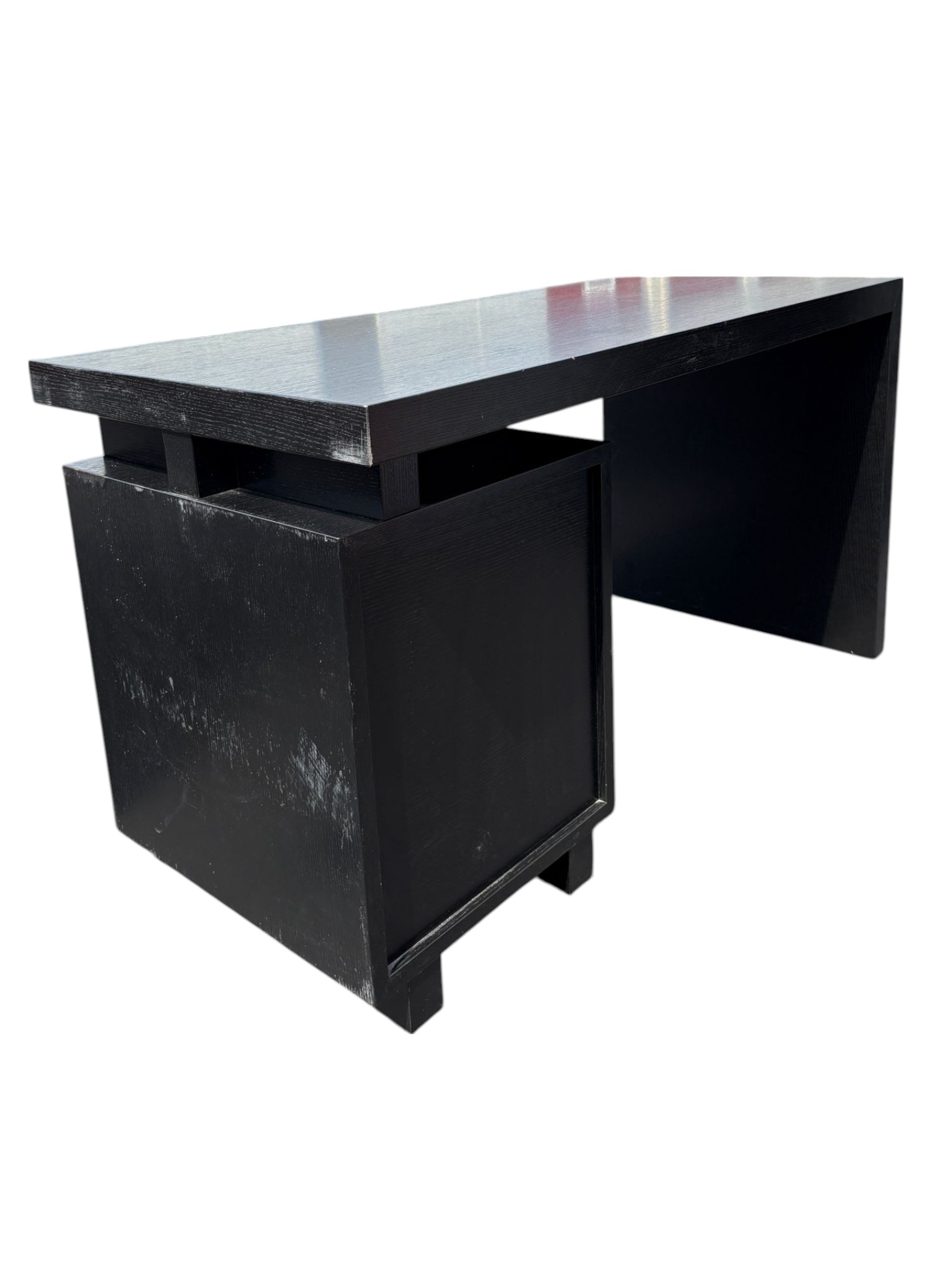If you are looking for a clean modern sleek desk look no further! This black ebonized modern desk has a file drawer and another top drawer for storage. It needs a good polish on both the side. Some scuffs due to moving otherwise in good condition.