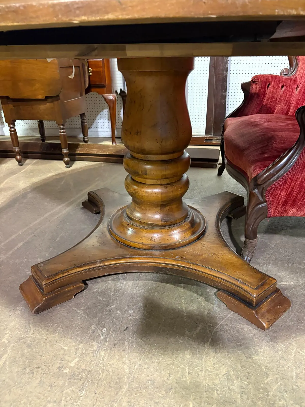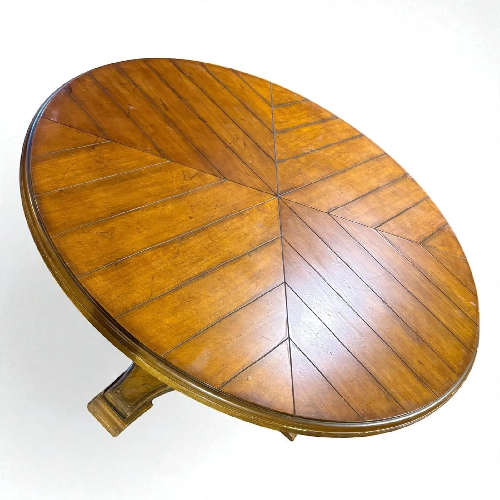 Luxury brand Century Furniture dining table. This table has a striking herringbone parquet patterned walnut veneer top and is set over a solid hardwood base combining the artistry of fine veneer work with the strength and durability of solid construction. The table rests on a substantial sculpted pedestal base with four arched feet. There are minor marks and scratches from use on the edges please see photos. It is a traditional style.