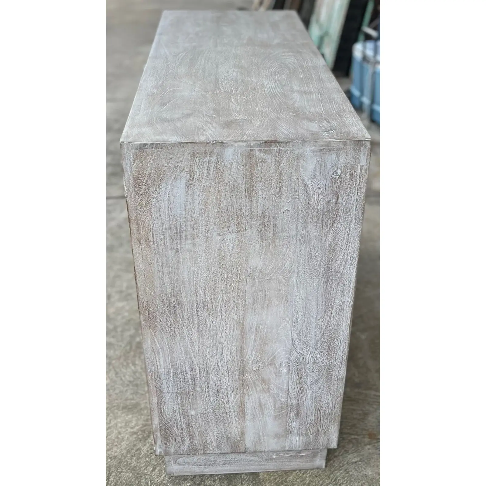 This Coastal Boho cabinet features carved fretwork glass doors and a whitewashed driftwood finish, perfect as a small entryway console, bedroom, or living room storage.