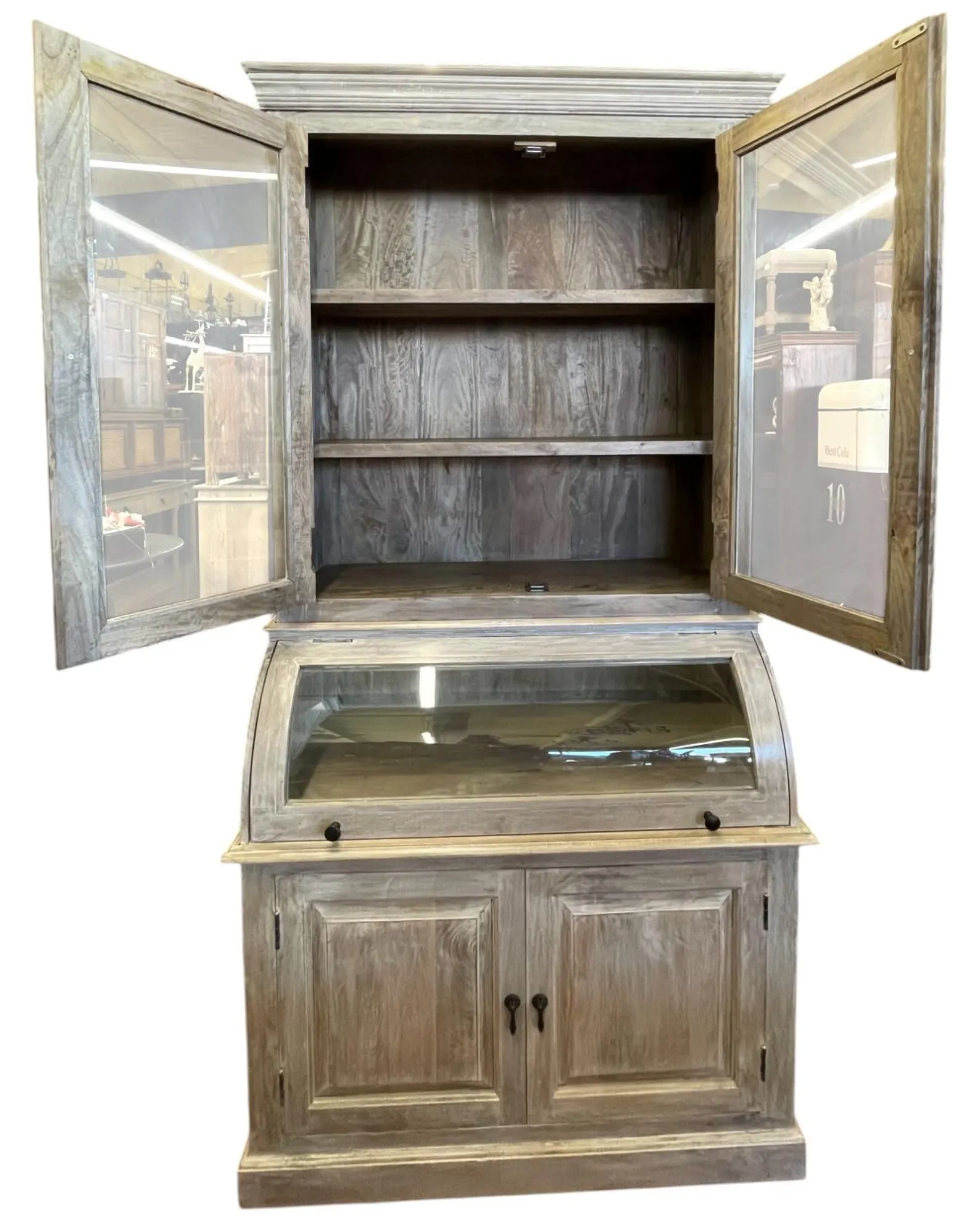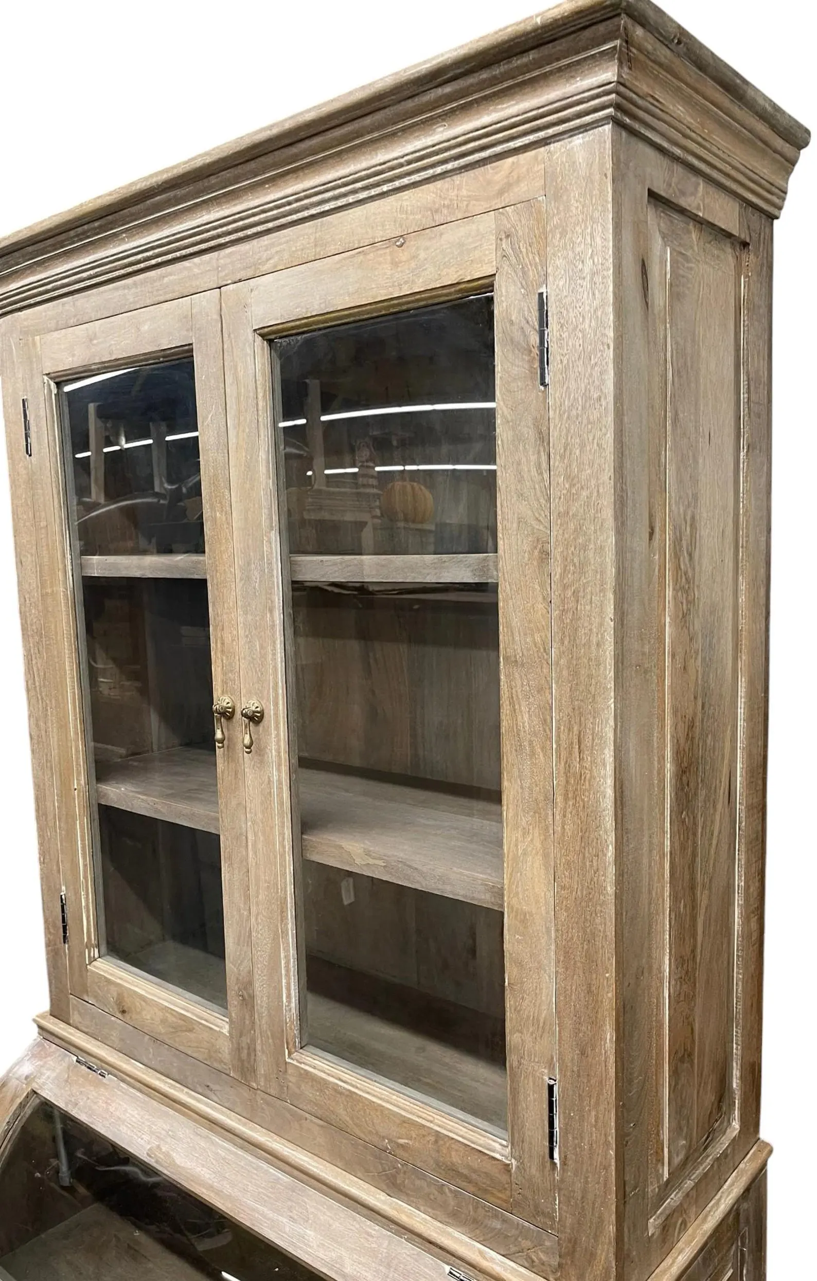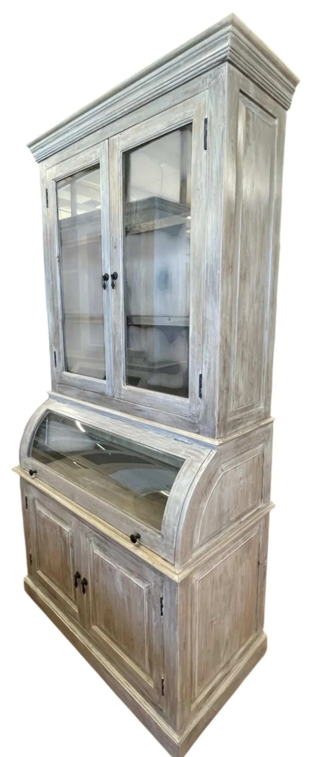 This Coastal Cottage kitchen pantry features a single roll curved glass bread cabinet and a tall glass door, functioning as a kitchen cupboard or storage hutch with a driftwood finish.