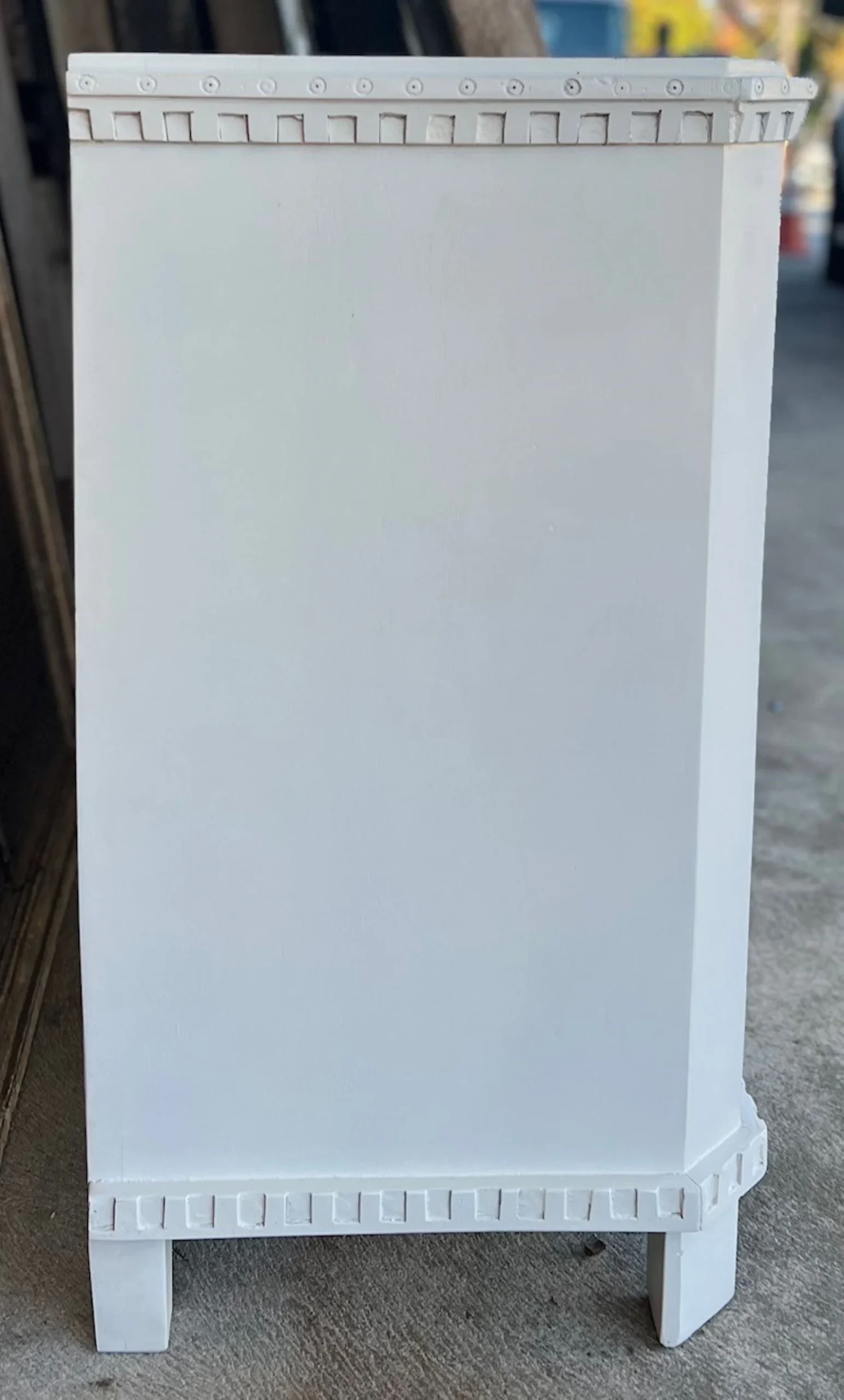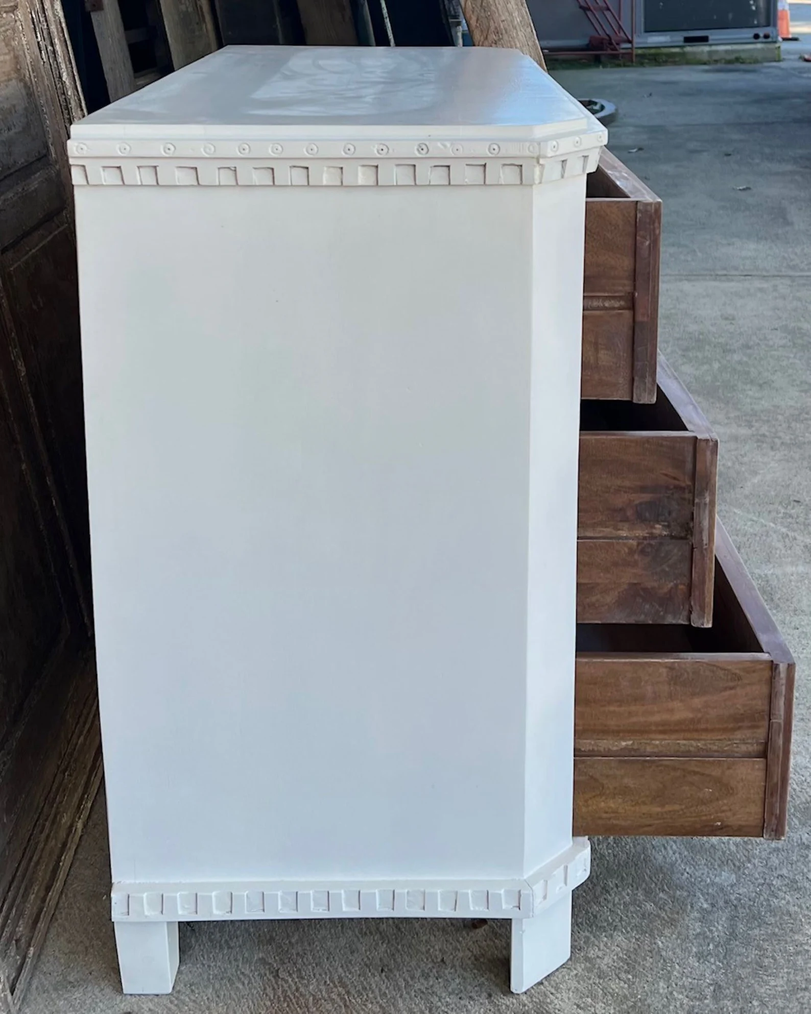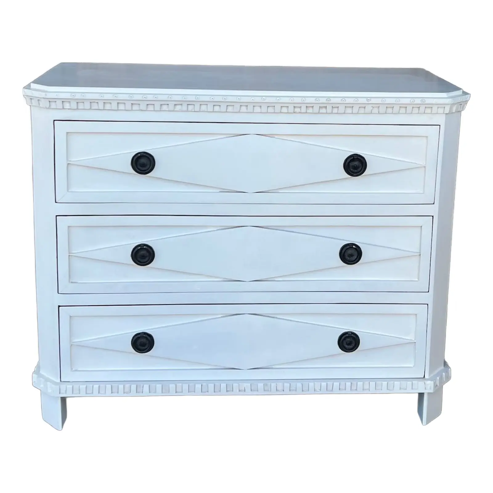 This Coastal Beach Marquise Diamond bachelor’s chest features three oversized drawers and is crafted from mango wood with a white finish, perfect as a dresser or nightstand.