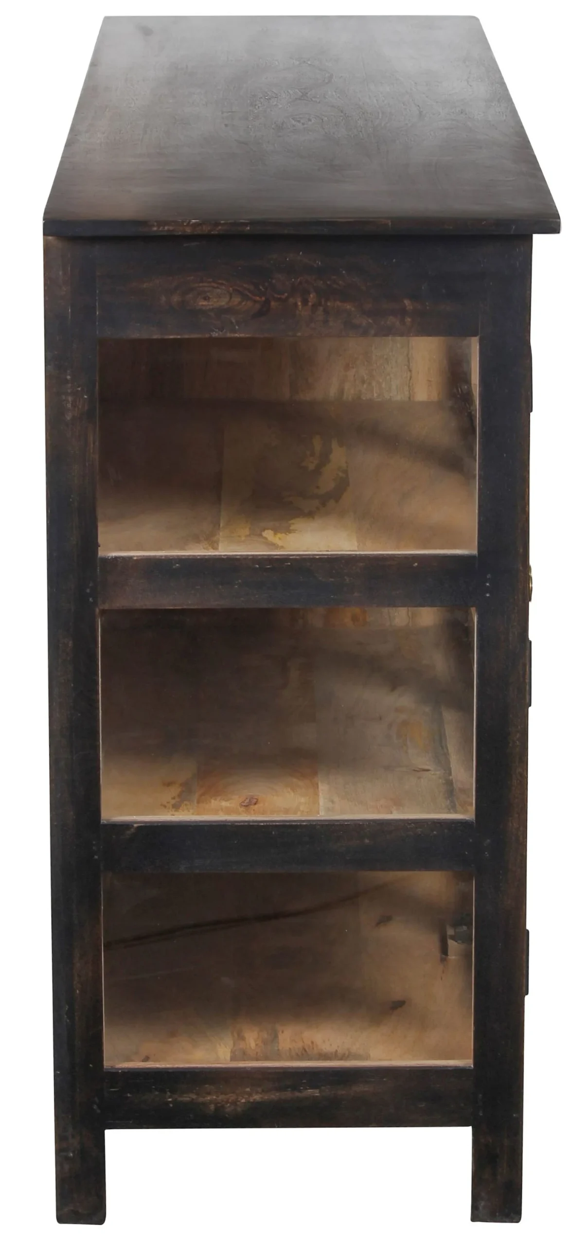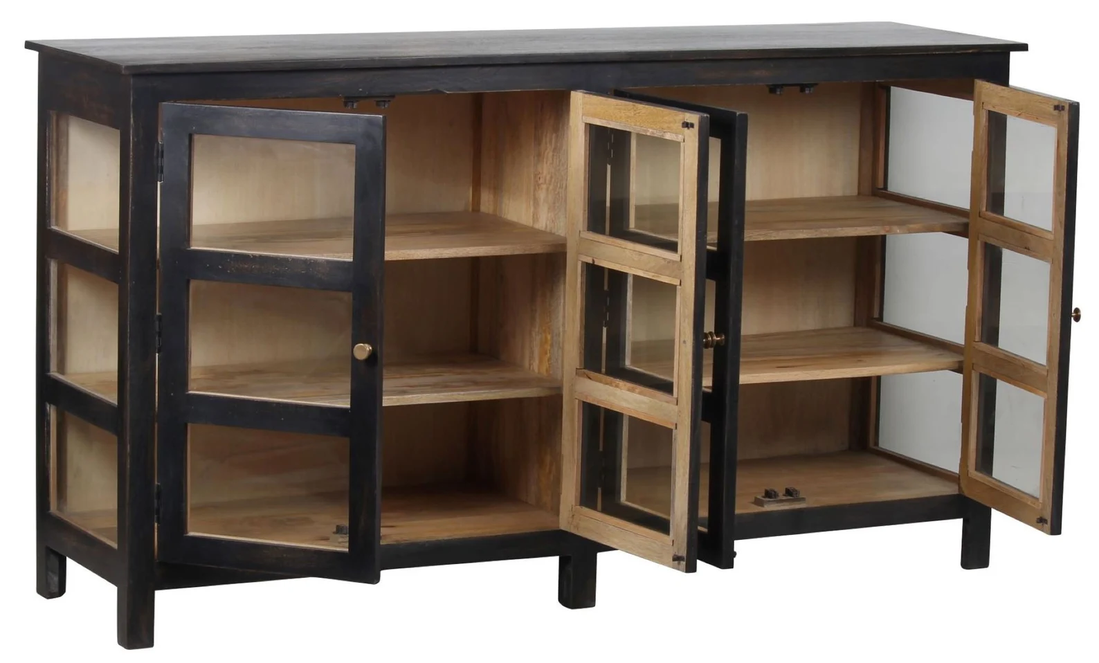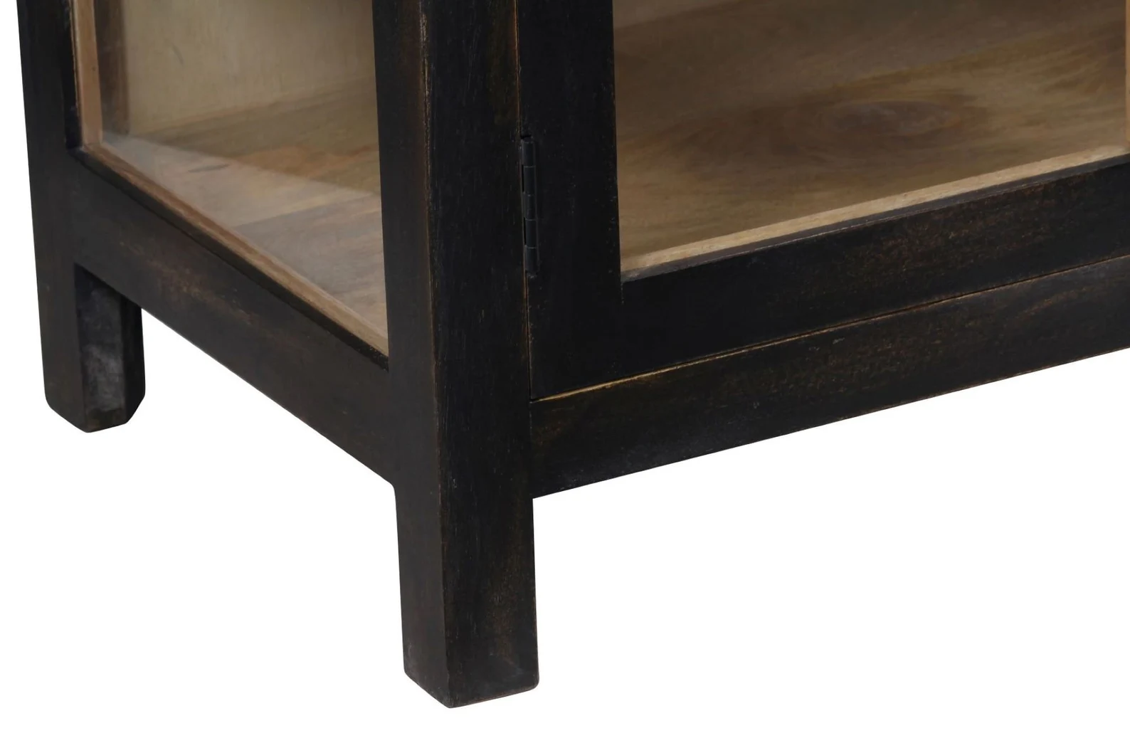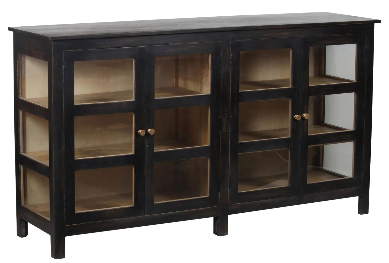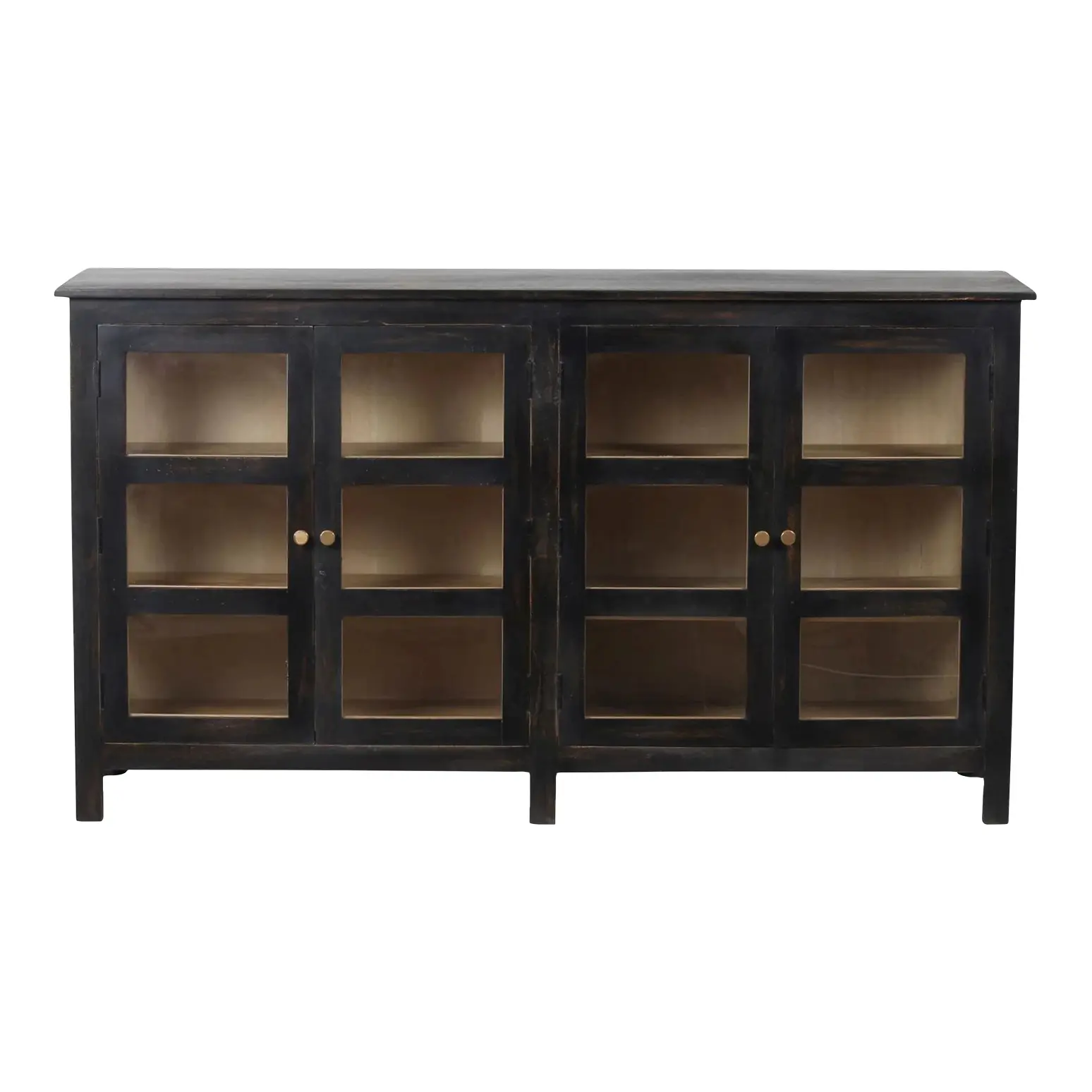 This contemporary Coastal showcase cabinet features a black finish and is a narrow credenza crafted from solid wood with a glass door, functioning as an entryway console, curio, china display, buffet, or sideboard.