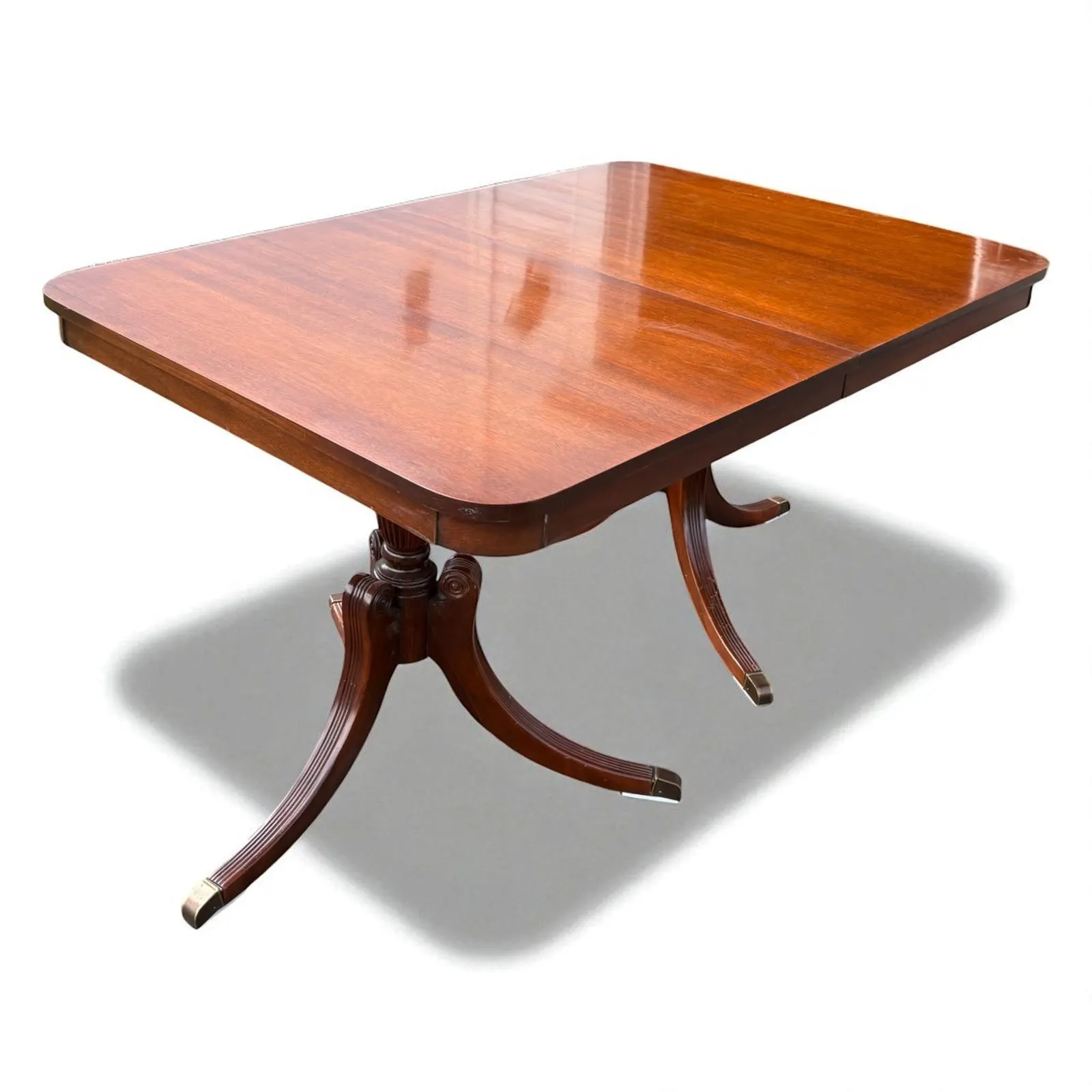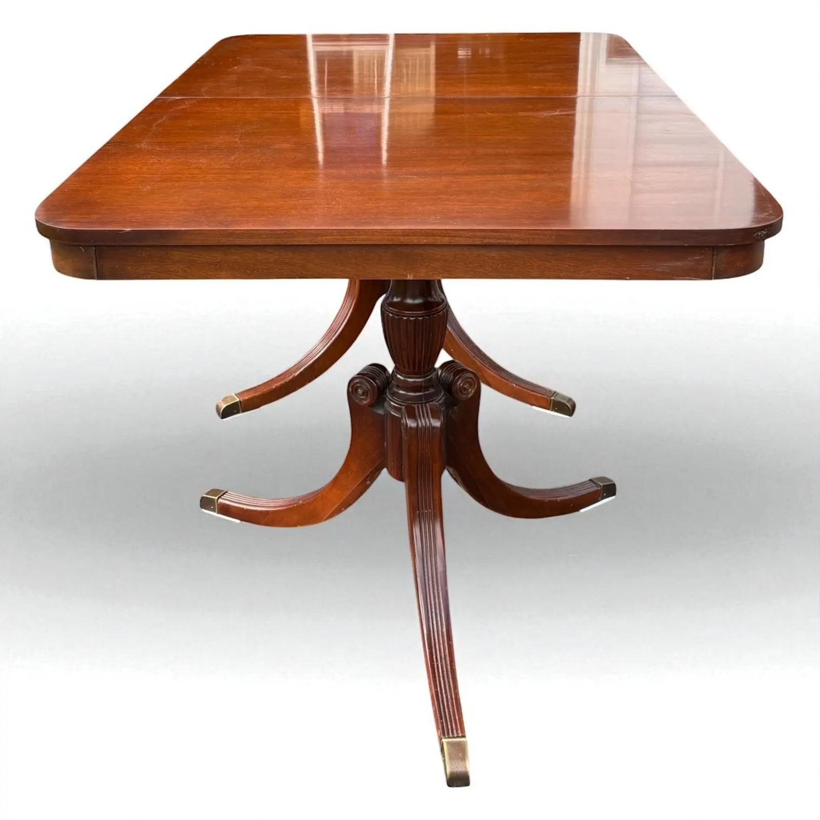 A timeless dining set that blends classic craftsmanship with a touch of custom flair. The rectangular wood table rests on twin pedestal bases with elegantly curved legs each ending in brass capped feet for a refined finish. Its rich polished surface provides a warm and inviting centerpiece for family meals. Four chairs have been custom upholstered and are in good condition. Table has a few marks on it consistent with age and use.