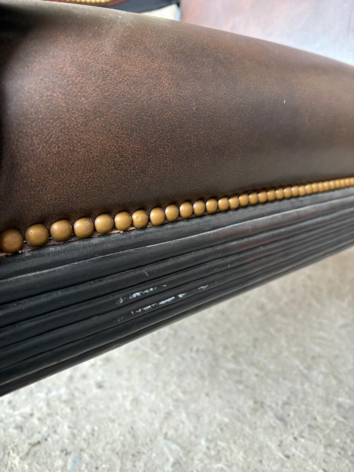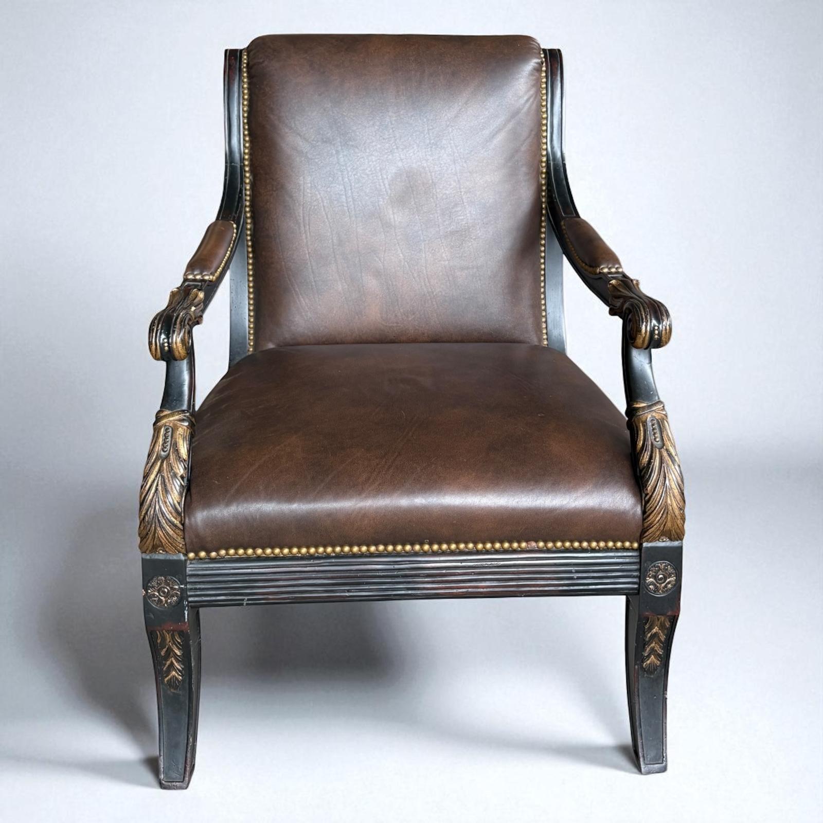 This striking Empire-style armchair combines timeless sophistication with old-world craftsmanship. Upholstered in supple brown leather, the seat and back offer both comfort and refined elegance. The frame is crafted from solid wood, finished in rich black lacquer with hand-carved accents highlighted in gold. Please look carefully at the photos this chair does have a few marks on the legs and frame from use & age. The upholstery is in great condition!