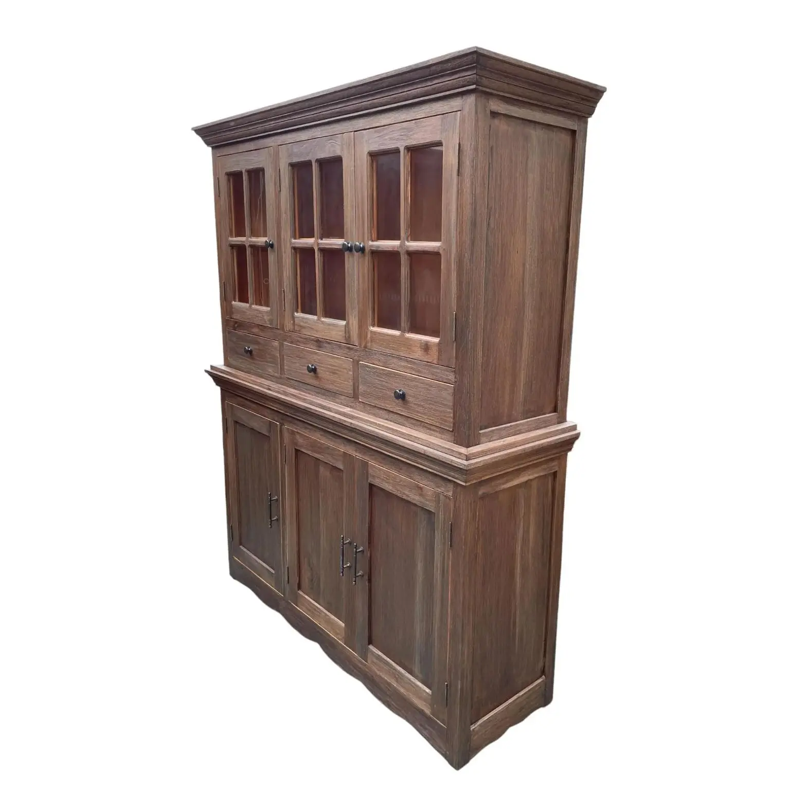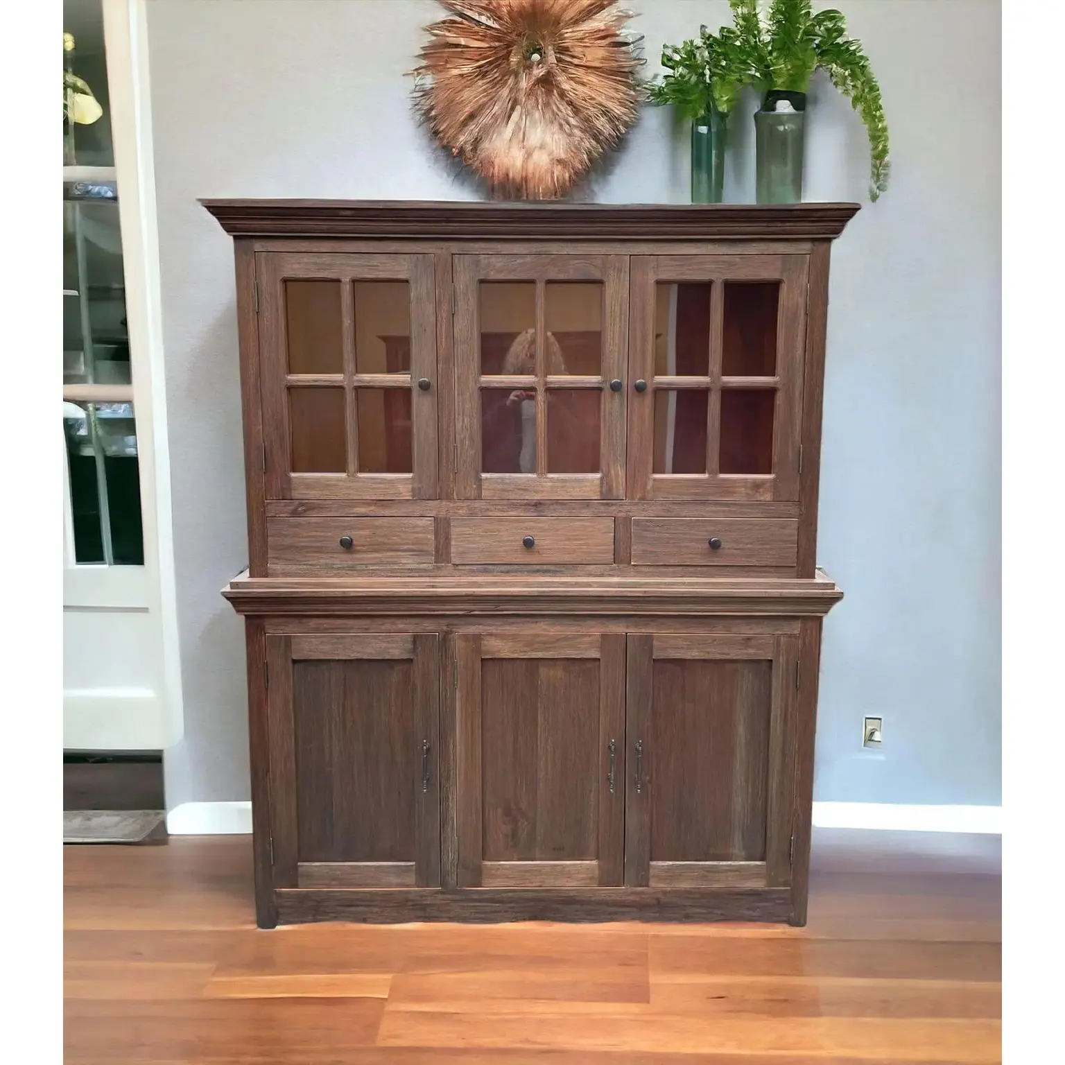 This Modern Farmhouse kitchen cabinet cupboard is crafted from tall rustic dark natural solid wood, featuring a 2-piece glass door hutch with six doors and three drawers, perfect for a dining room.