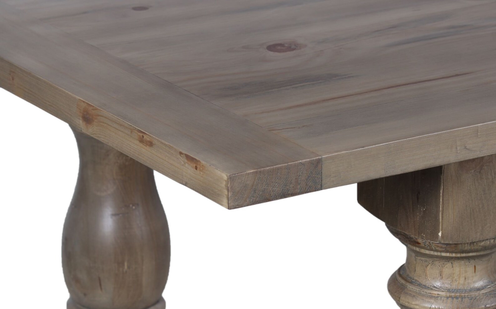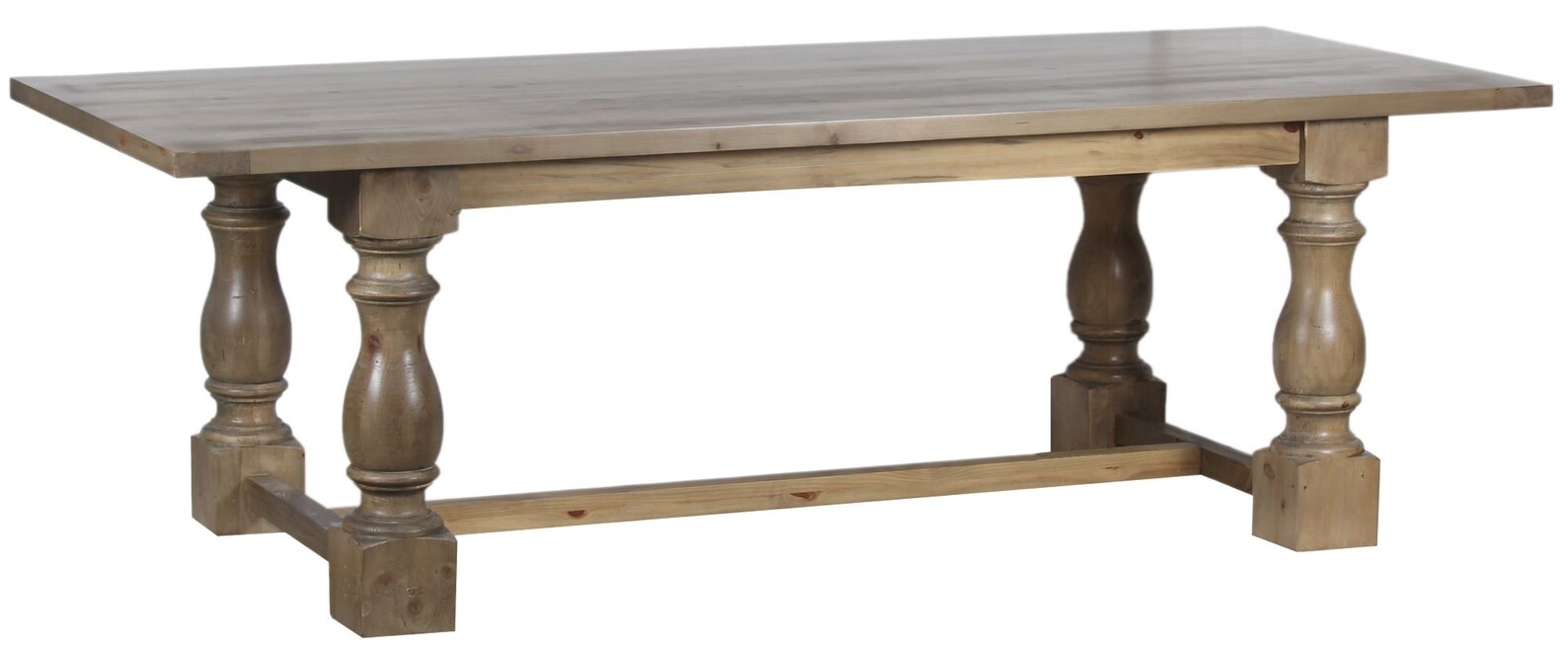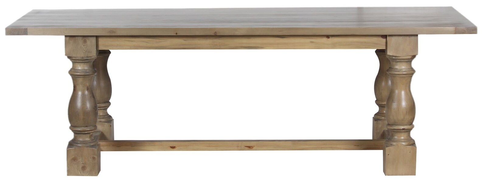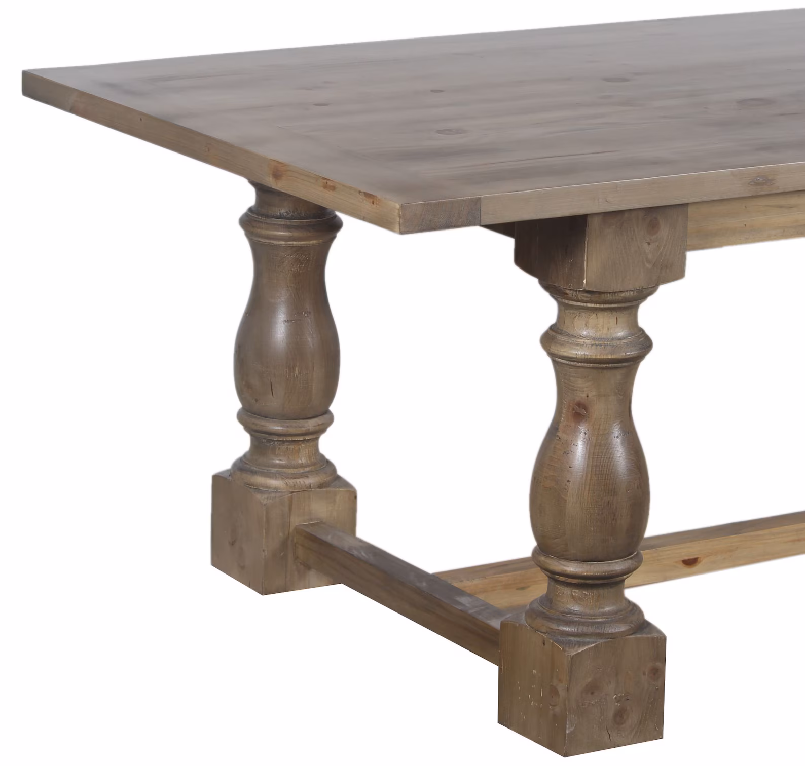 This 7’8″ oversized New Zealand Pine rectangular trestle dining table features chunky legs and a natural finish, offering a farmhouse style family-size table that seats 8.