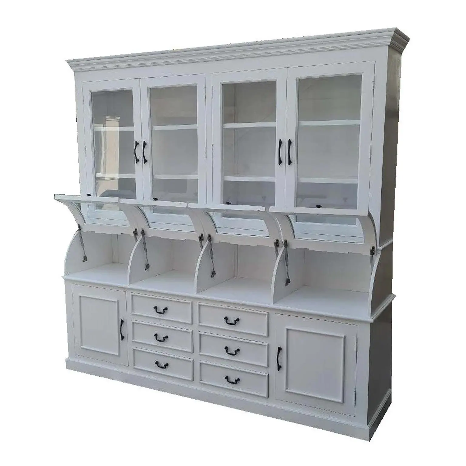 This Modern Farmhouse large kitchen pantry cupboard is crafted from solid wood with a white finish, featuring a 2-piece glass door china display hutch with curved glass and a bread roll cabinet.