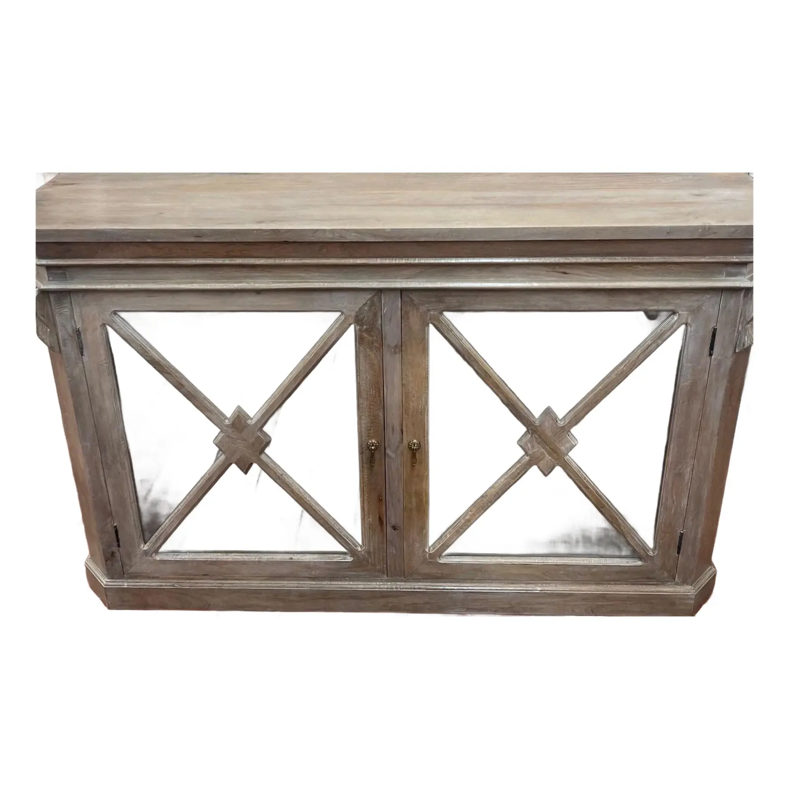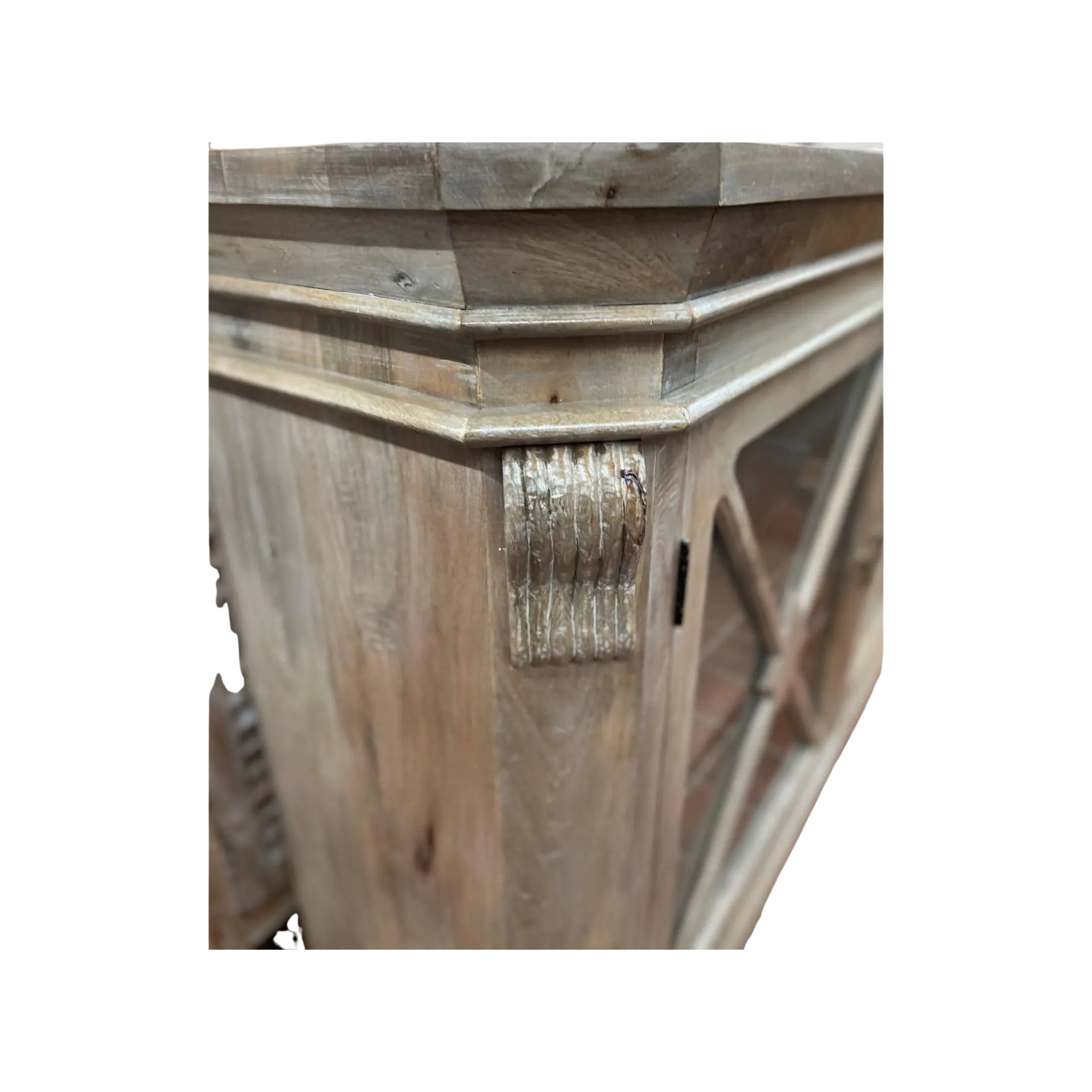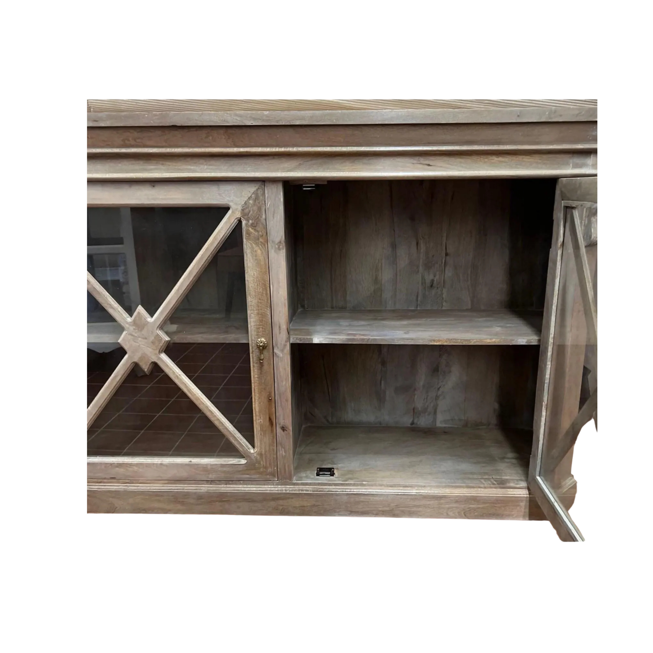This French Country Farmhouse credenza is a medium-sized piece crafted from solid mango wood with glass doors and a driftwood finish, functioning as a buffet server, entryway console, or display cabinet.