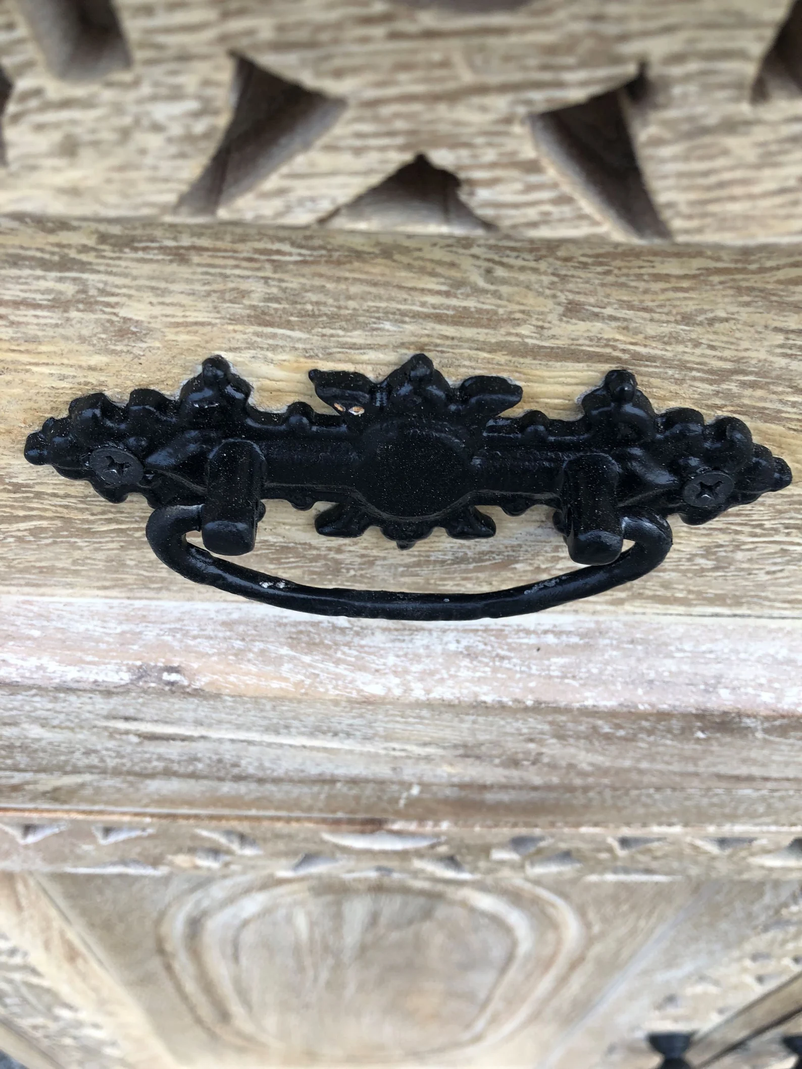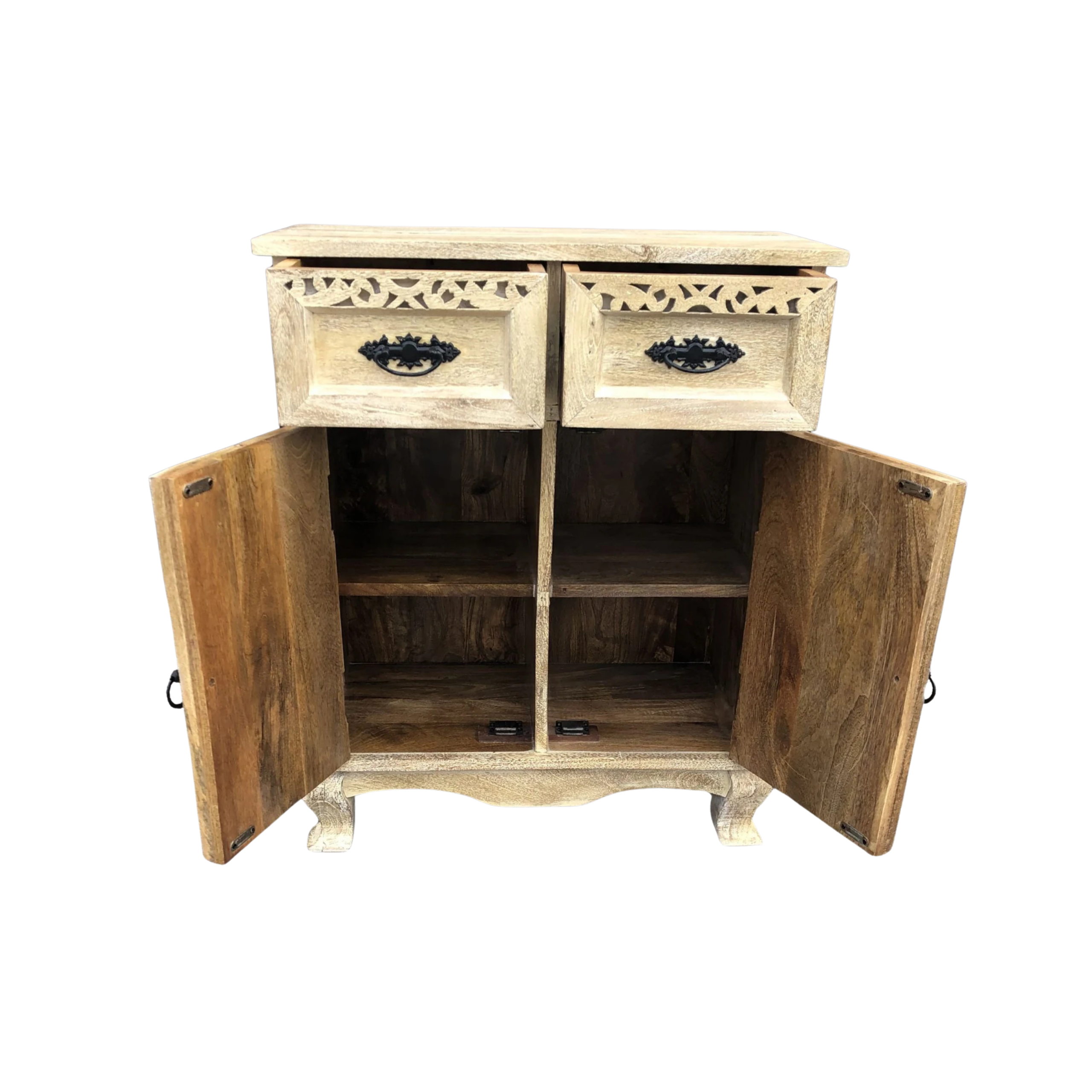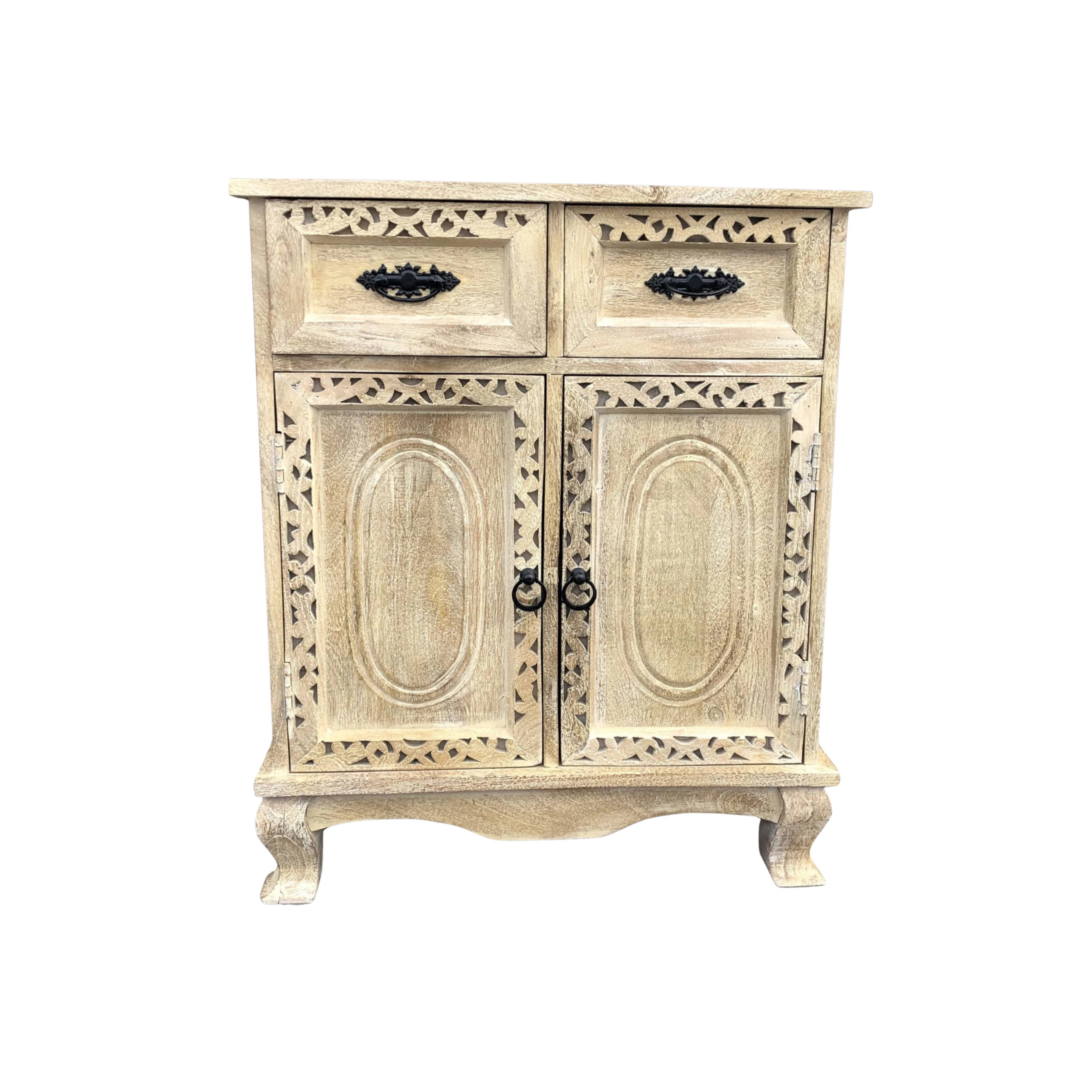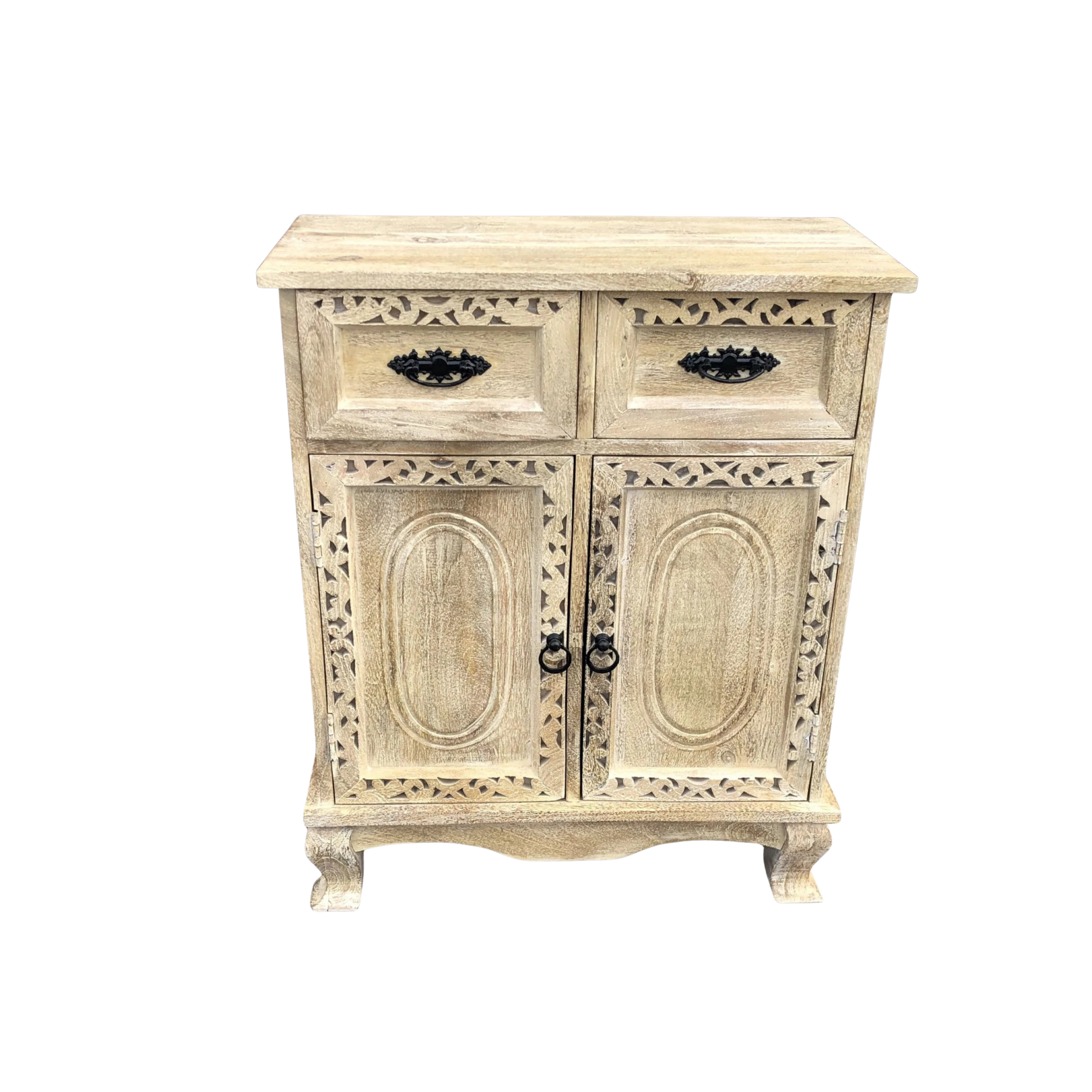 This French Country entryway accent cabinet features two doors and two drawers, crafted from carved solid wood, perfect for extra bedroom or bathroom linen storage, or as a dining buffet.