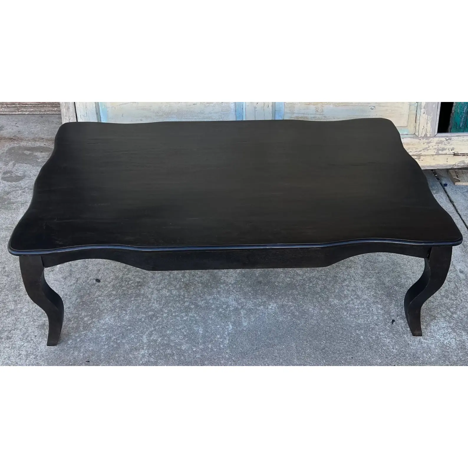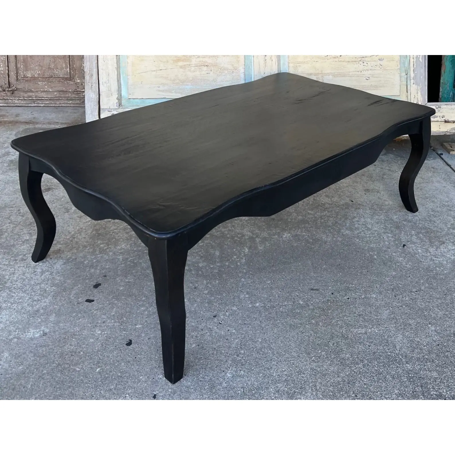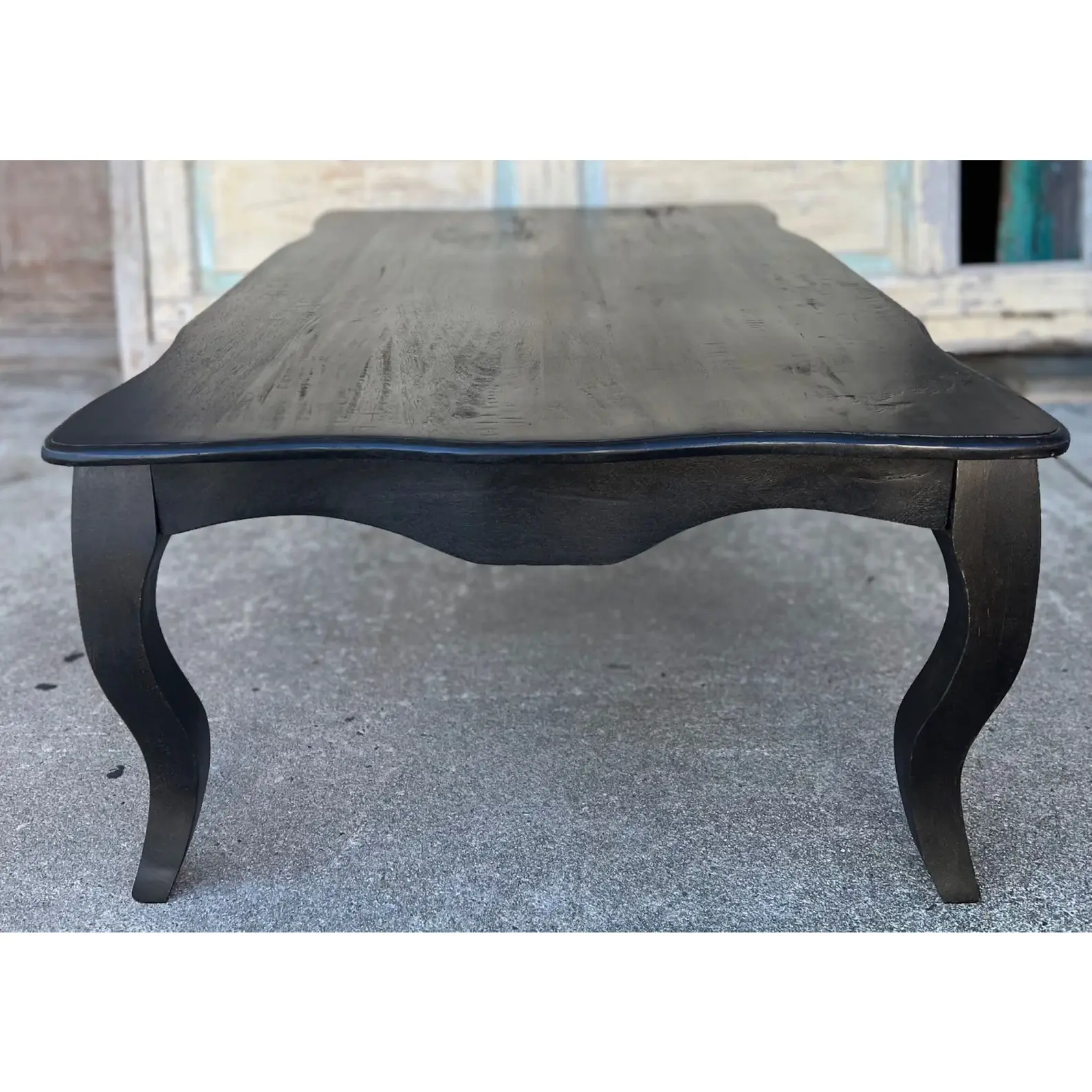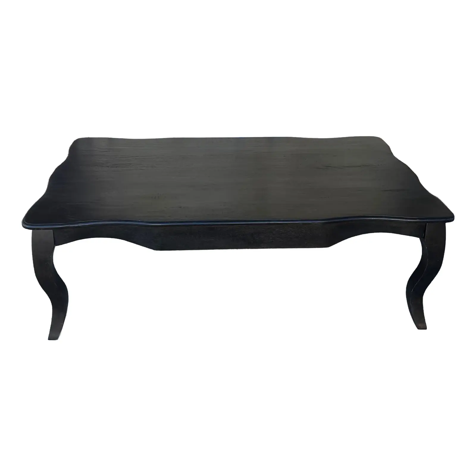 This French Provincial rectangular coffee table is crafted from carved reclaimed solid wood with a black finish, perfect for a living room.
