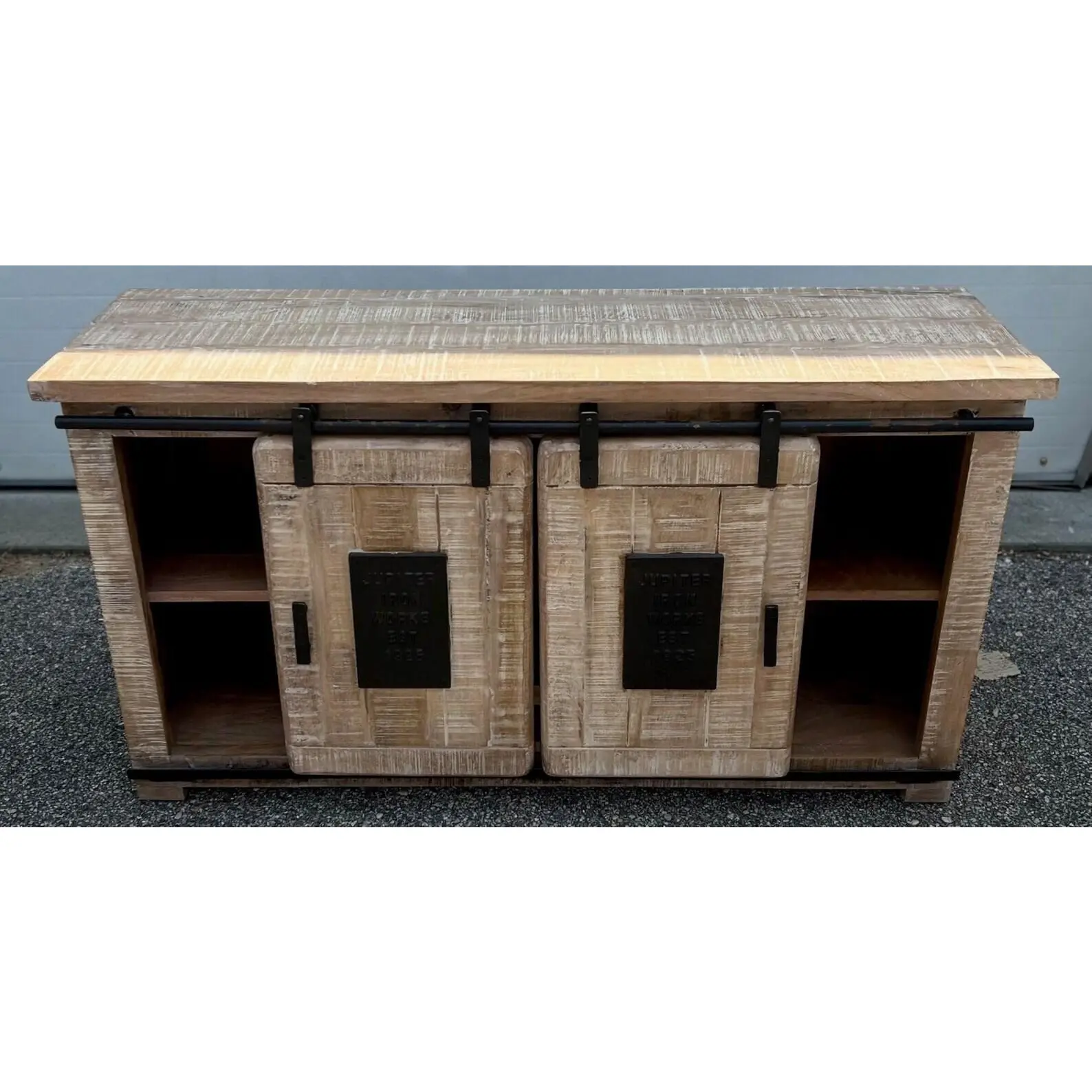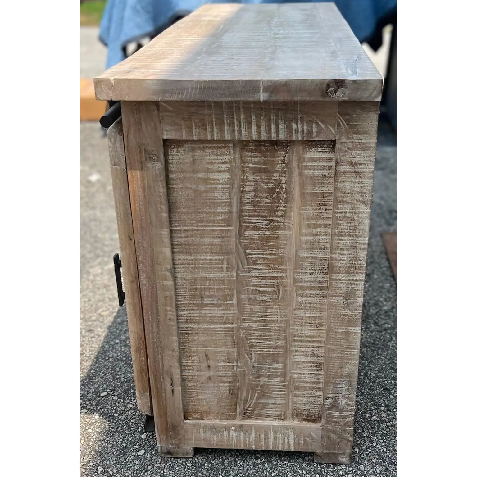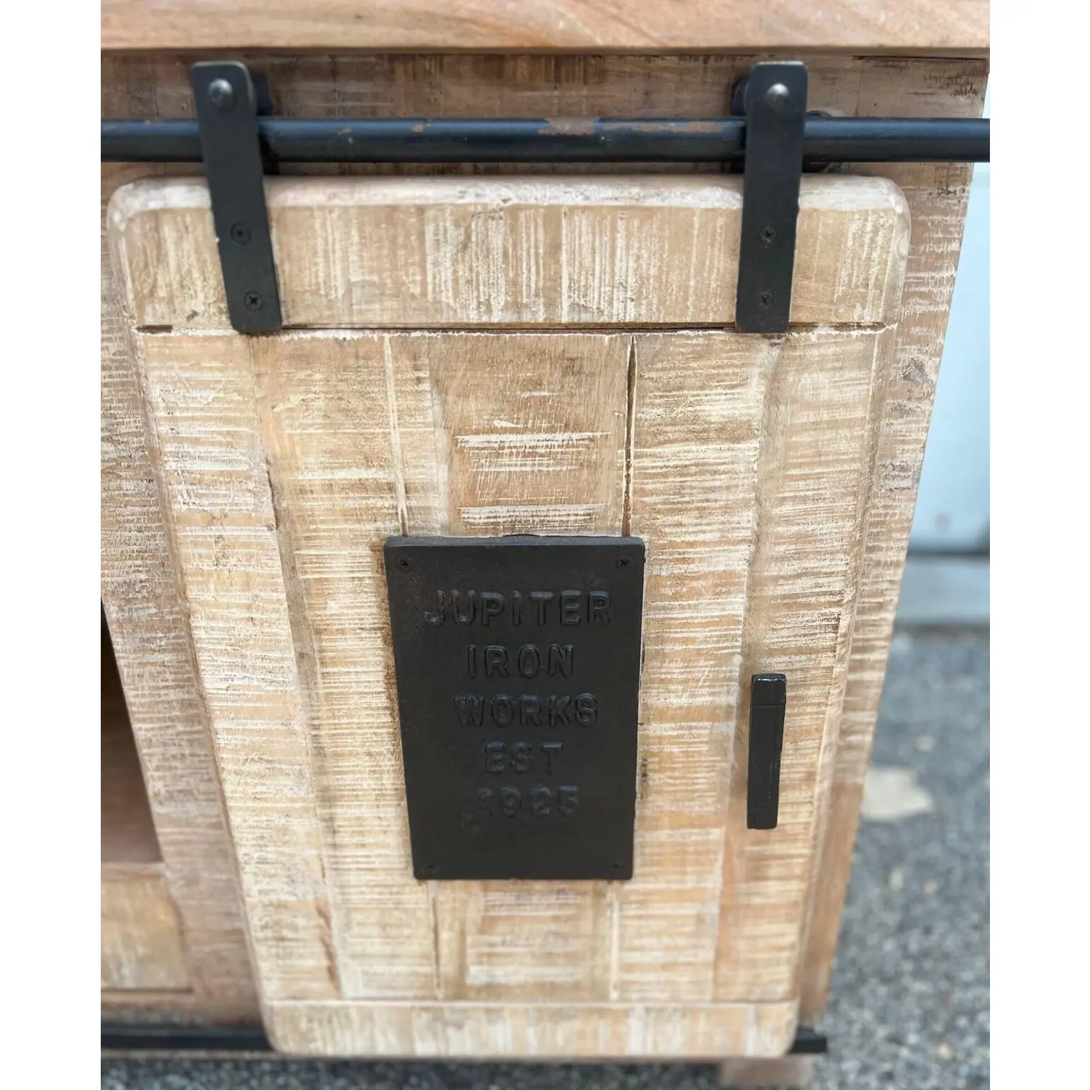 This industrial Jupiter media cabinet features an iron sliding door and solid wood construction, offering a narrow open shelf rustic design with a lime wash finish.