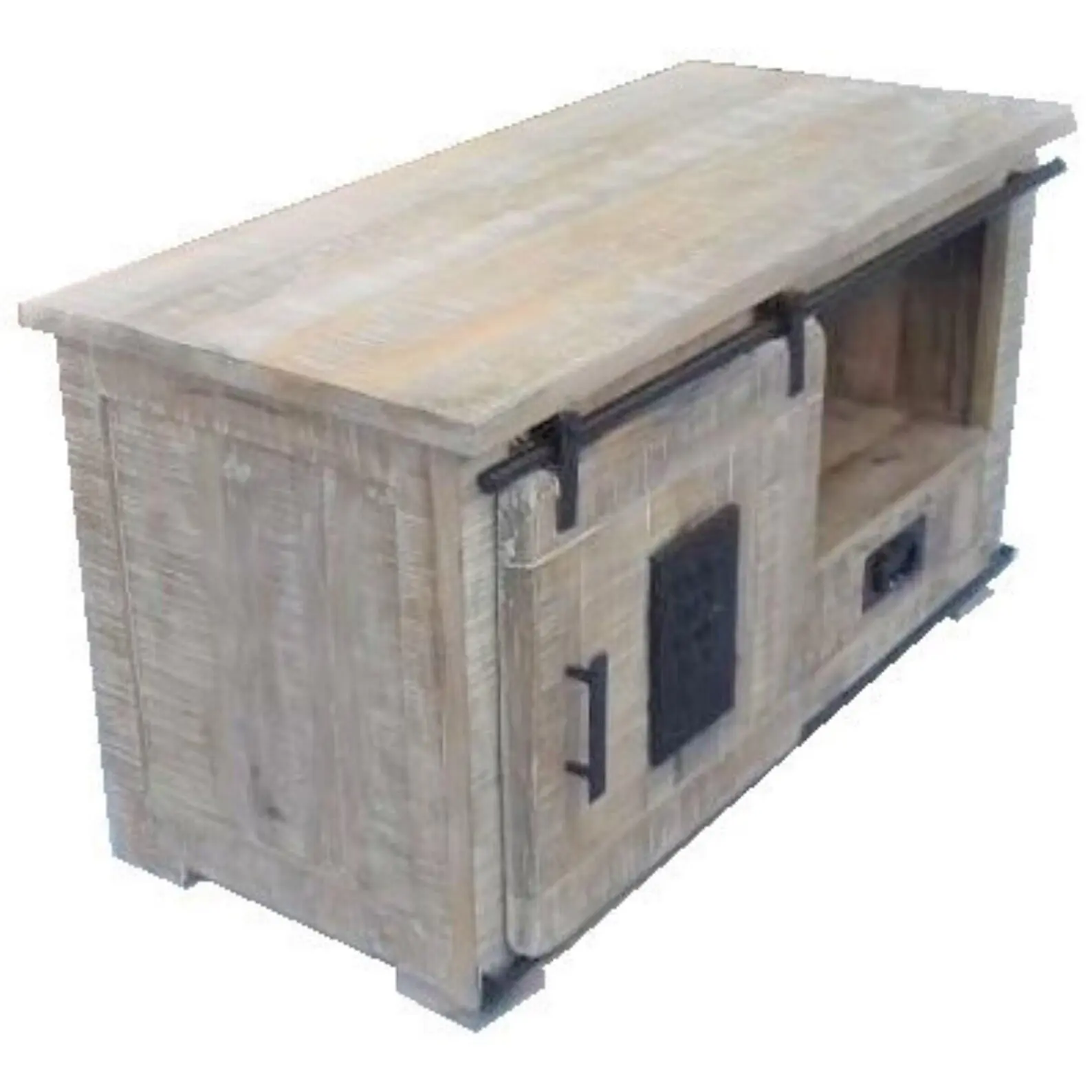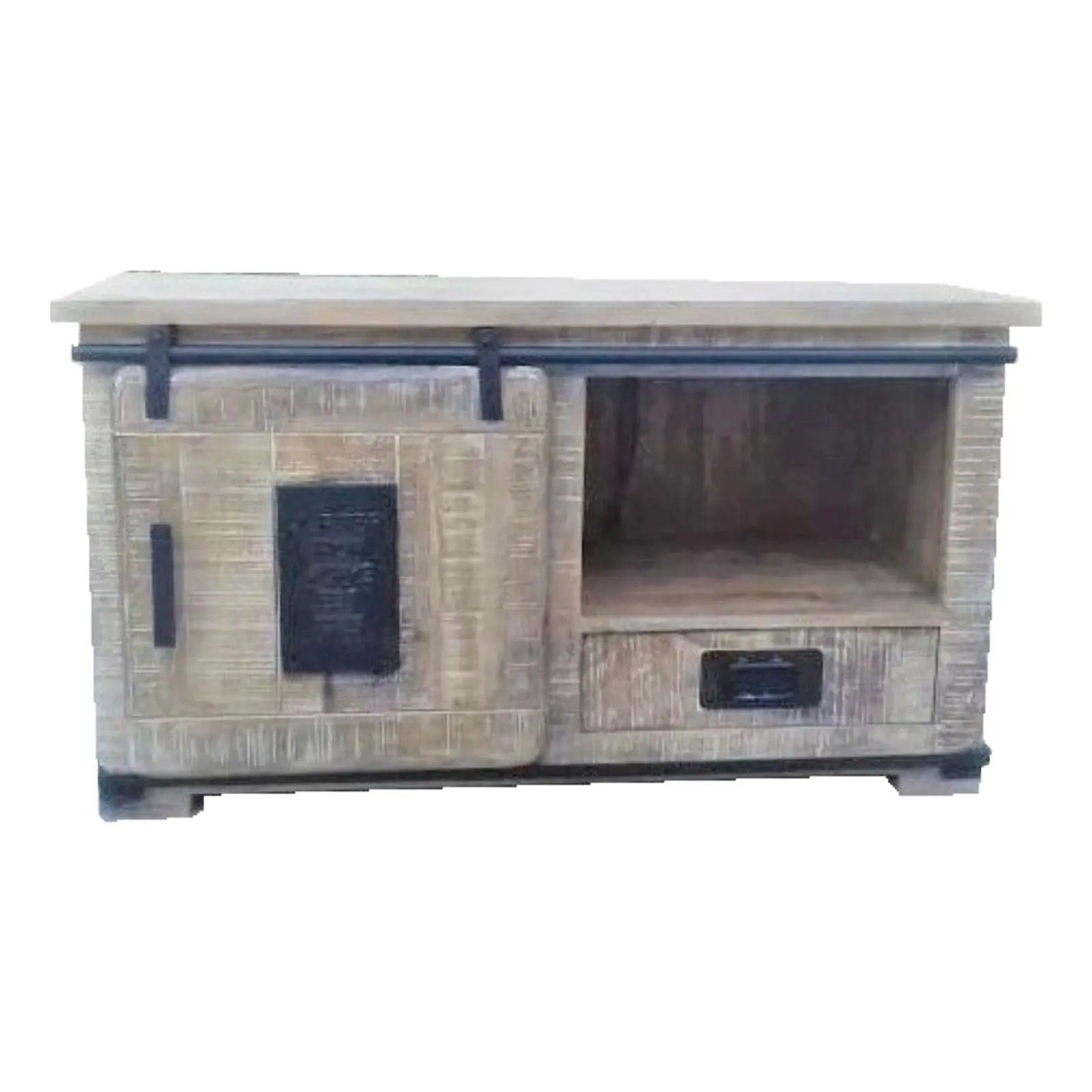 This industrial Jupiter media cabinet features an iron sliding door and solid wood construction, offering an open shelf rustic design with a lime wash finish.