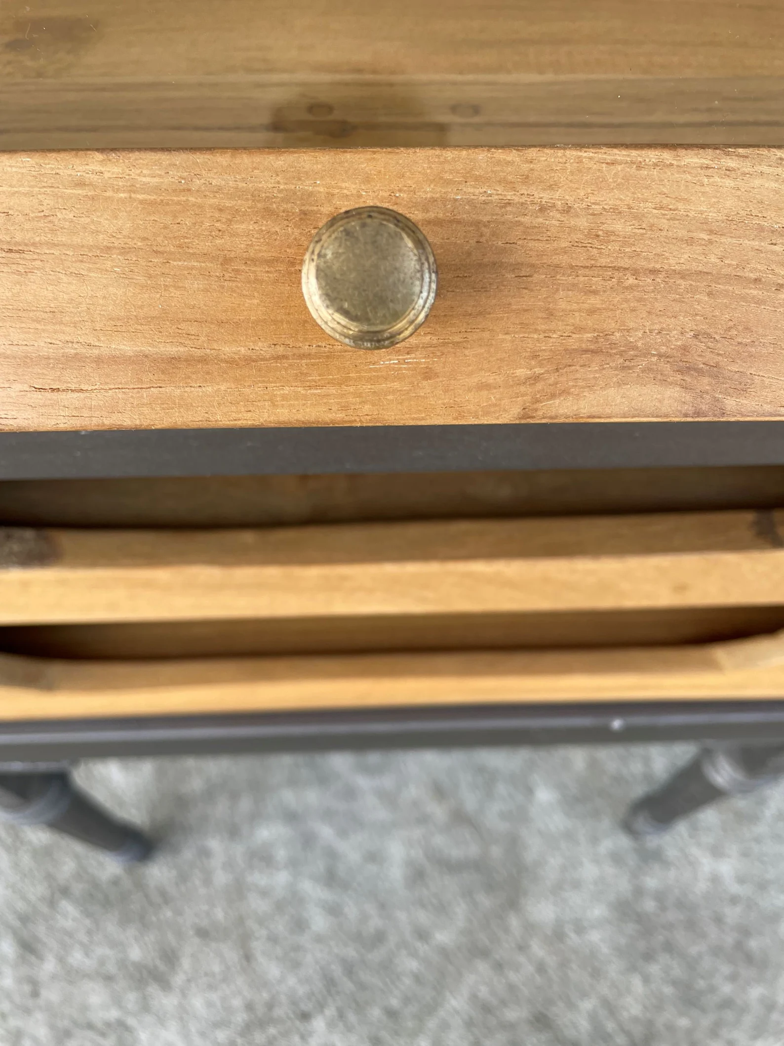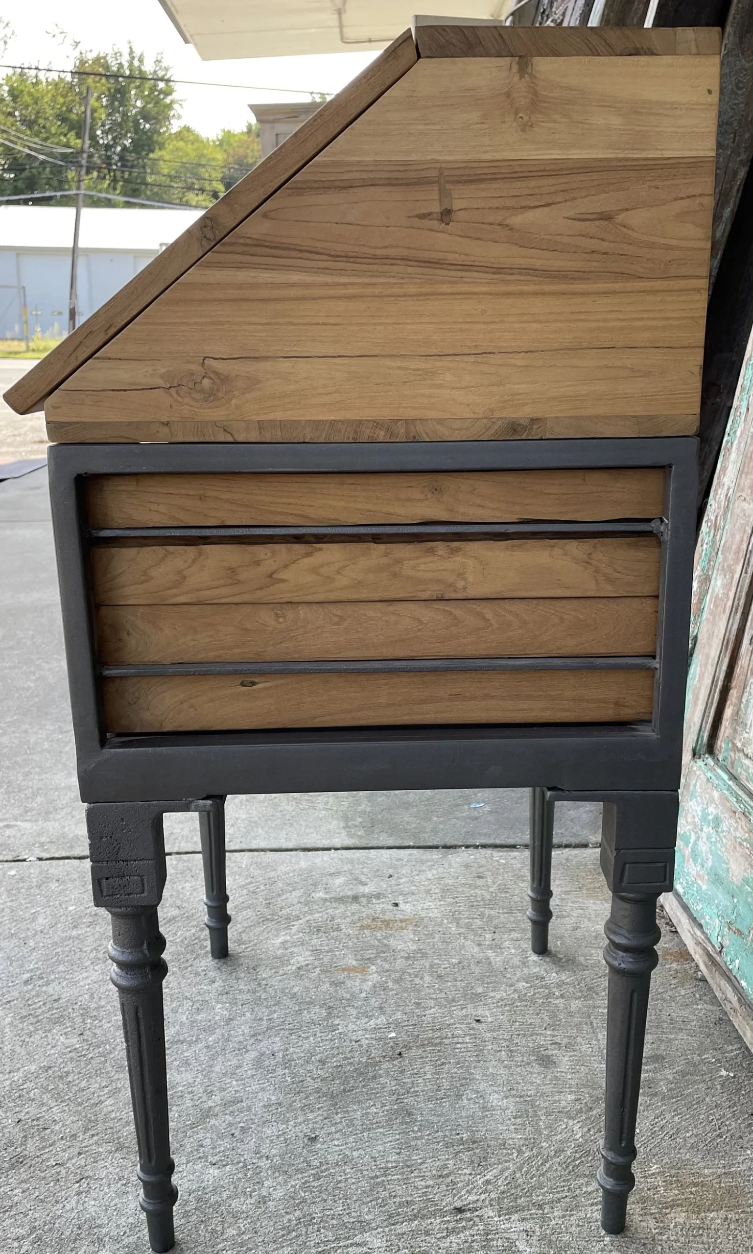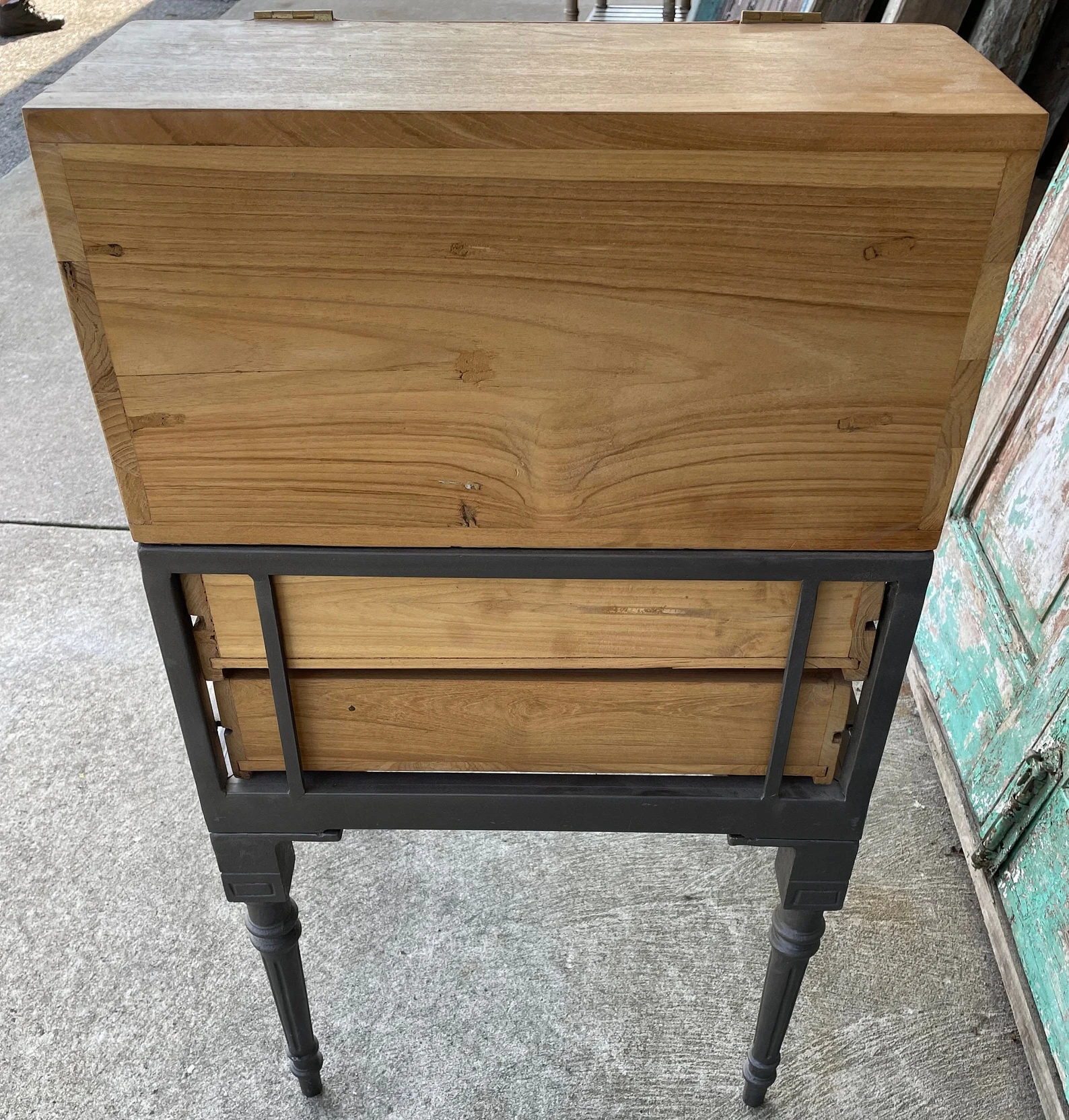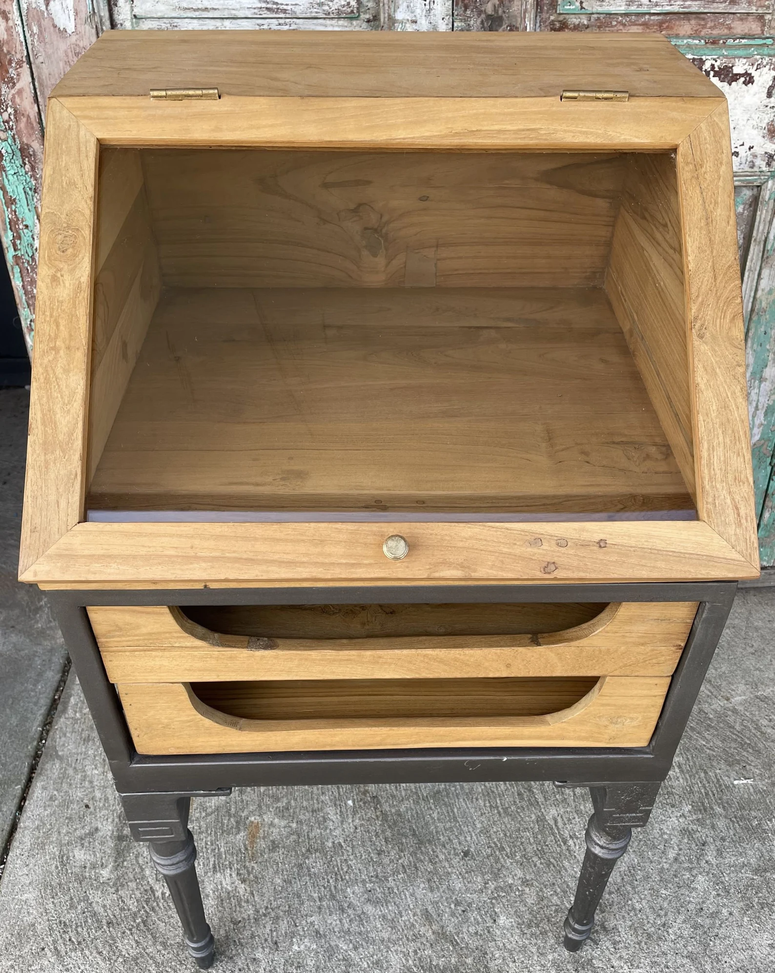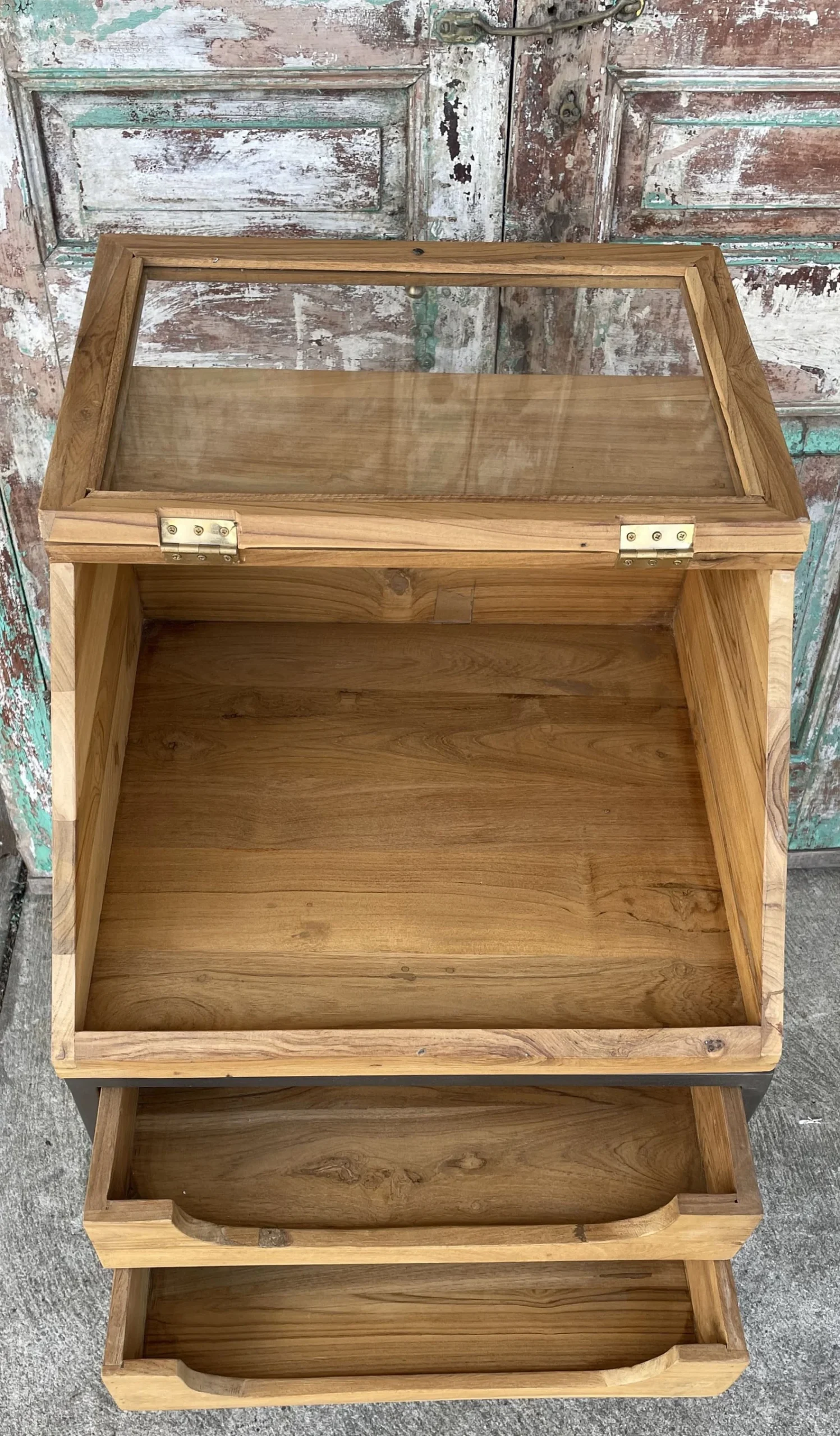 This industrial iron base display cabinet features a lift-up glass door and two drawers, crafted from solid teak wood, functioning as a shadow box showcase or small retail store collectible display table.
