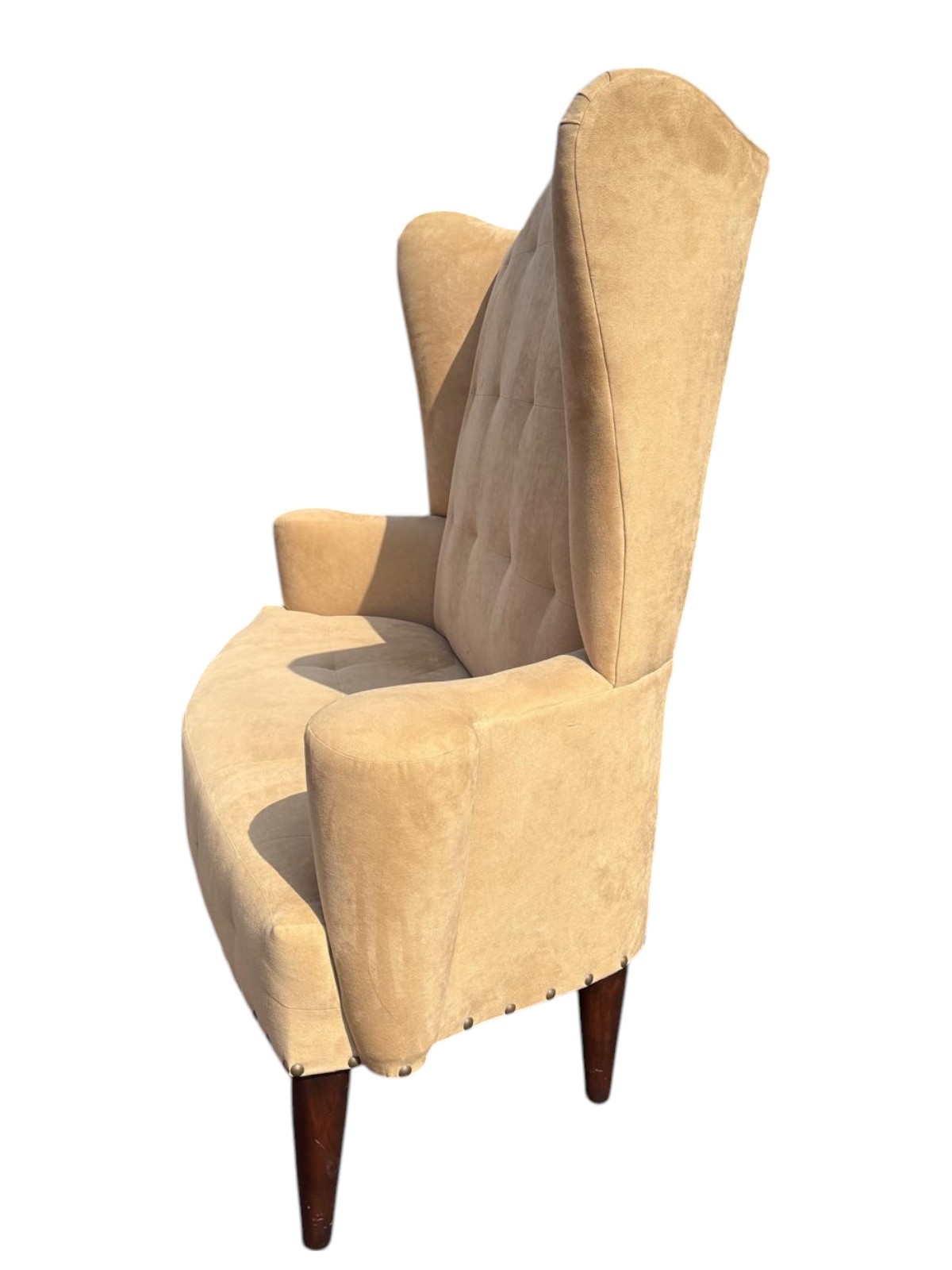 High back tan suede love seat with nailhead trim around the bottom. Upholstery is in good condition. The legs are wood.