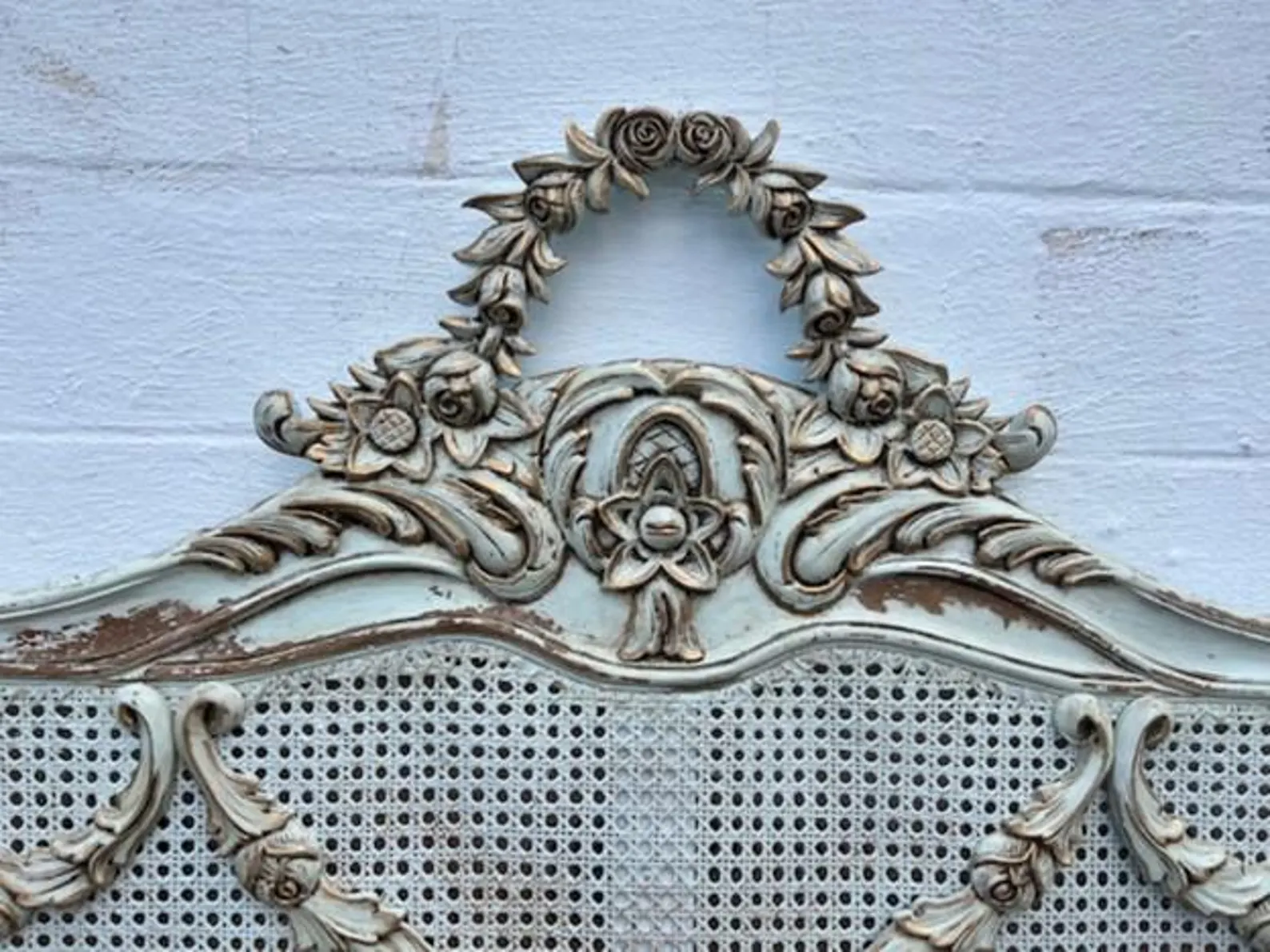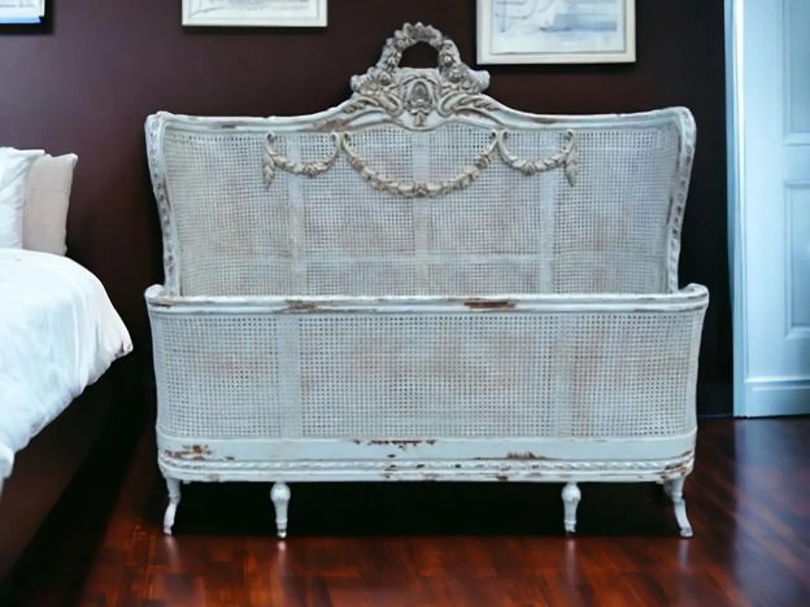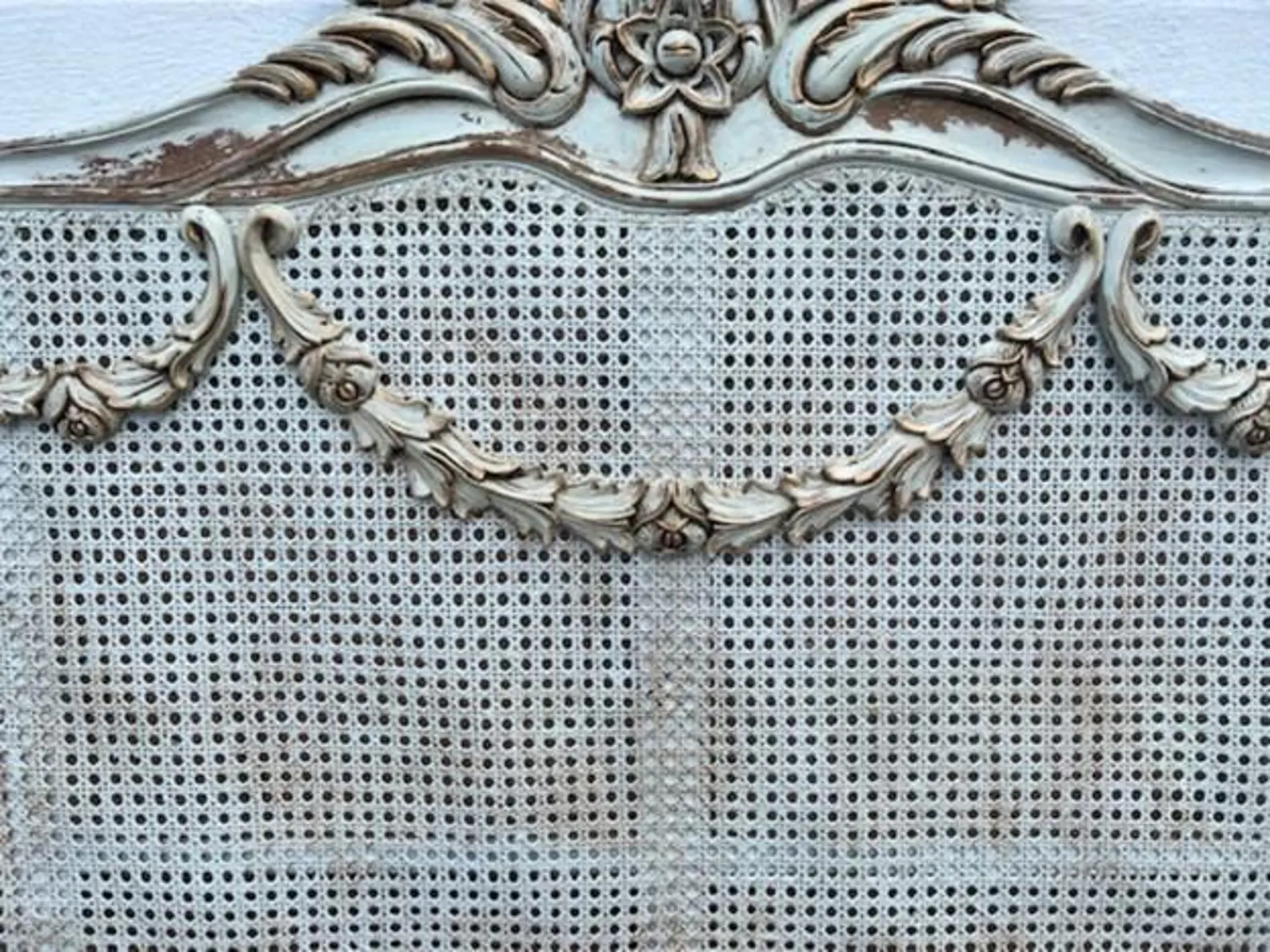This Queen Size Bed Frame features a Louis XV Floral Swag double hole cane headboard, curved footboard, rails, and slats, all in a weathered finish with faux giltwood patina.