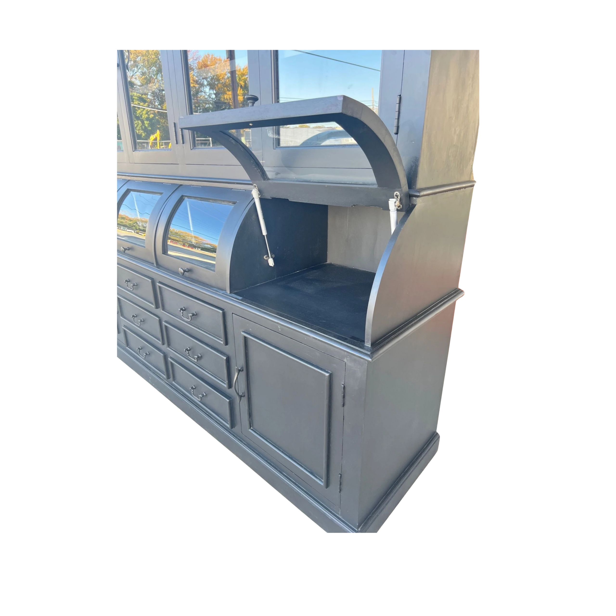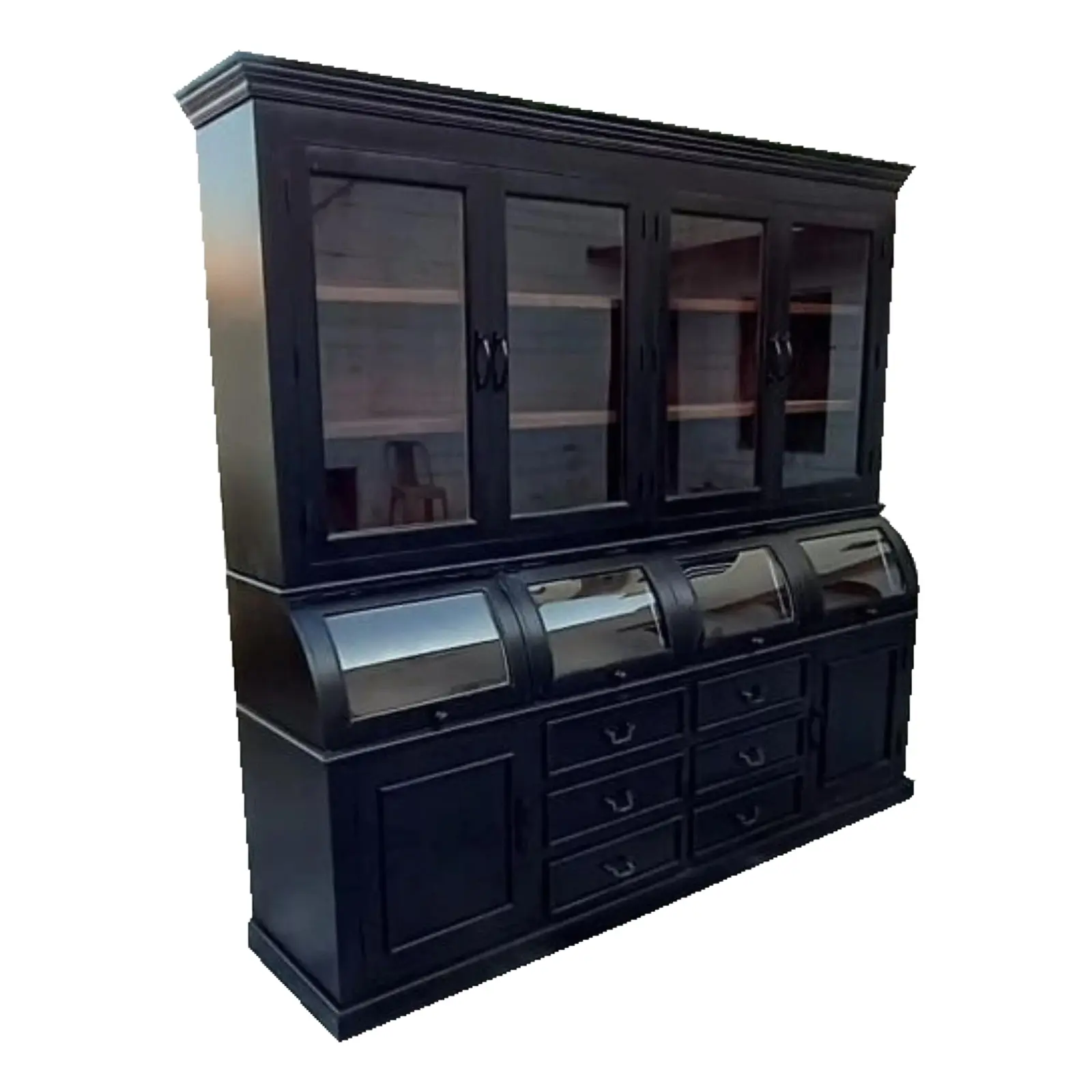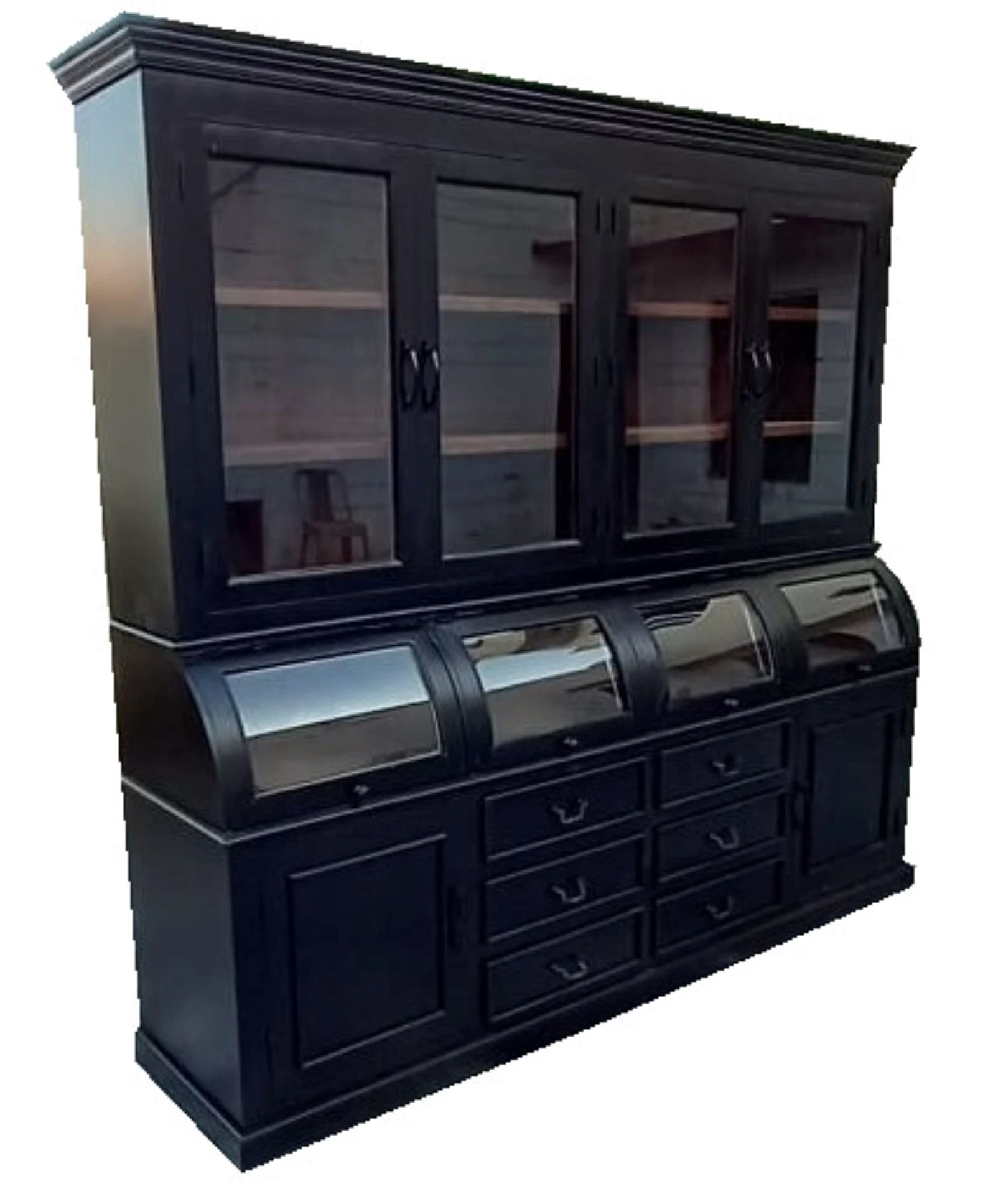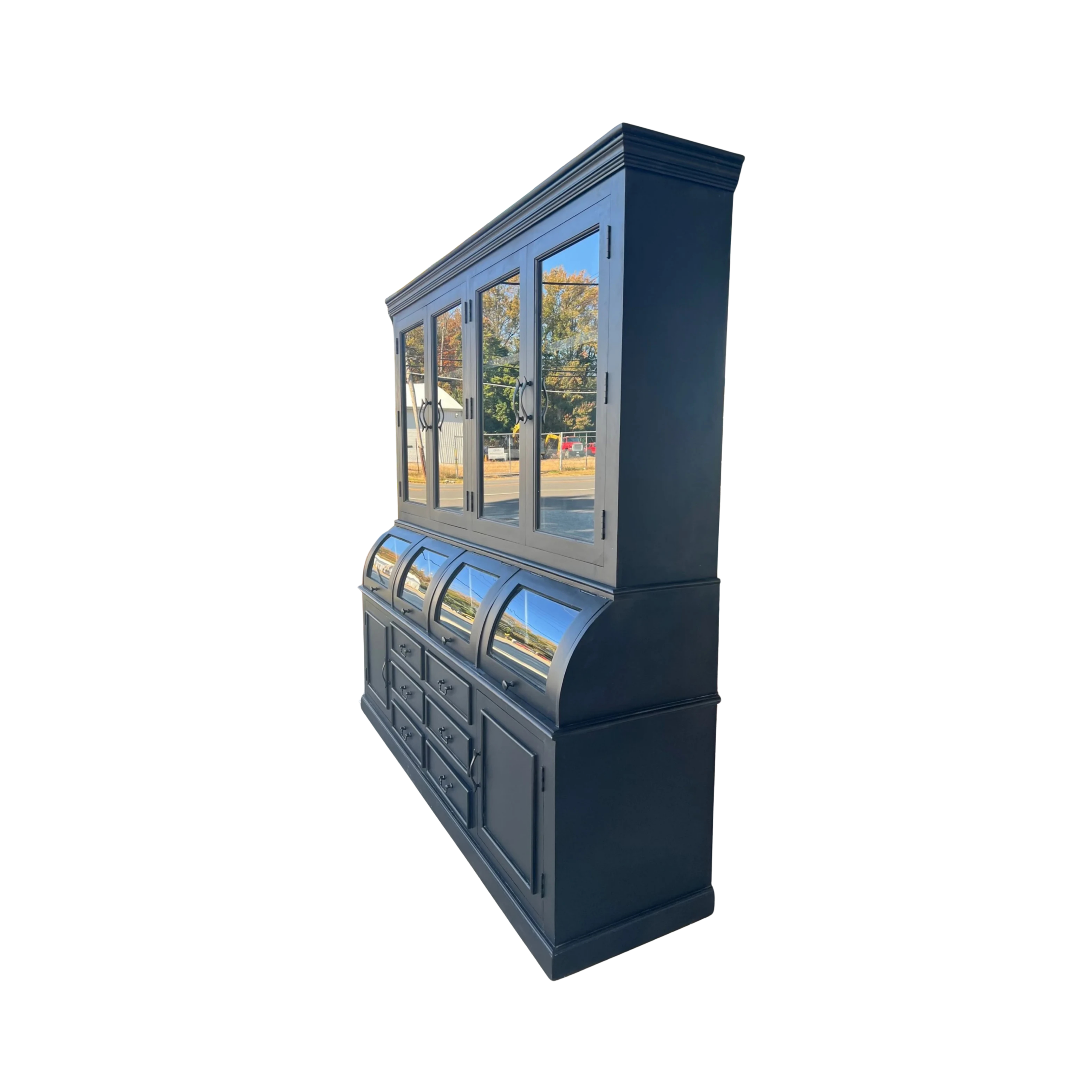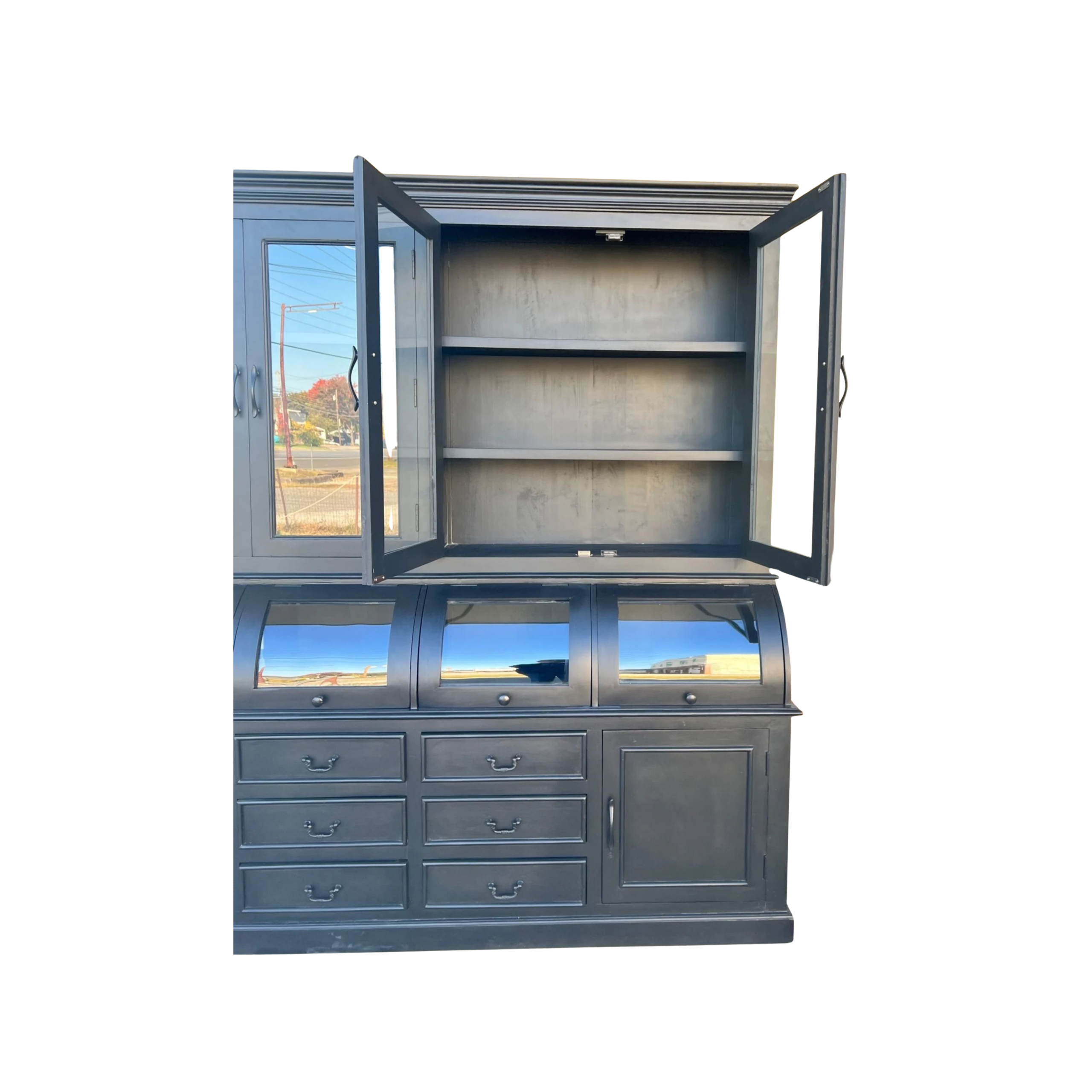 This Modern Farmhouse kitchen pantry is a large cupboard crafted from solid wood, featuring a glass door china display showcase and a 2-piece hutch with curved glass and a black bread cabinet.