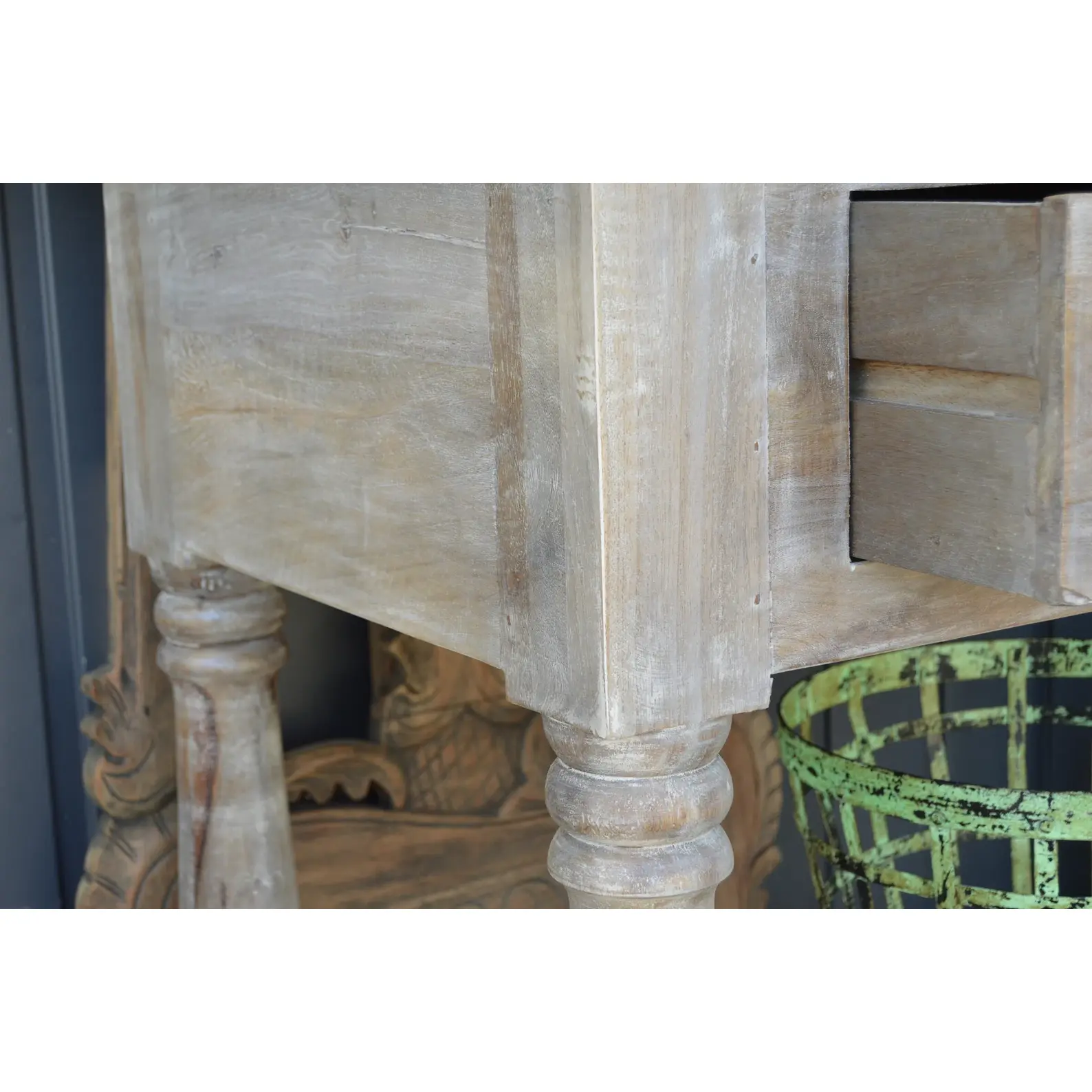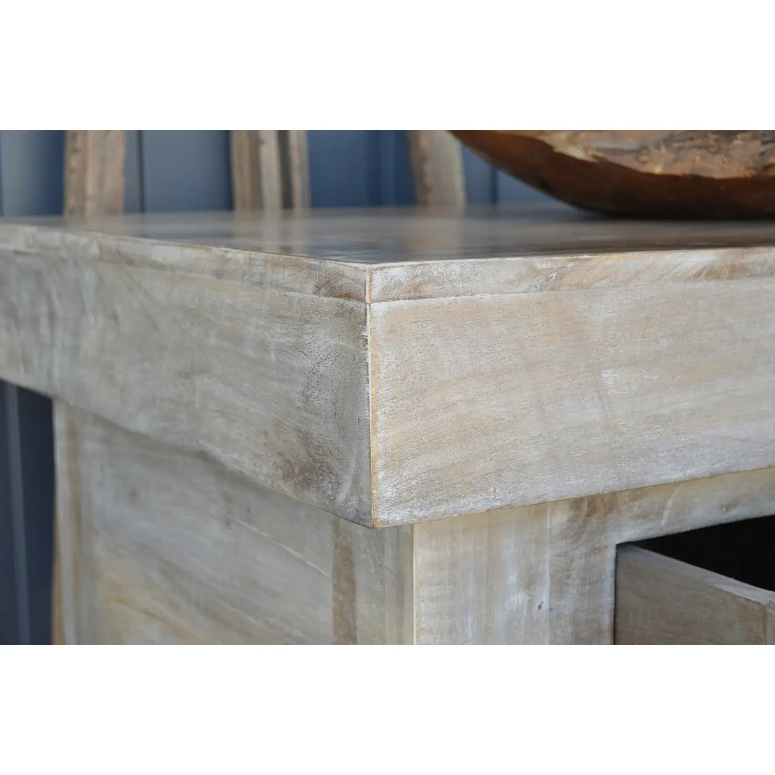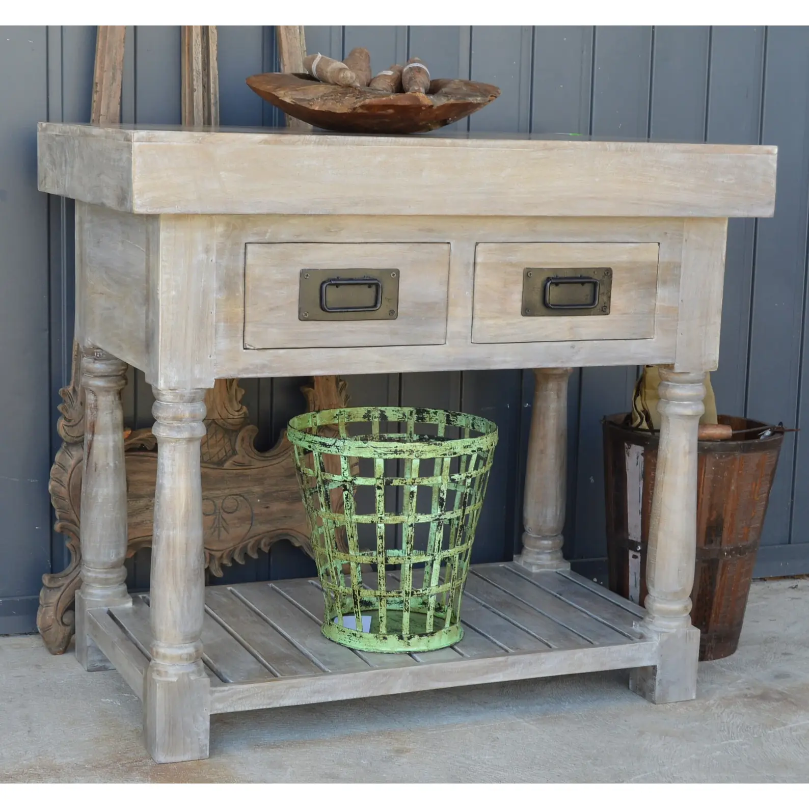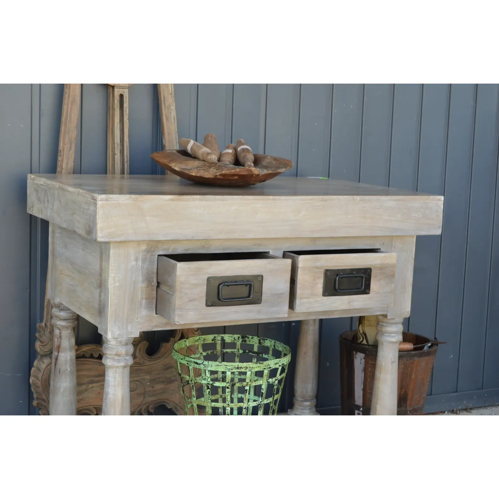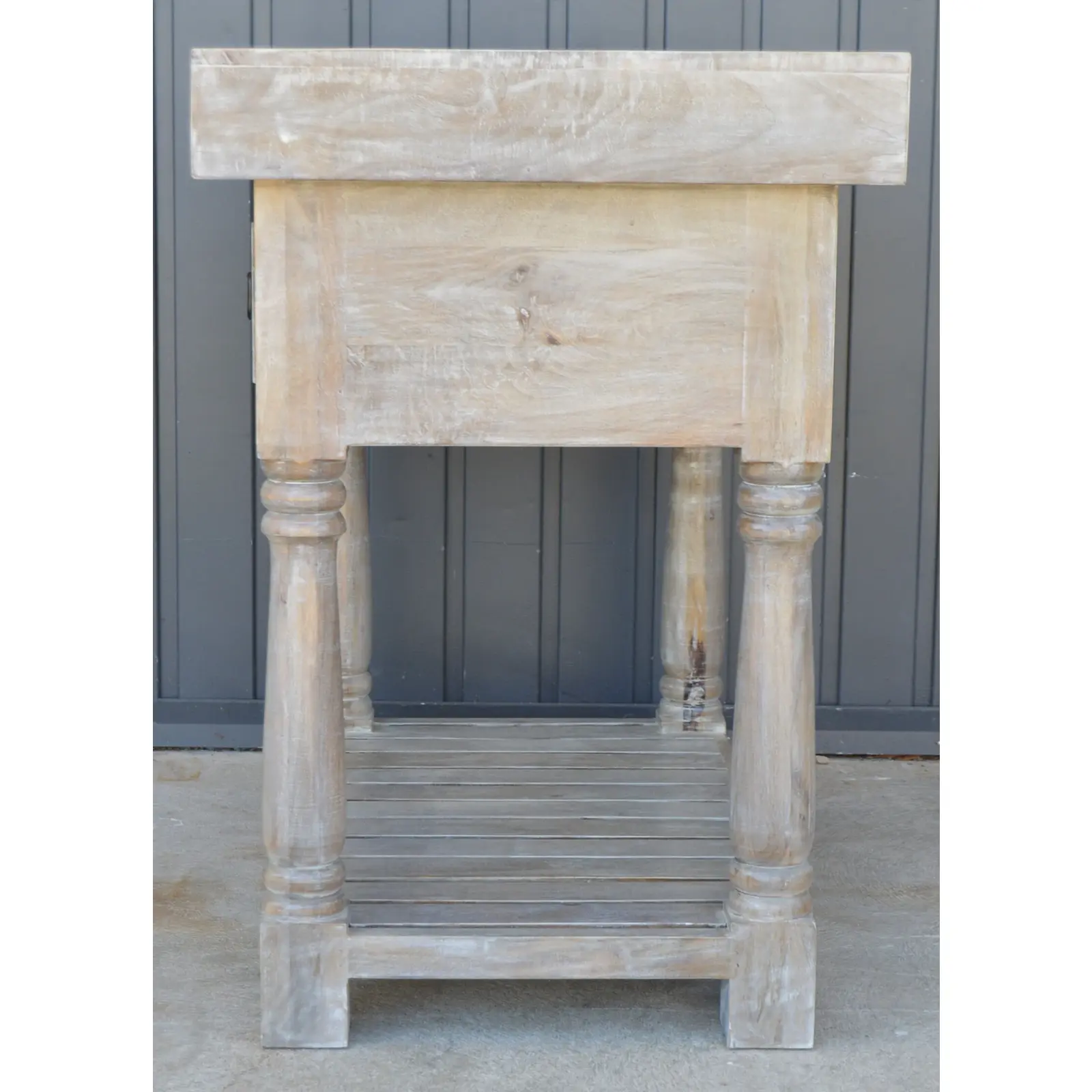 This Modern Farmhouse kitchen island features two drawers, a butcher block top, and a slatted shelf, all in a driftwood finish, perfect as a work table.