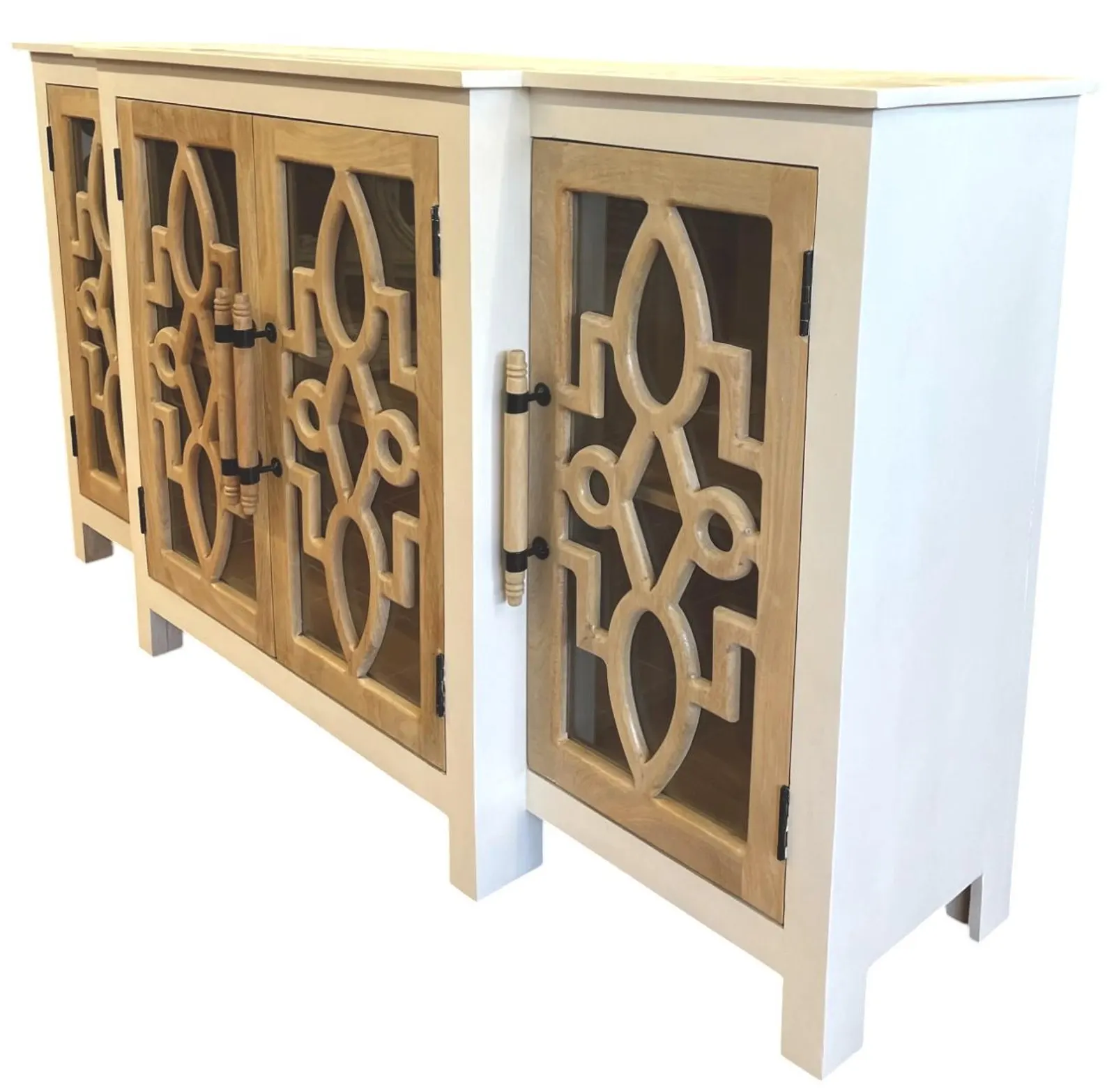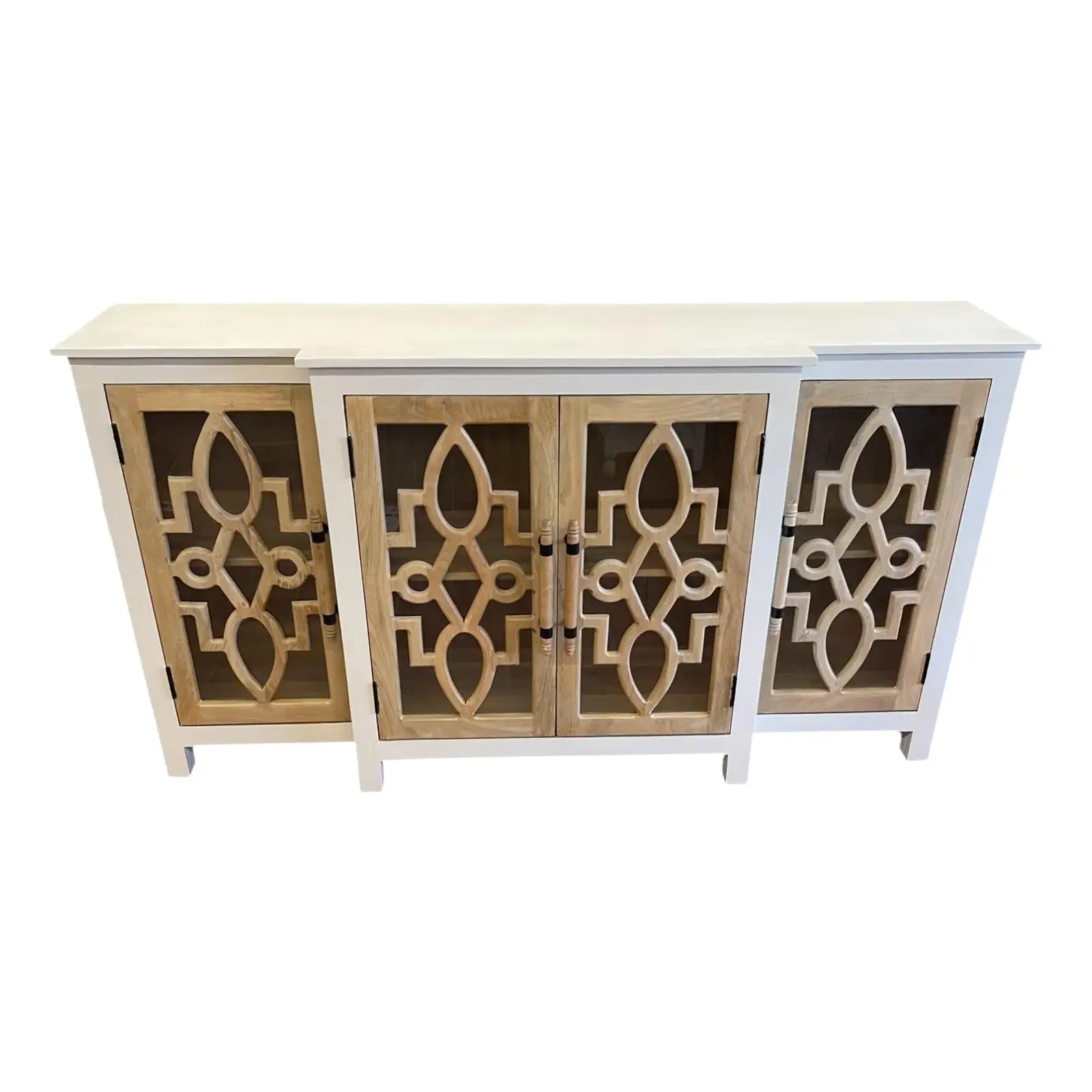This Modern Farmhouse credenza is crafted from tall solid mango wood with four glass doors, offering an entryway console or sofa table height cabinet with a natural wood and white two-tone finish.