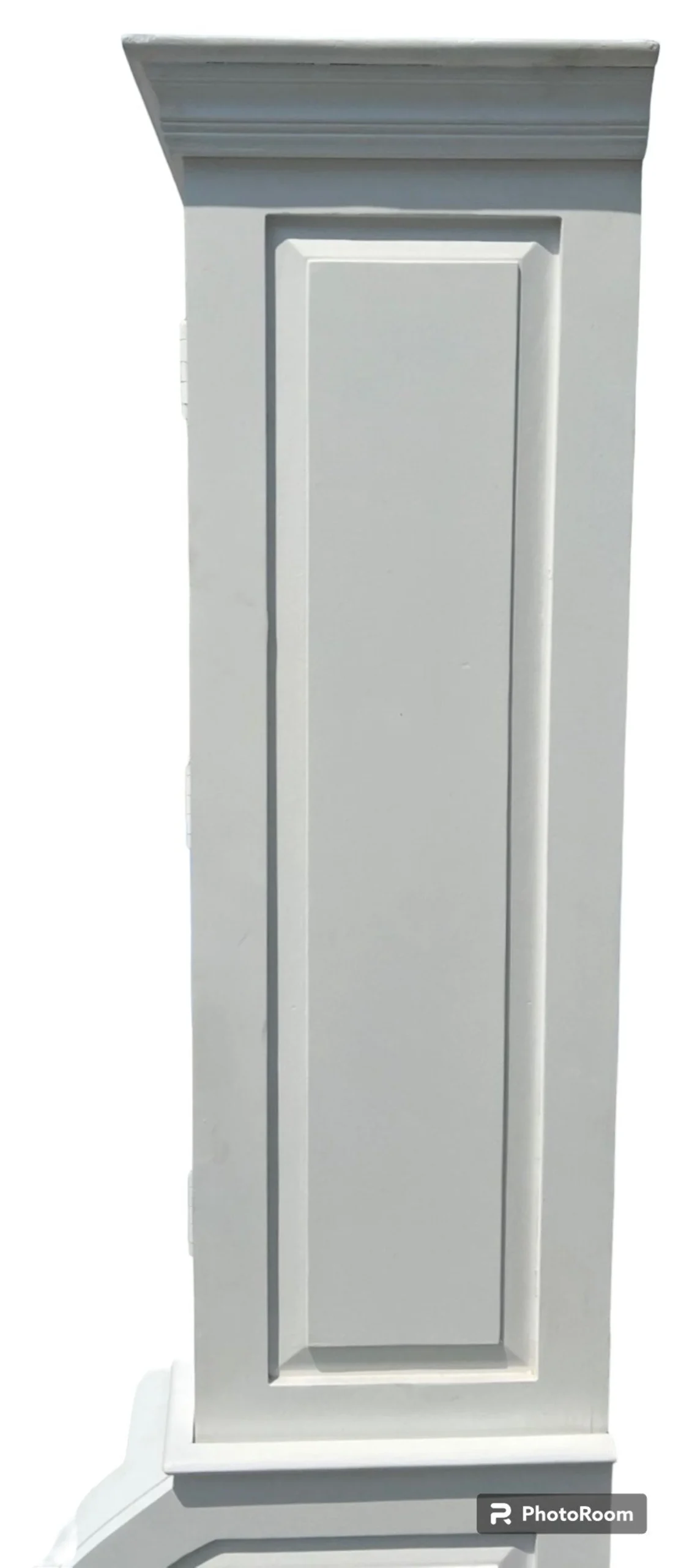 This Modern Farmhouse kitchen pantry cupboard features a tall white glass door and curved glass for bread rolls, offering a 2-piece solid wood display hutch.