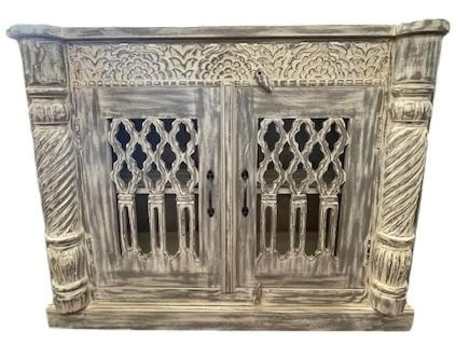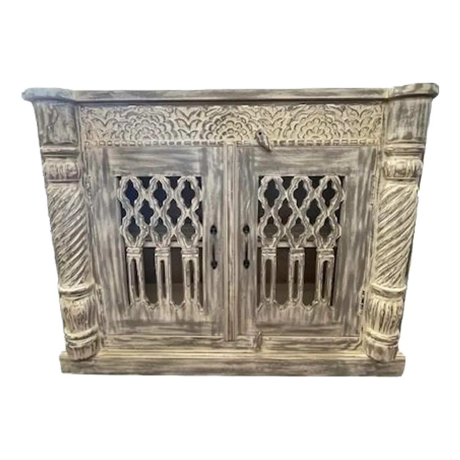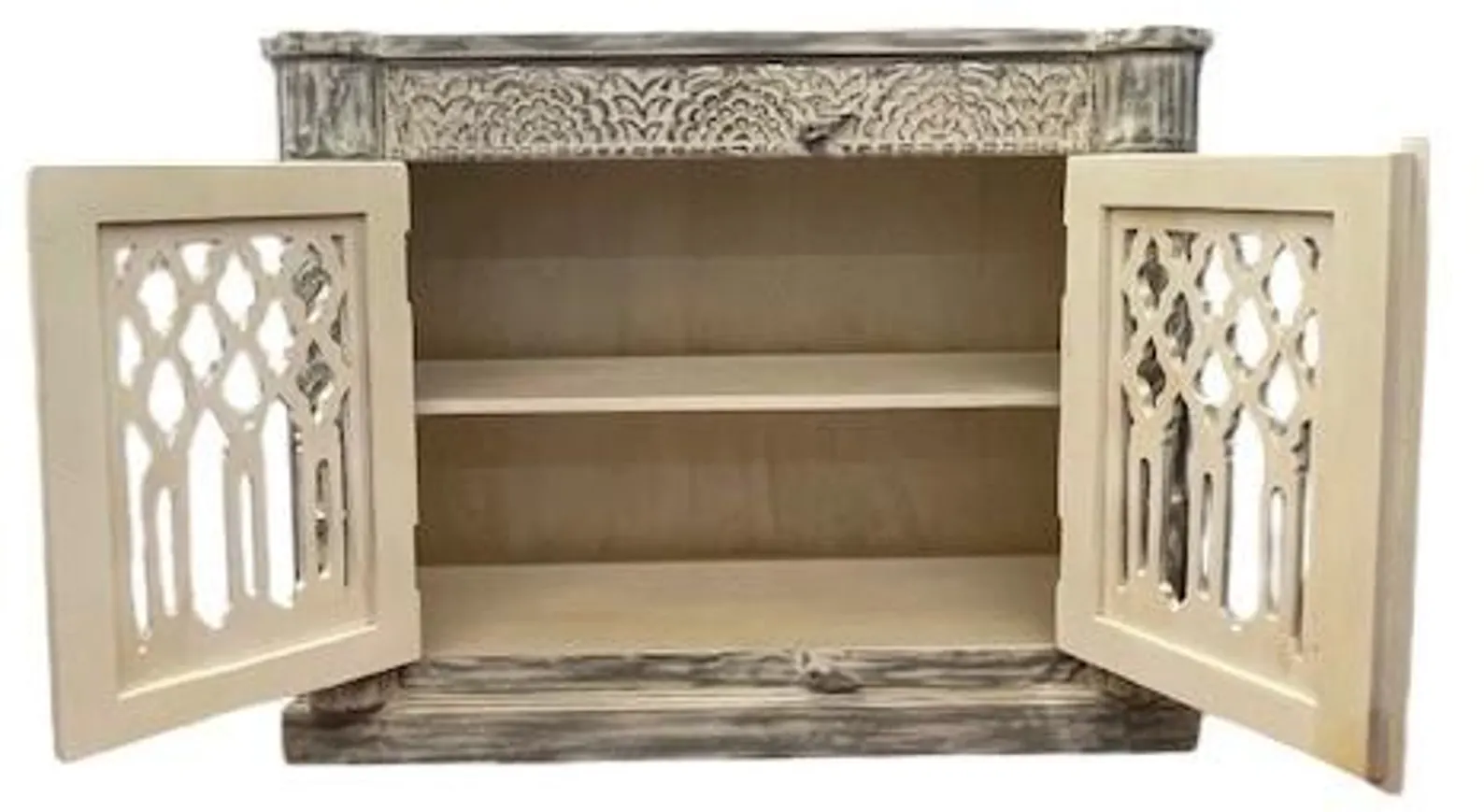 This modern Goth accent cabinet features carved open work and two doors, crafted from solid natural acacia wood with a gray wash finish, functioning as an entryway medium-size buffet server.