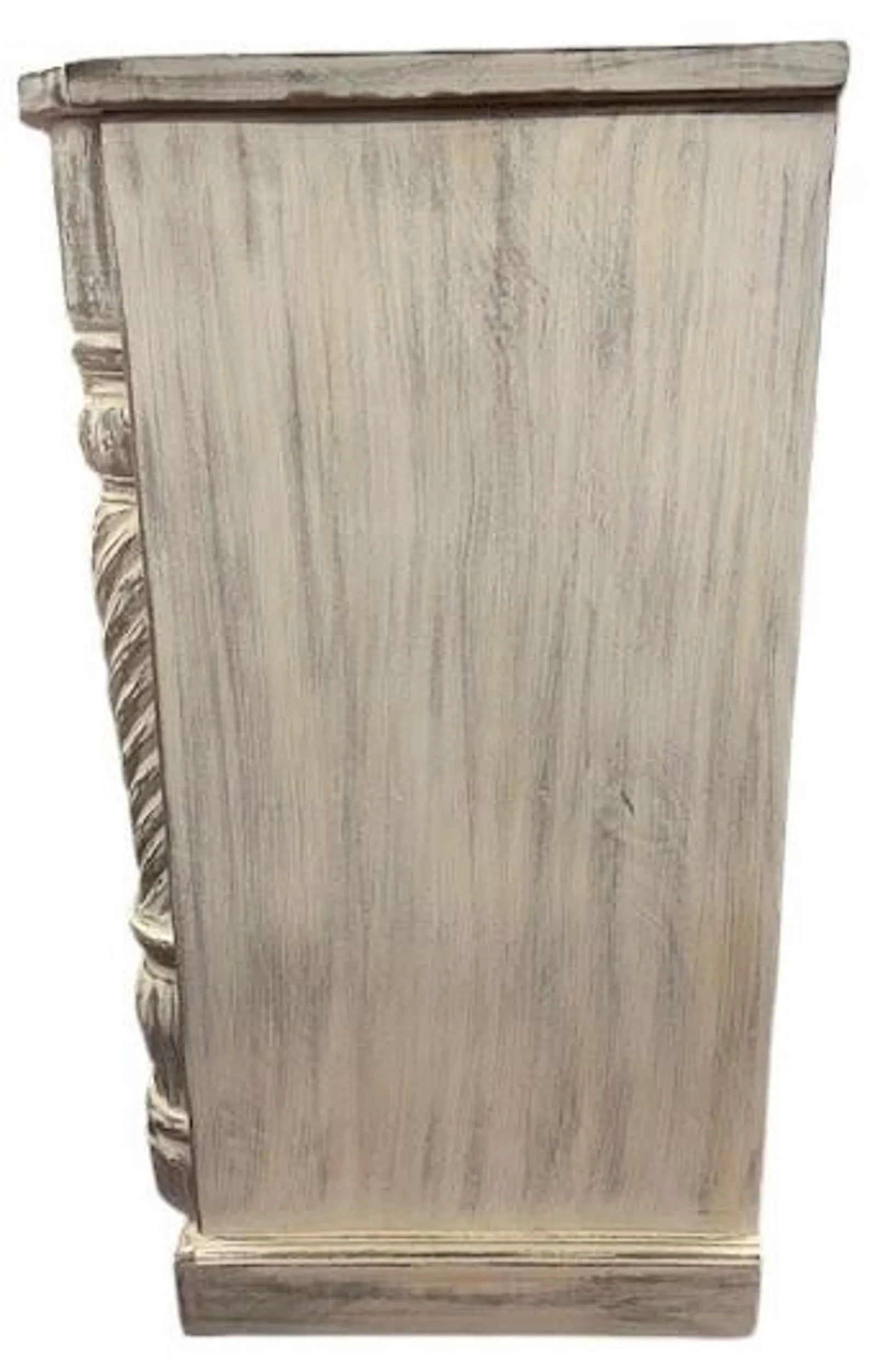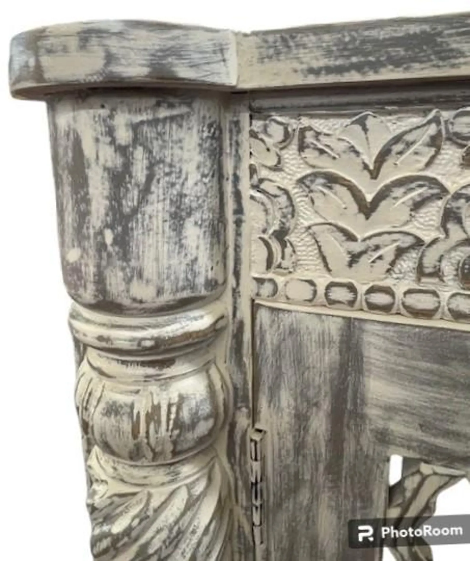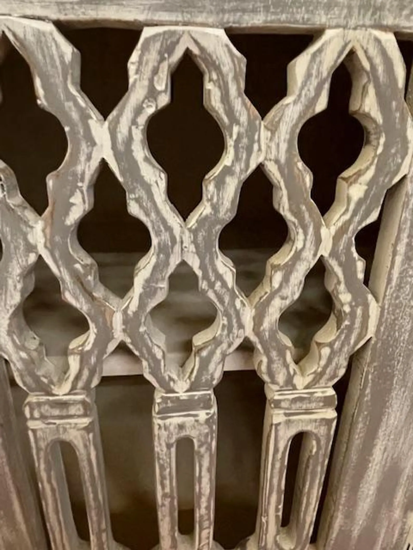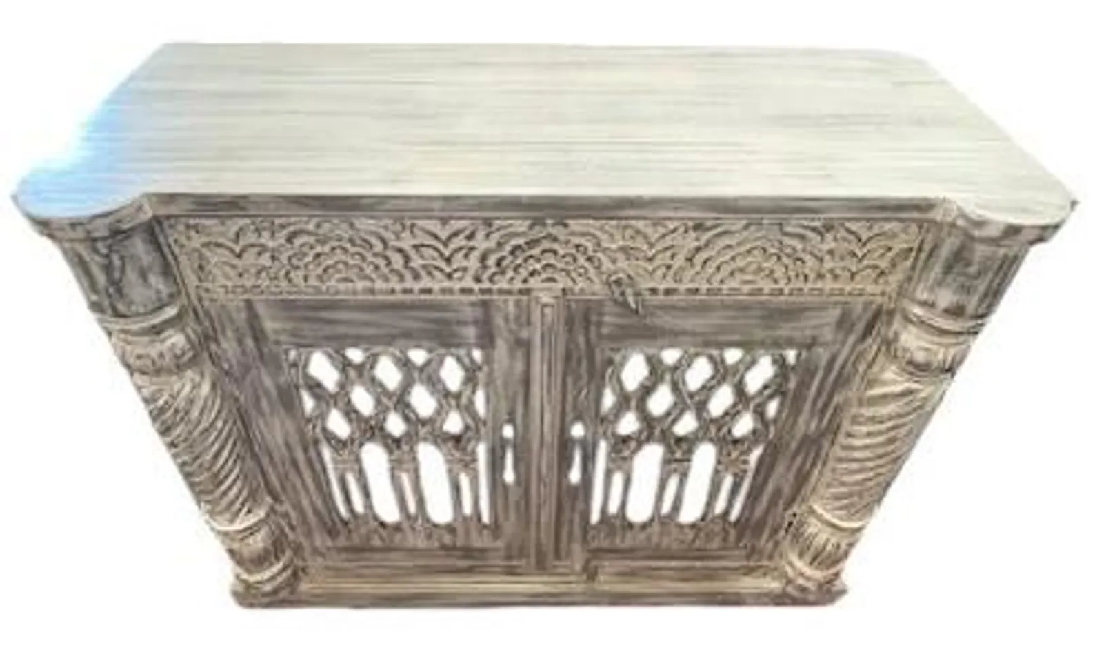 This modern Goth accent cabinet features carved open work and two doors, crafted from solid natural acacia wood with a gray wash finish, functioning as an entryway medium-size buffet server.