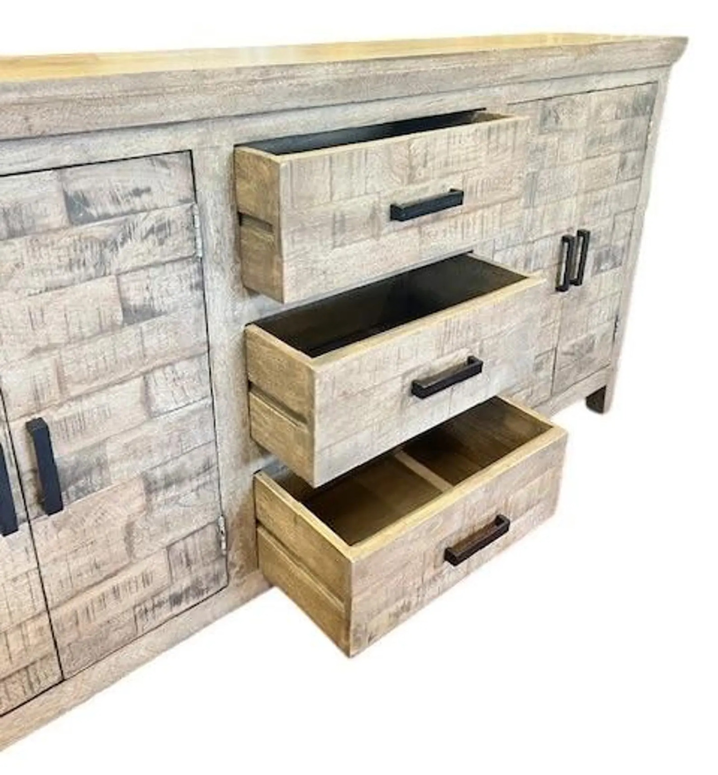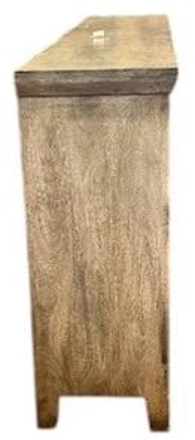 This modern rustic sideboard features four doors and three drawers, offering a narrow buffet server or 3-foot tall entryway hallway console crafted from solid mango wood, perfect as an accent cabinet.