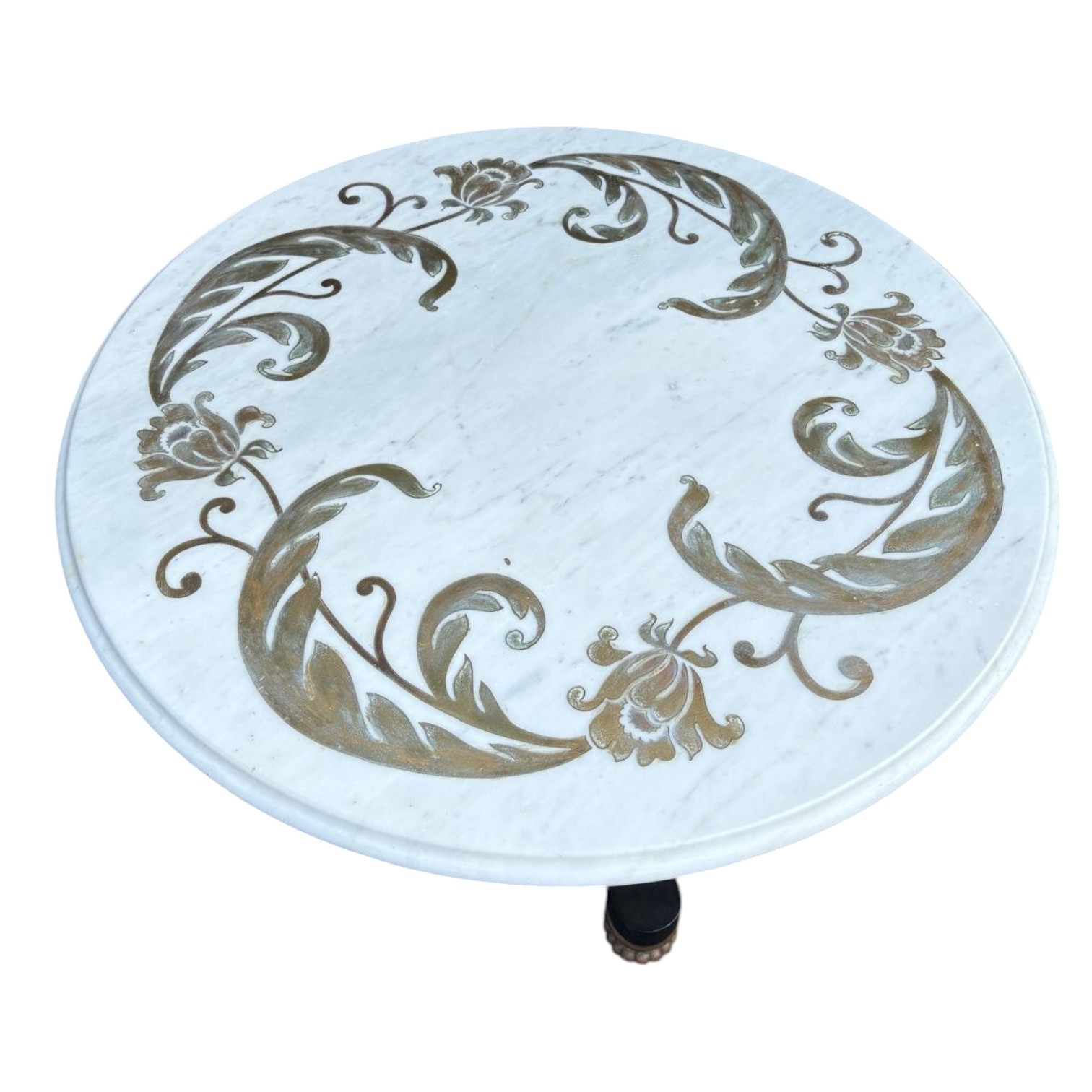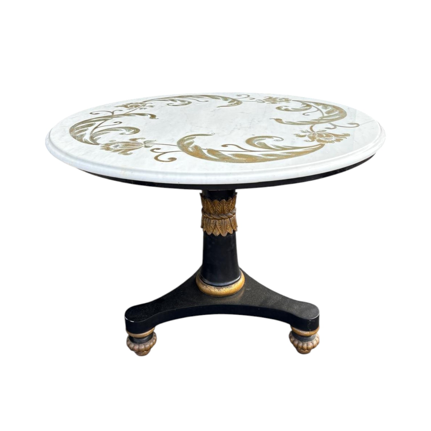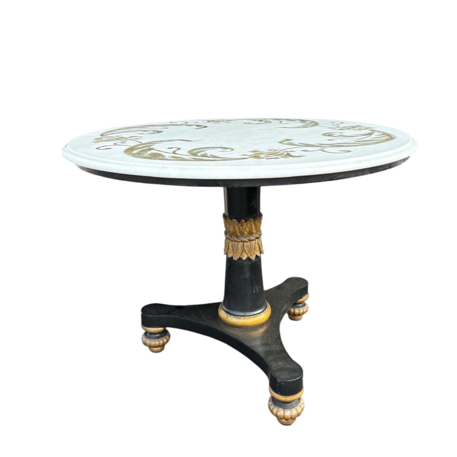Round Neoclassical Empire marble top table with a black and gold base. The white marble top has gold inlay design in it. Could serve as a small dining table or an entry center hall table. Mid 20th Century