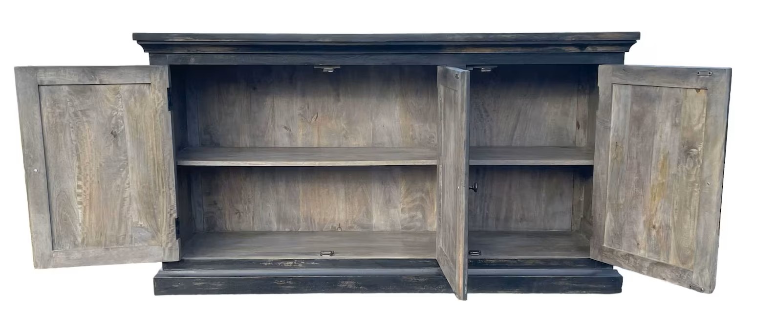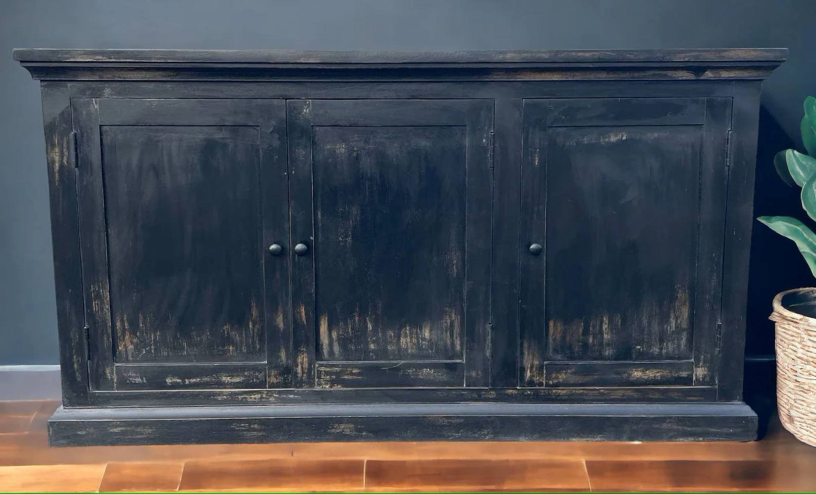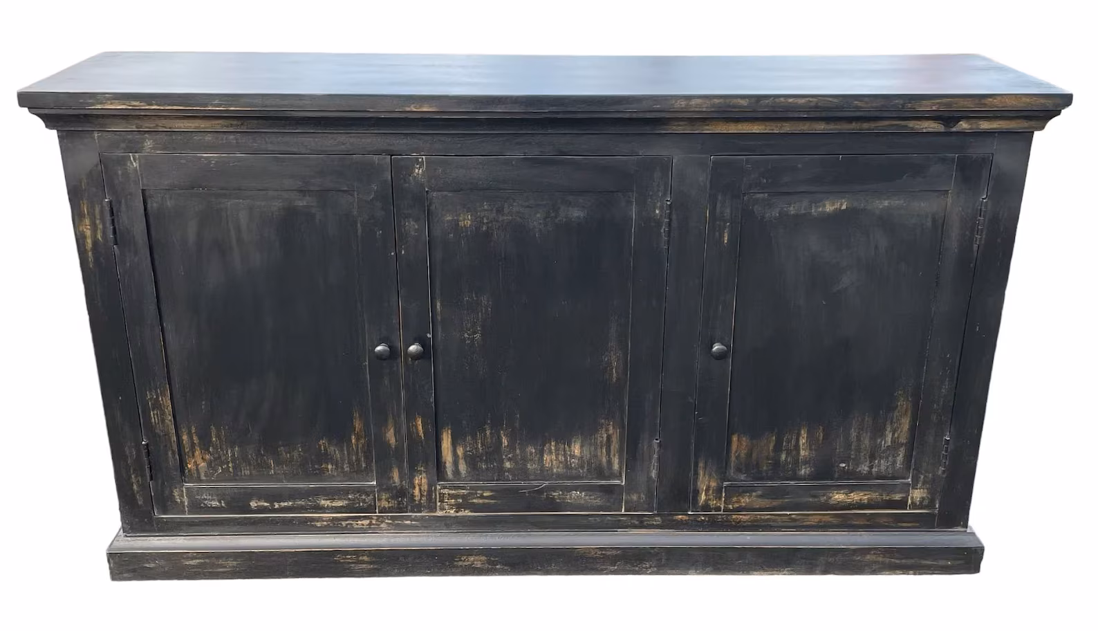 This Old Farmhouse Style entryway console is crafted from solid mango wood with a distressed black finish, featuring three doors, functioning as a dining buffet server or counter height kitchen island cabinet.