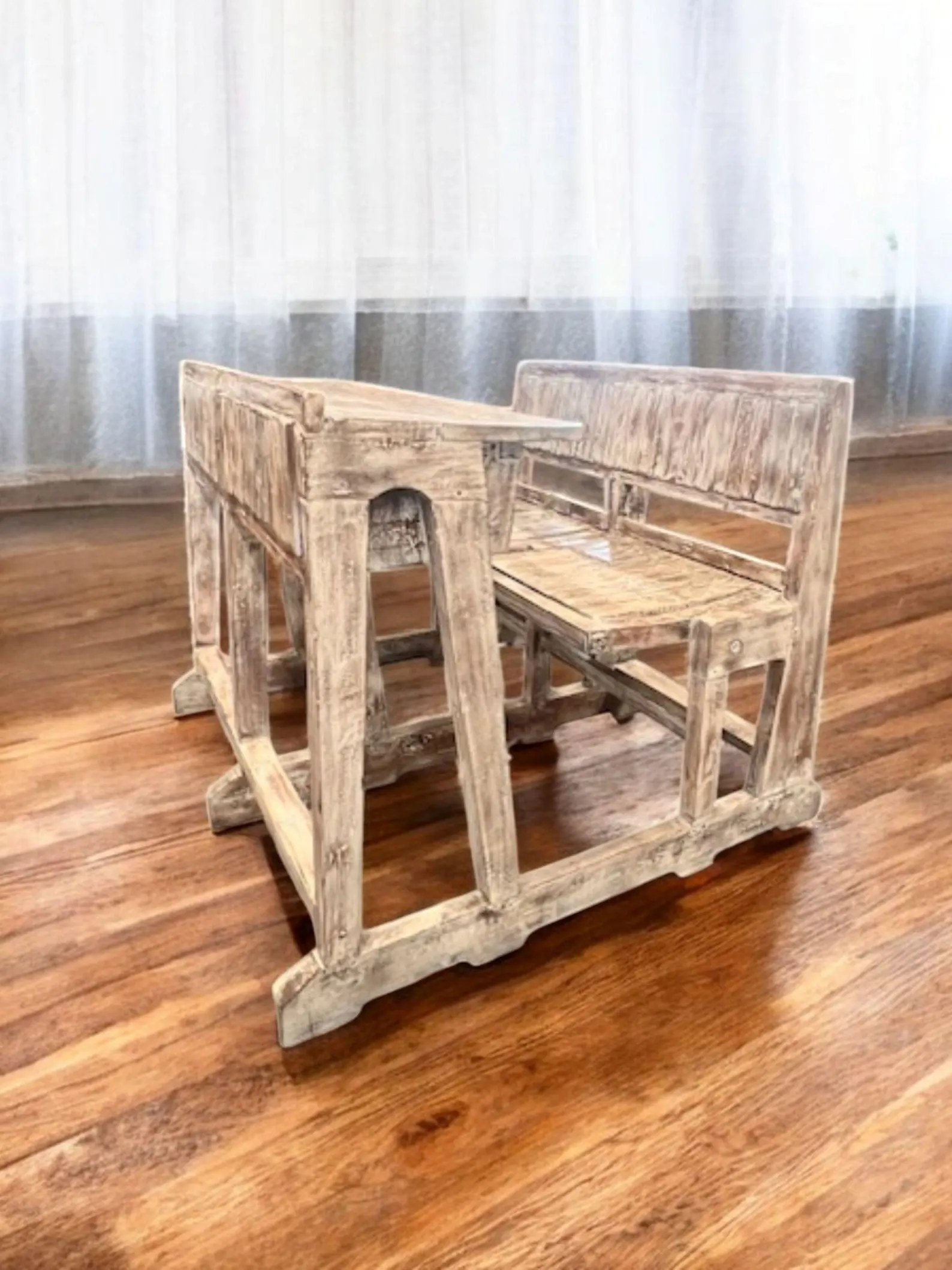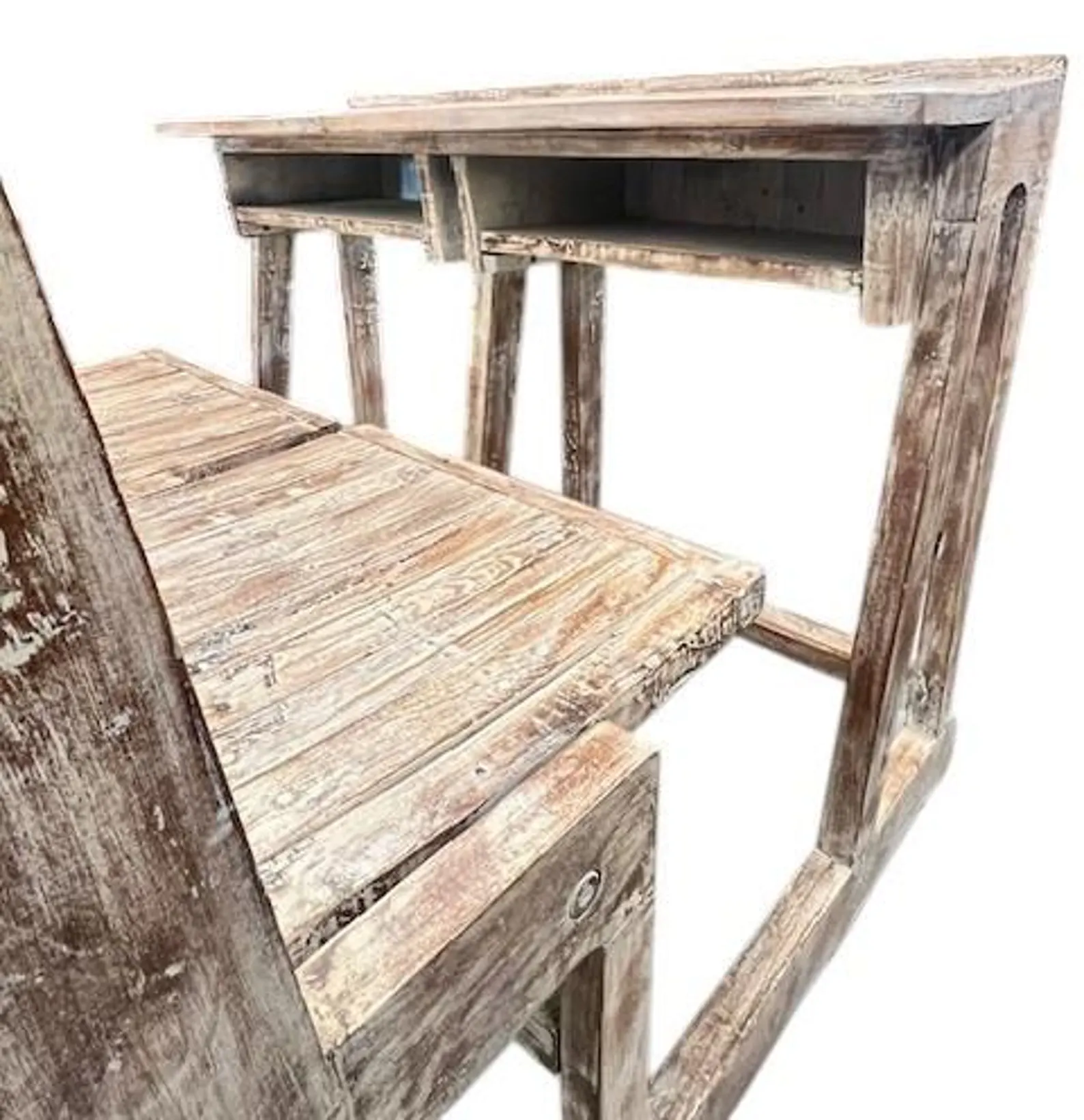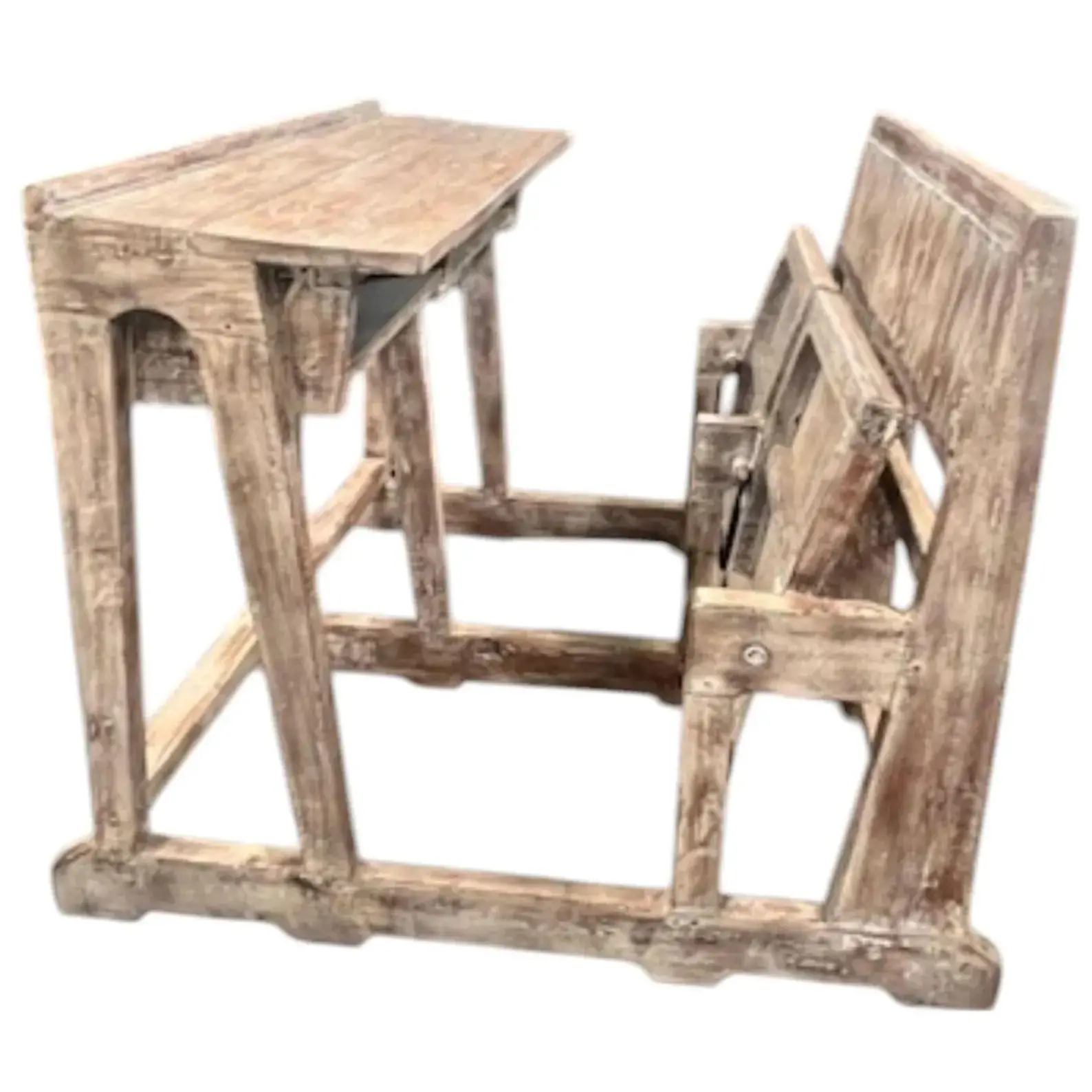 This one-of-a-kind rustic reclaimed timber vintage style school student double desk features folding seats and storage cubbies.