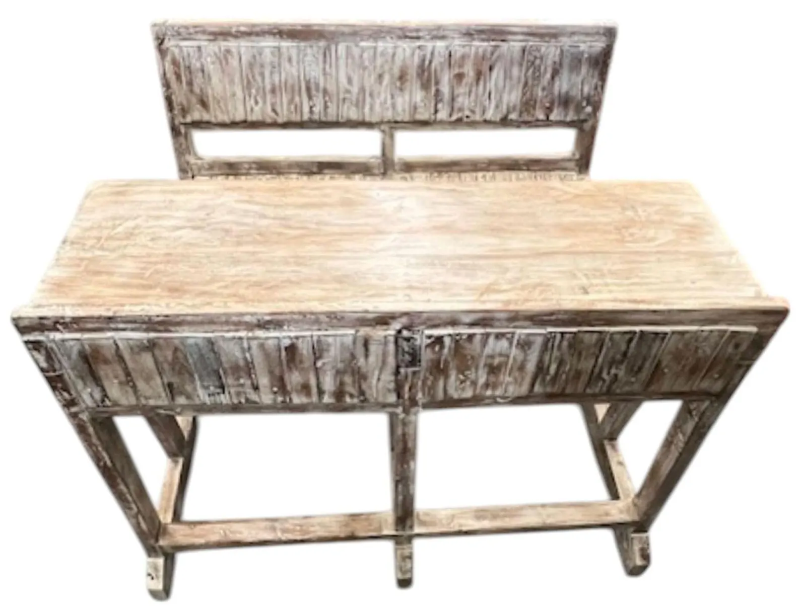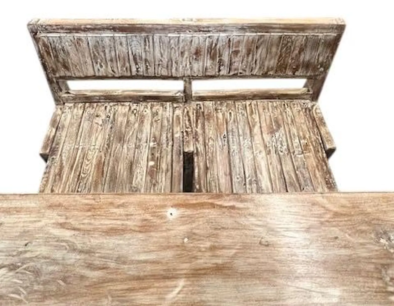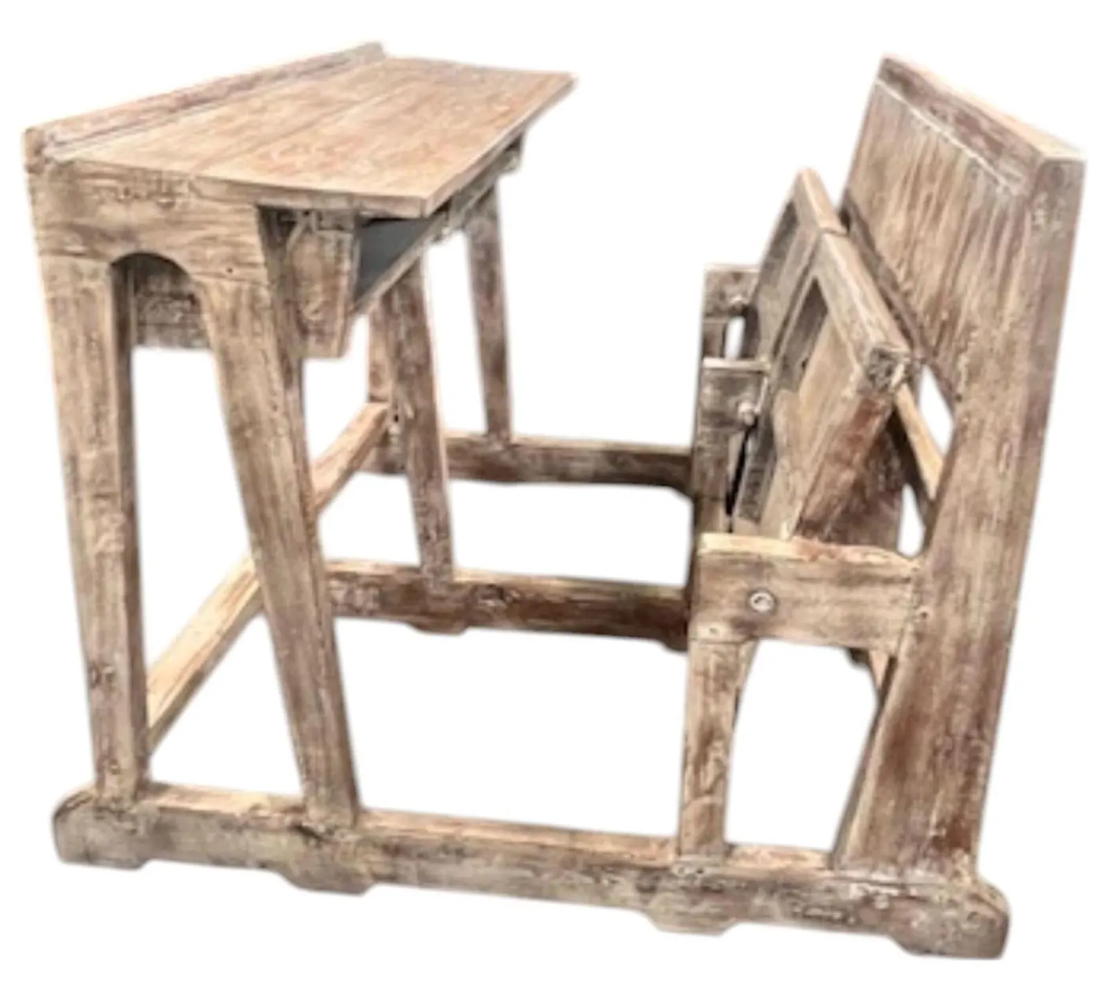 This one-of-a-kind rustic reclaimed timber vintage style school student double desk features folding seats and storage cubbies.