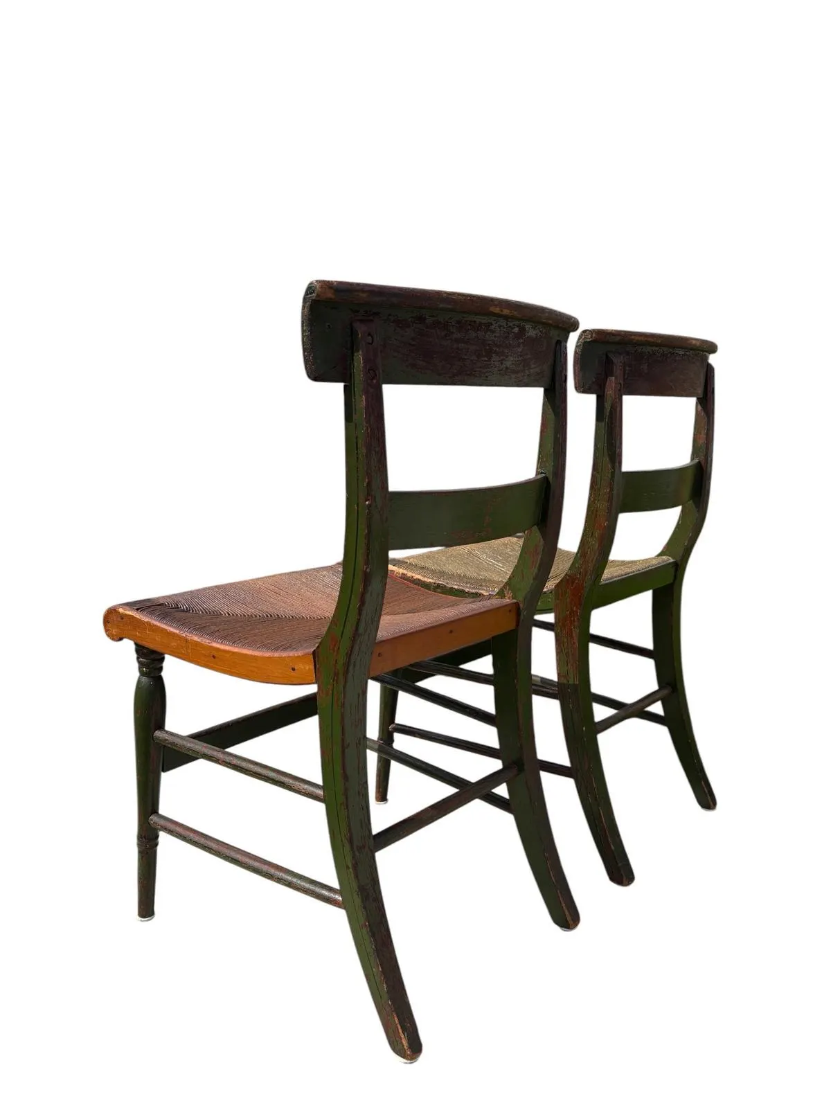 This charming matched pair of Hitchcock style chairs have solid hardwood frames mortise and tenon joinery with hand turned legs and stretchers. Seats are original woven rush that is intact. The original stencil floral and guild decoration remains visible. The chairs are in good condition with stable frames and seats. There is some surface wear and small losses of paint consistent with 150 years of use but that only adds to the patina. From the late 1800s to early 1900s.