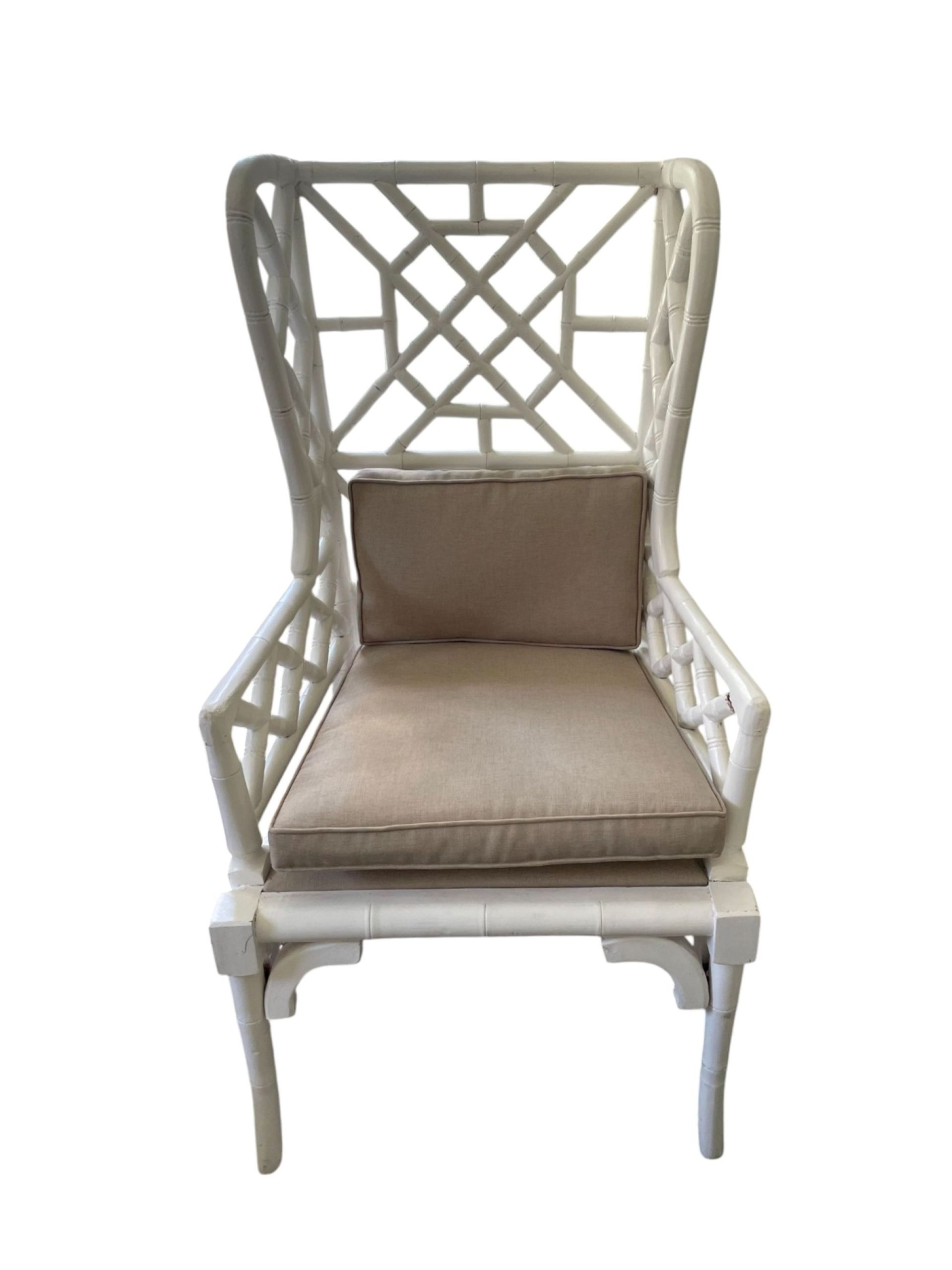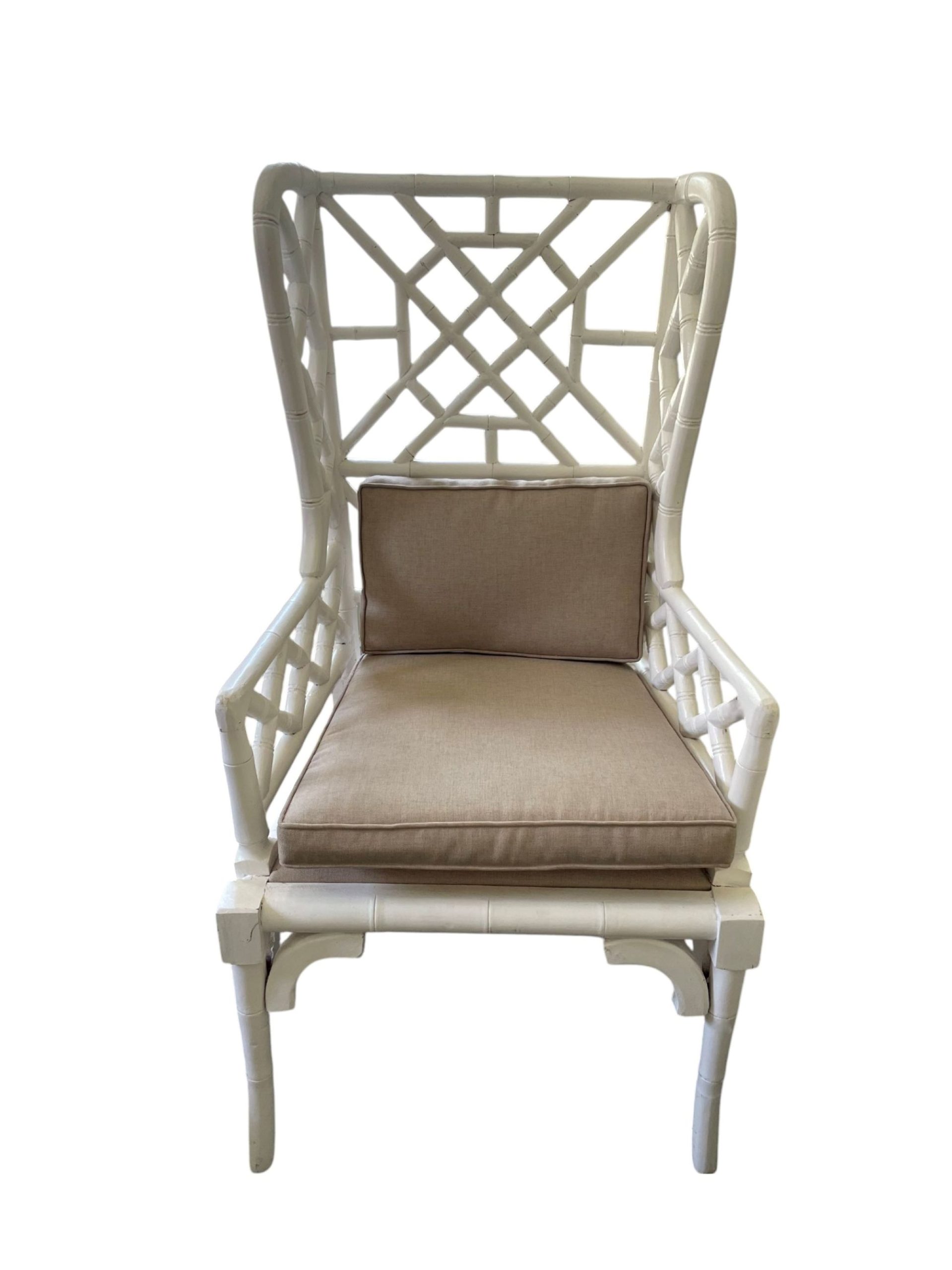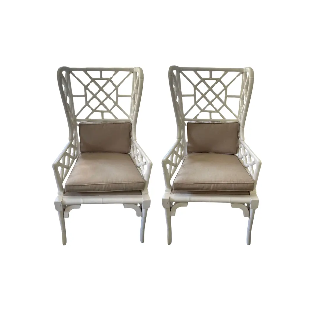 This pair of two Coastal Boho accent armchairs features carved fretwork on solid mahogany wood, with a Chinese bamboo style and white pagoda design, perfect as wingback chairs for a bedroom, porch, or sunroom.