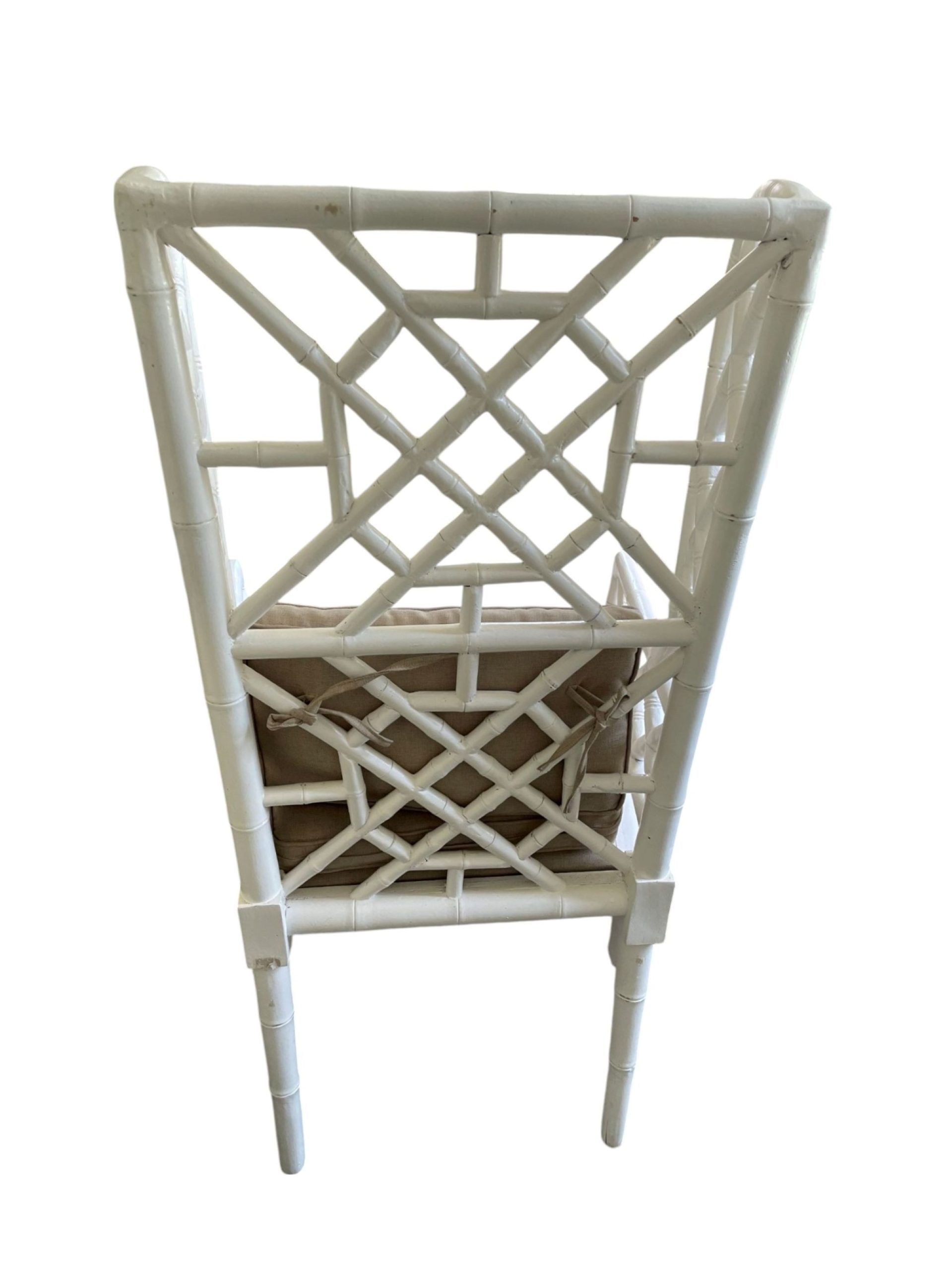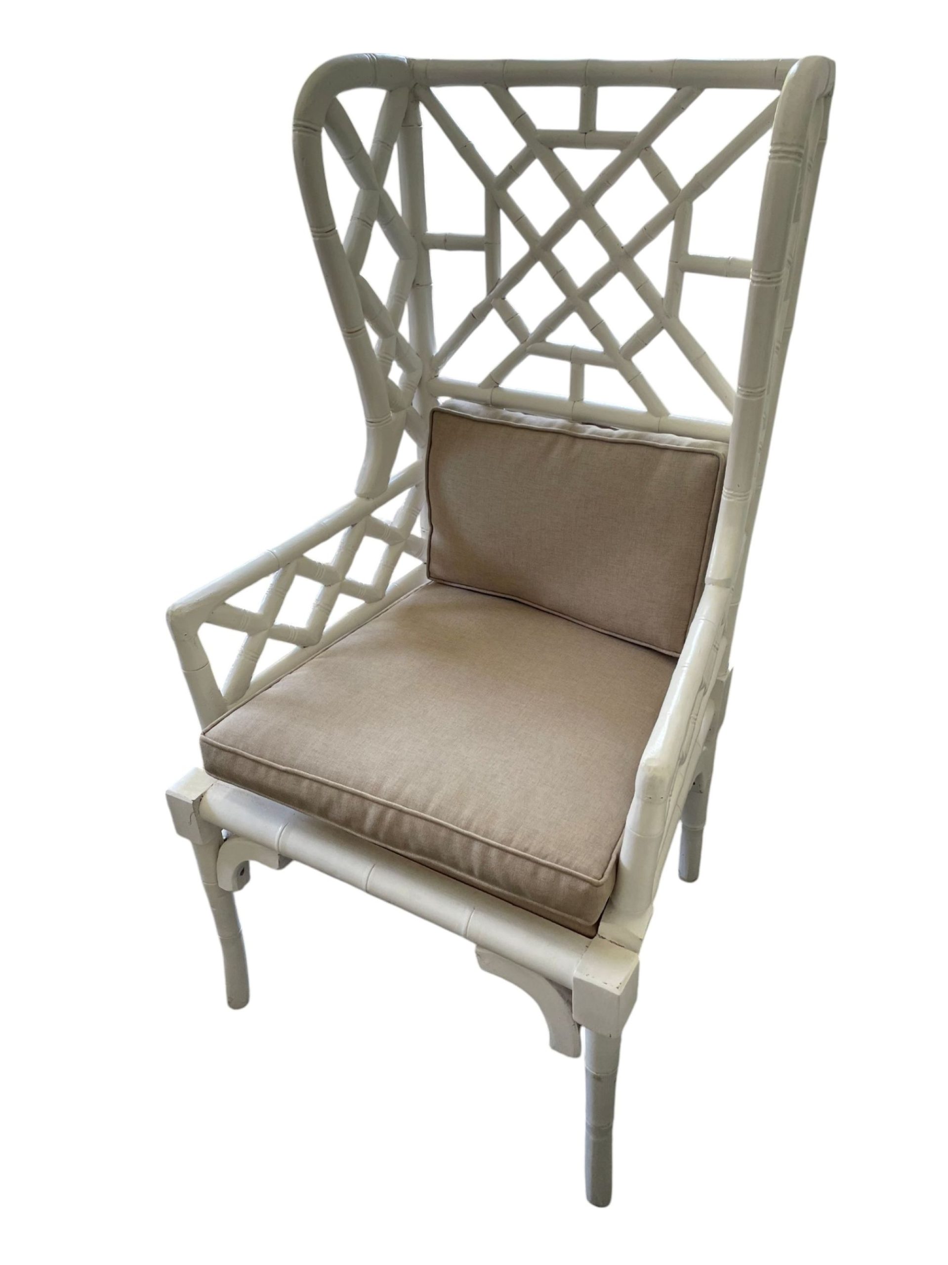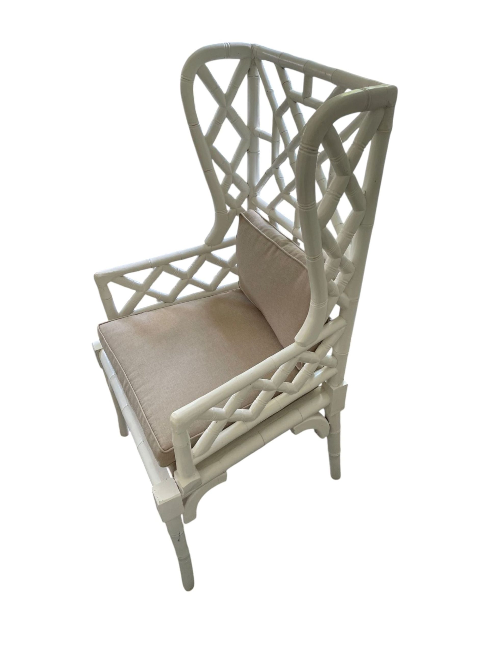 This pair of two Coastal Boho accent armchairs features carved fretwork on solid mahogany wood, with a Chinese bamboo style and white pagoda design, perfect as wingback chairs for a bedroom, porch, or sunroom.