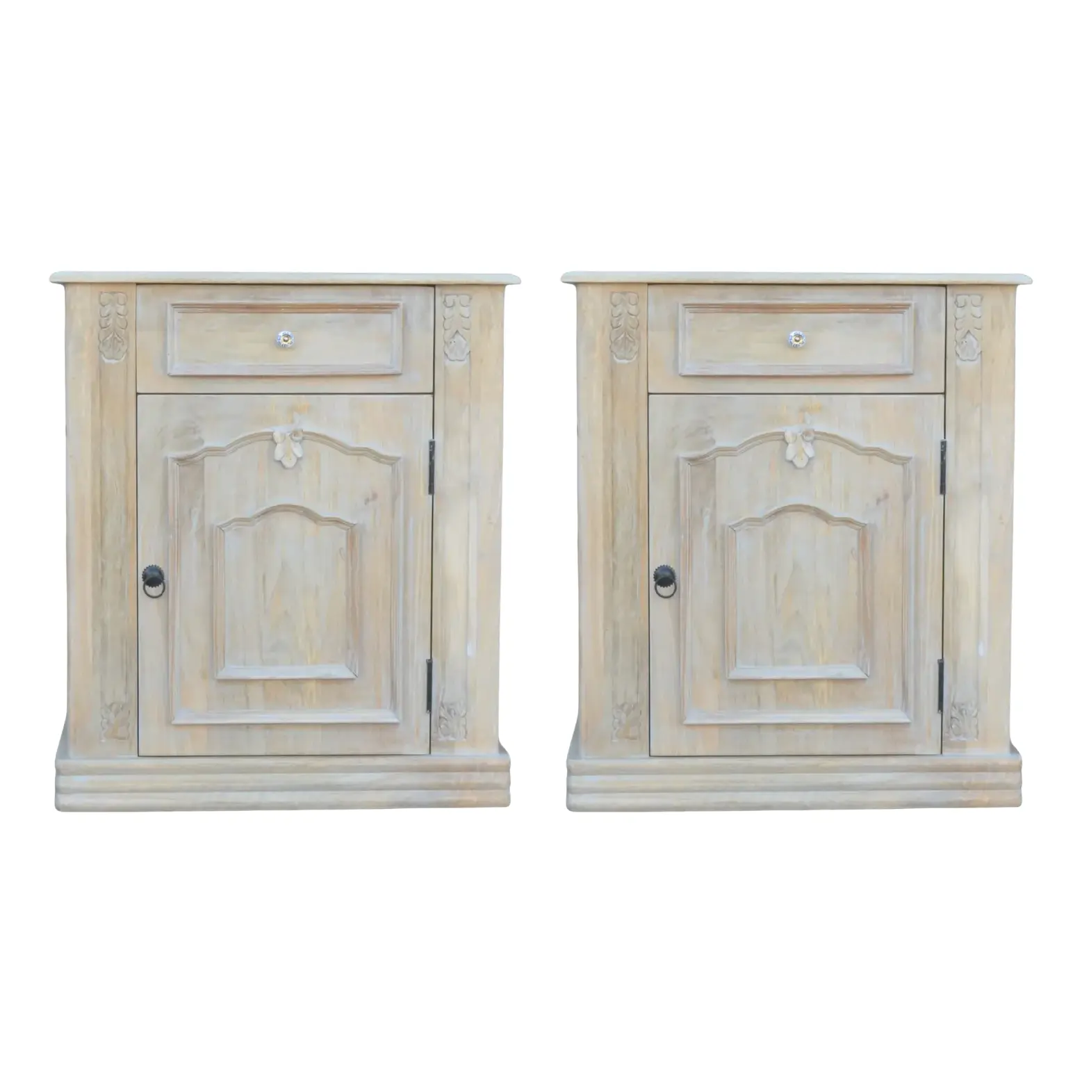 This pair of two French Country Cottage bedside end tables is crafted from carved solid mango wood, featuring one drawer and one door, perfect as a bedroom nightstand set.