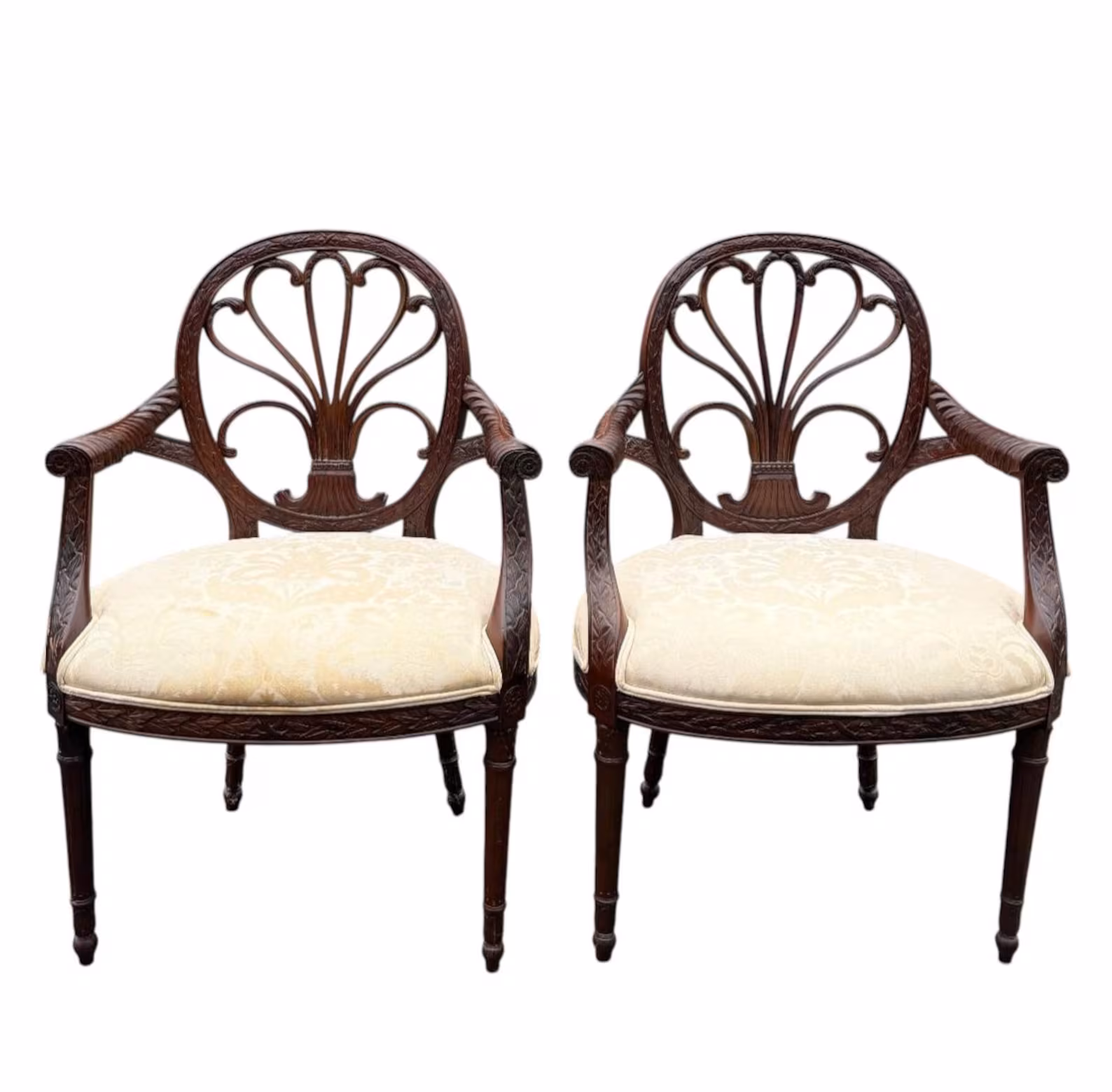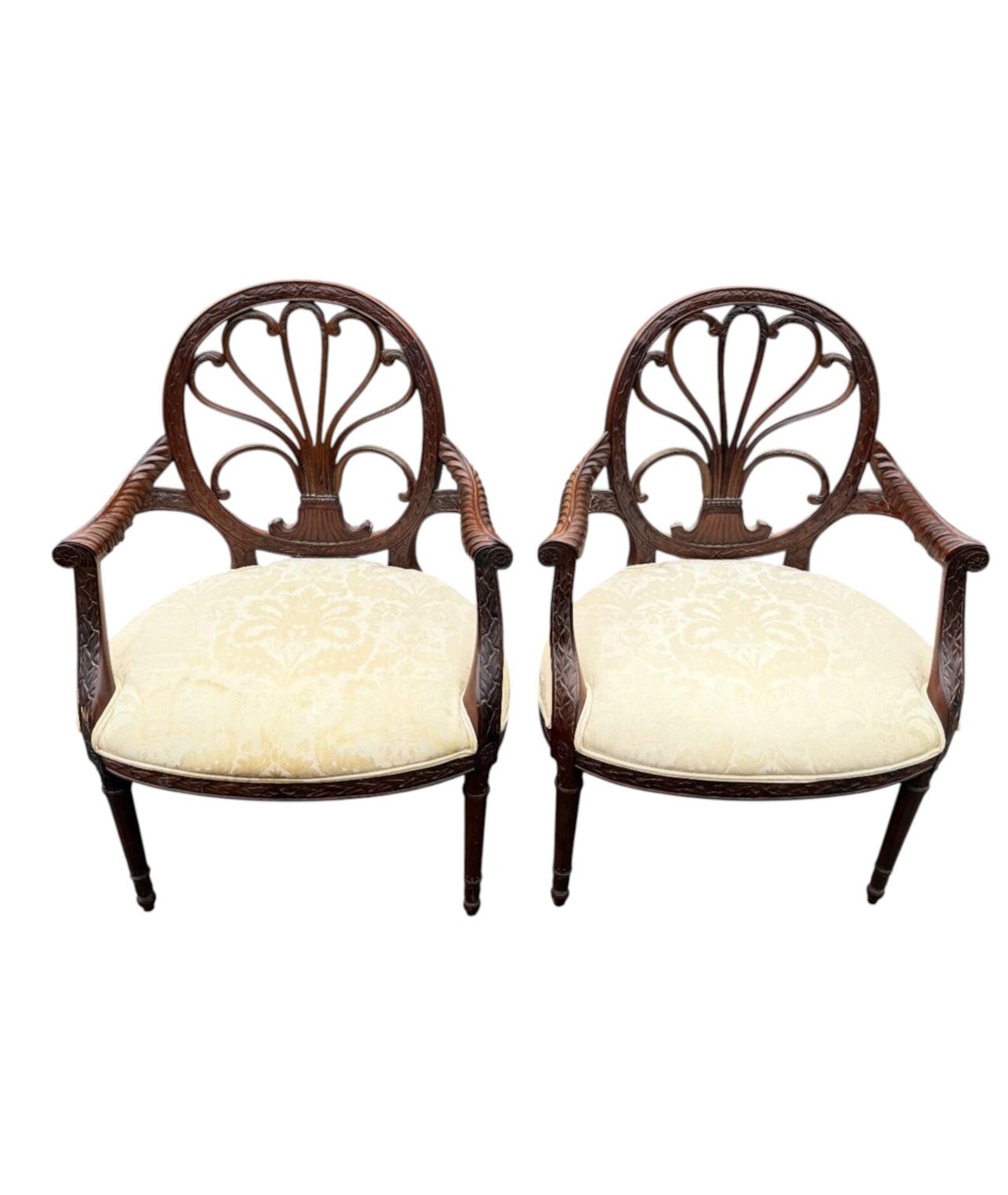 This pair of classic Adams style chairs have oval solid wood backs with carved leaves and a feather like fan. The curved arms are carved like branches and the laurel leaf carving continues onto the frame and the tapered legs. Nice wide, comfortable seats are upholstered in cream damask fabric. In good condition. Small spot on the fabric of one chair as seen in the photo. A few marks on the wood can easily be covered with old English polish.