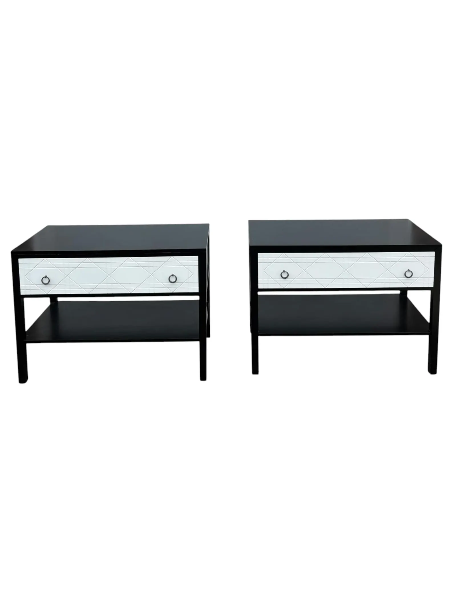 Set of 2 modern nightstands. Each piece features a sleek black frame, a single white drawer with subtle diamond-pattern etching, and silver ring pulls. An open lower shelf provides extra storage or display space for books, baskets, or decor. Minor marks on them from use but nothing super noticeable.