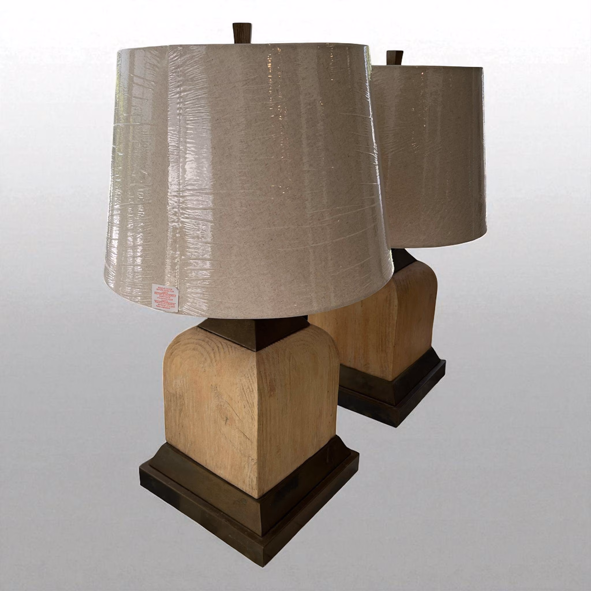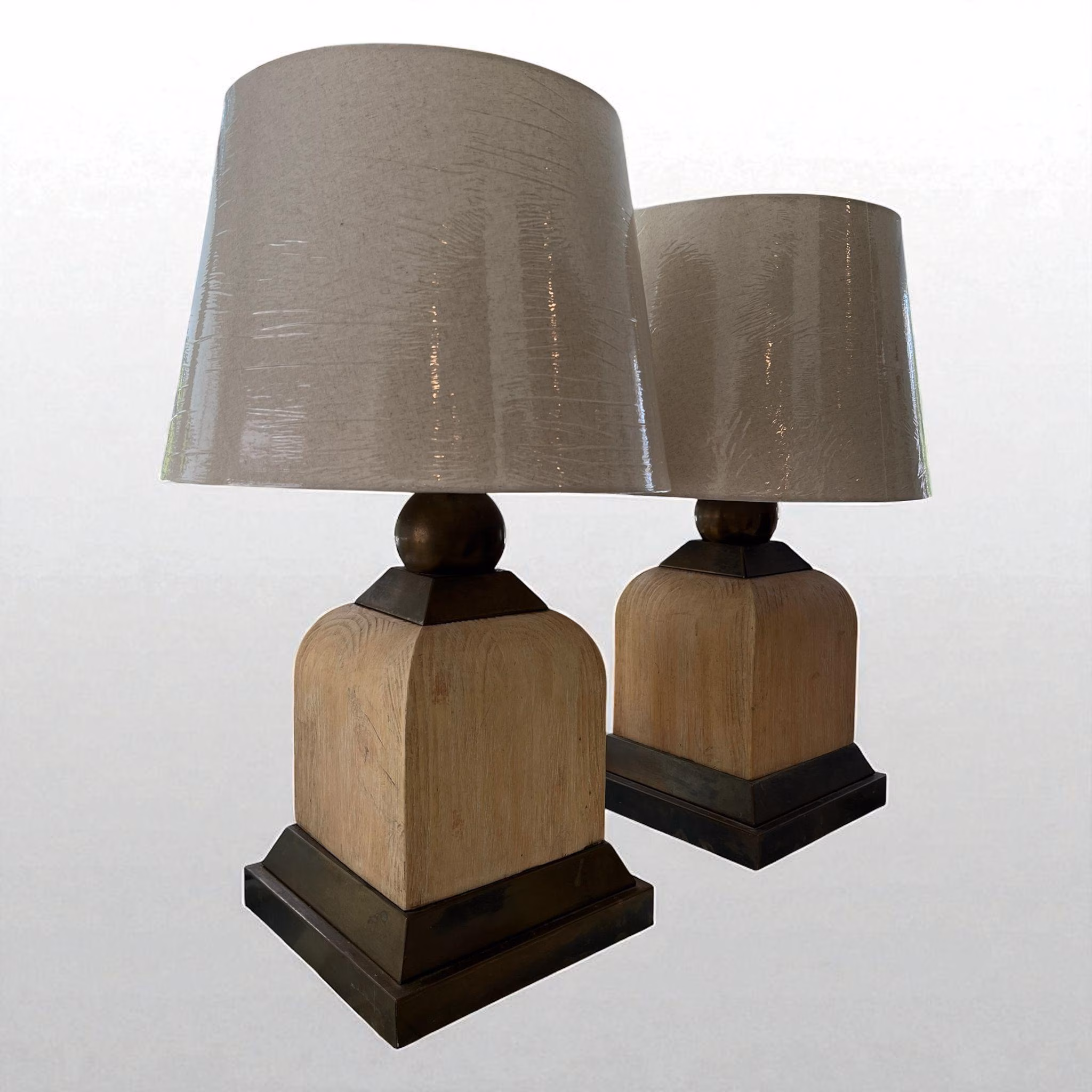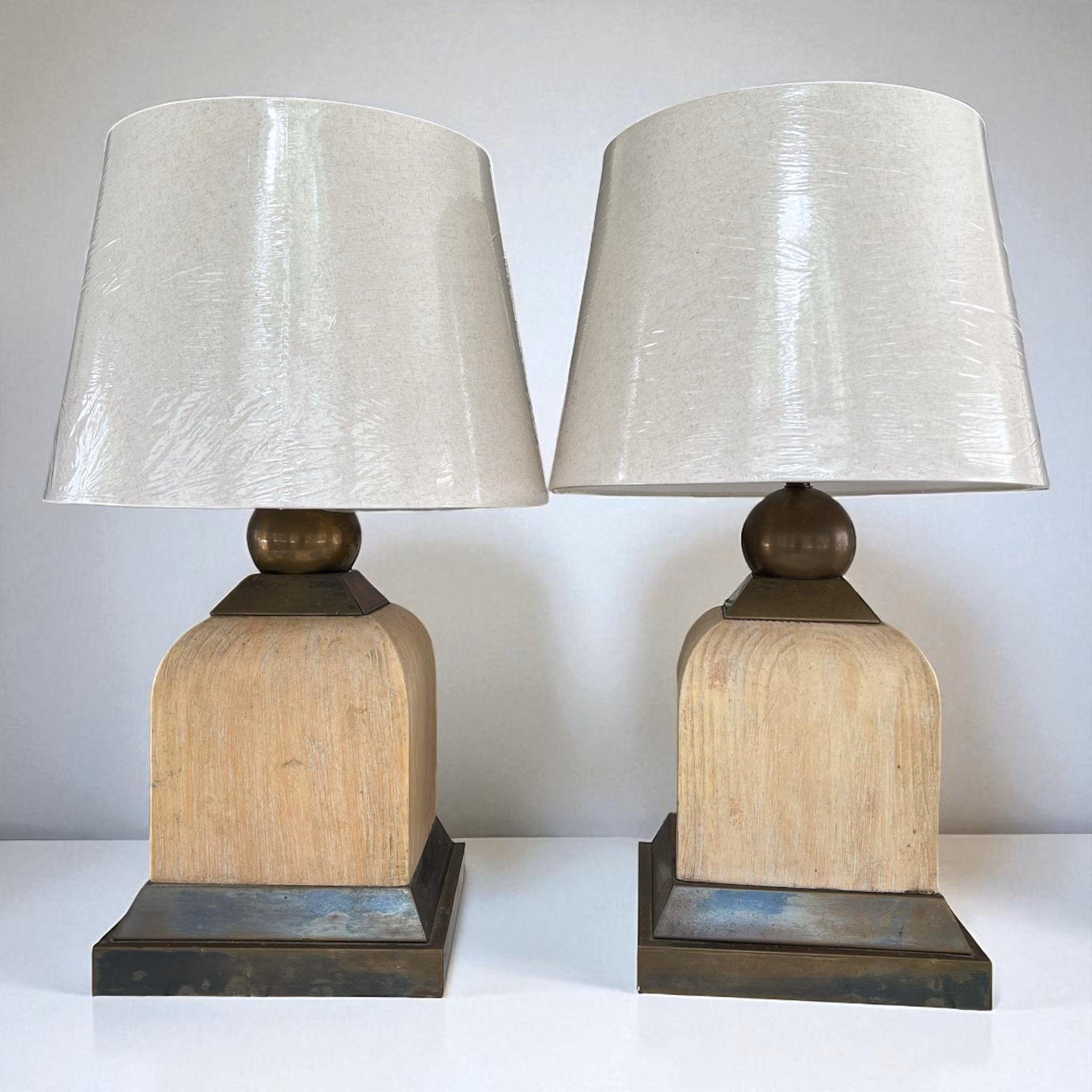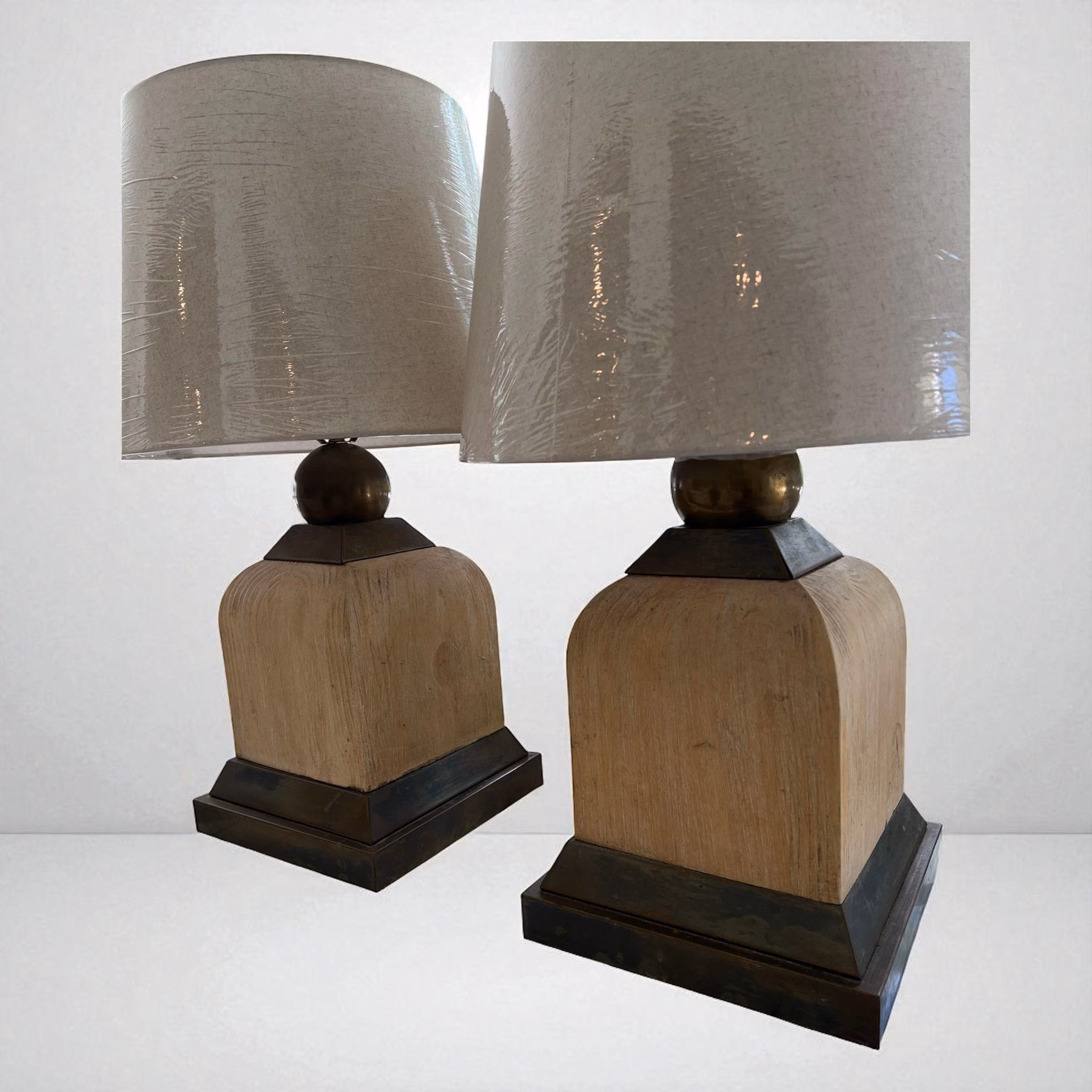 This unique pair of vintage lamps are heavy and handsome! Their square white washed wood shape is accentuated with brass framing and a brass ball that holds the harp. Since they are from the 1980s, the brass has acquired a rich bronze patina. We liked them that way as it adds to their history. But the brass could also be polished. The finials are newer and their square angles echo the base. Brand new shades. In working order and very good condition.