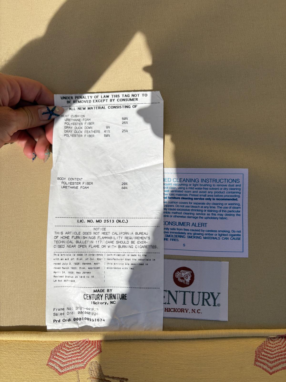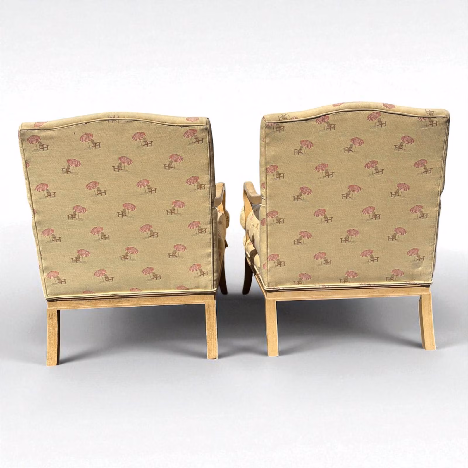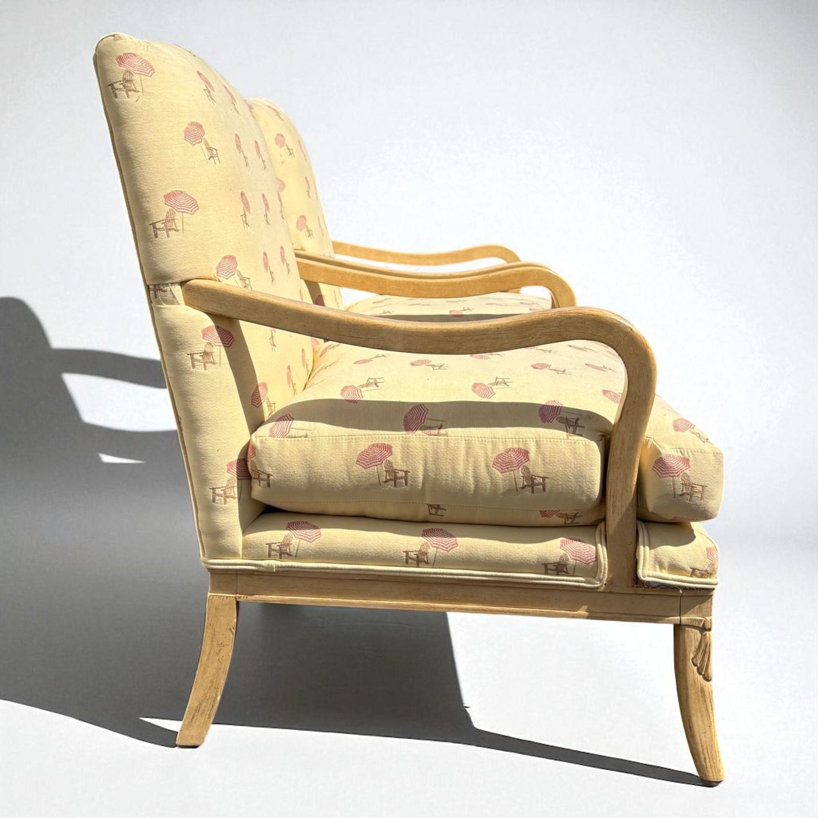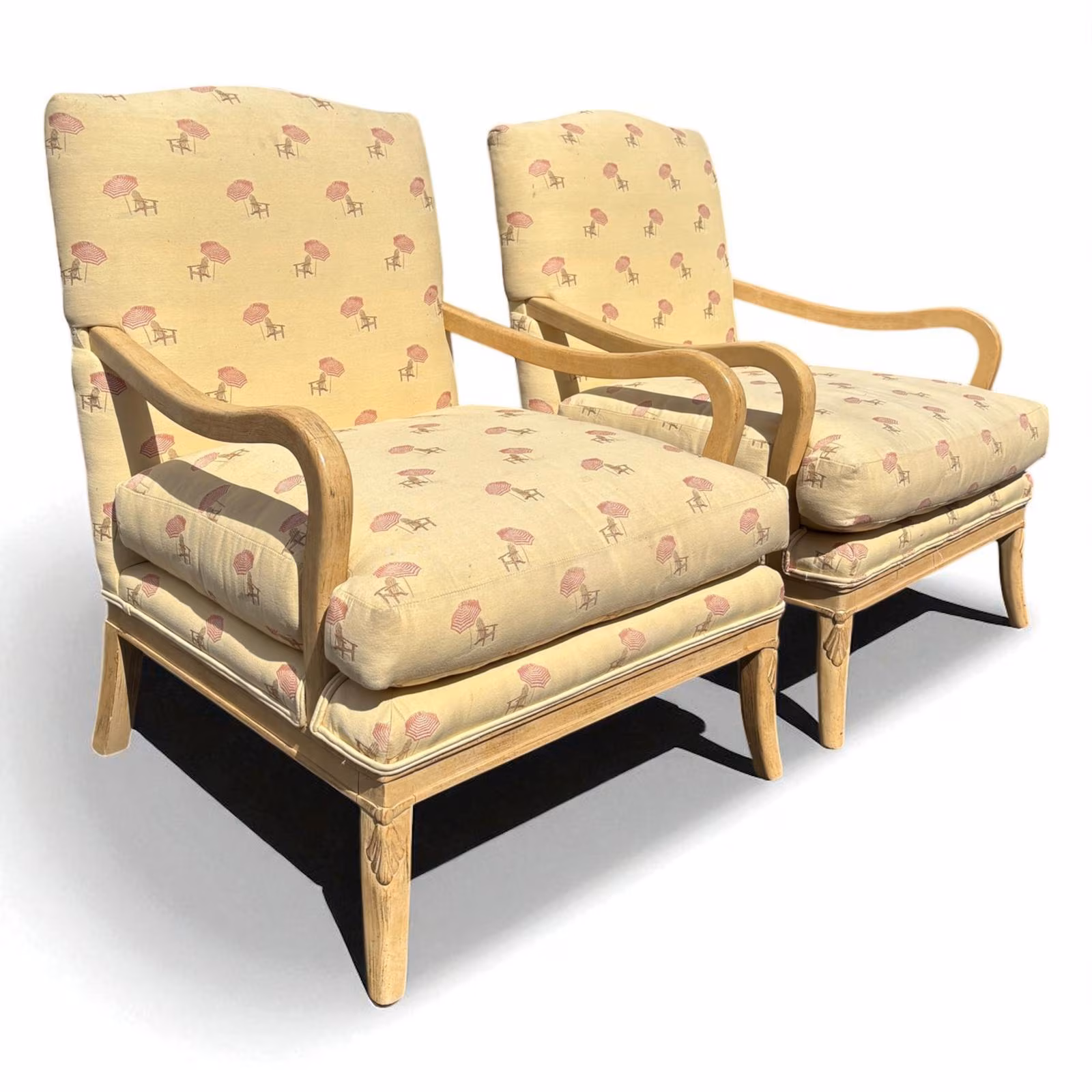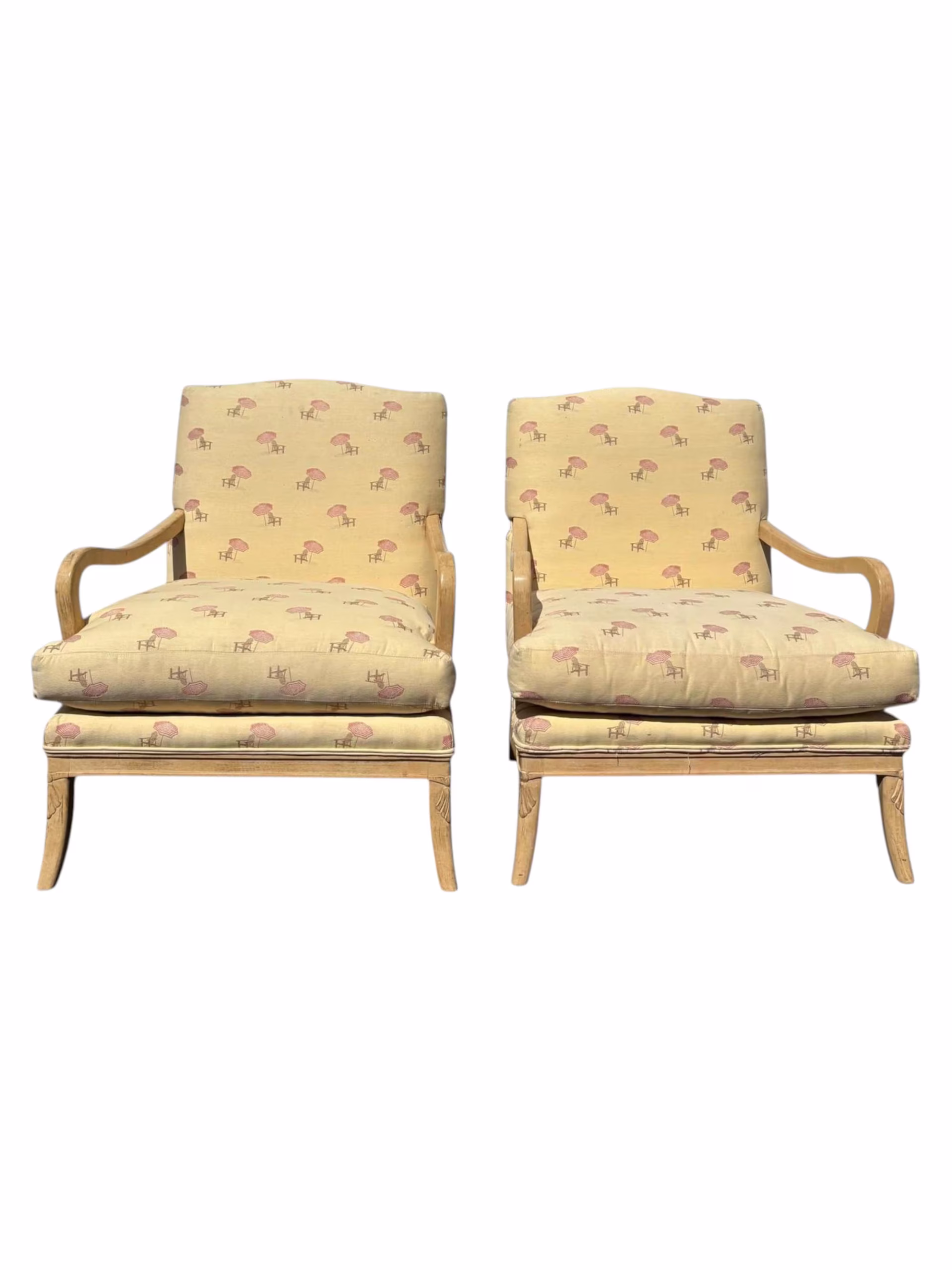 Elegant pair of Century Furniture lounge chairs with whimsical custom upholstered beach chair design. Crafted with timeless quality, these chairs feature carved wooden frames with gently curved arms and tapered legs, showcasing the brand’s signature craftsmanship. Each chair includes a plush, removable seat cushion and a generously sized back cushion, offering both style and comfort. In terms of condition, on one corner of one of the chairs the upholstery needs to be glued back down (pic included of damage). Upholstery is in good condition otherwise.