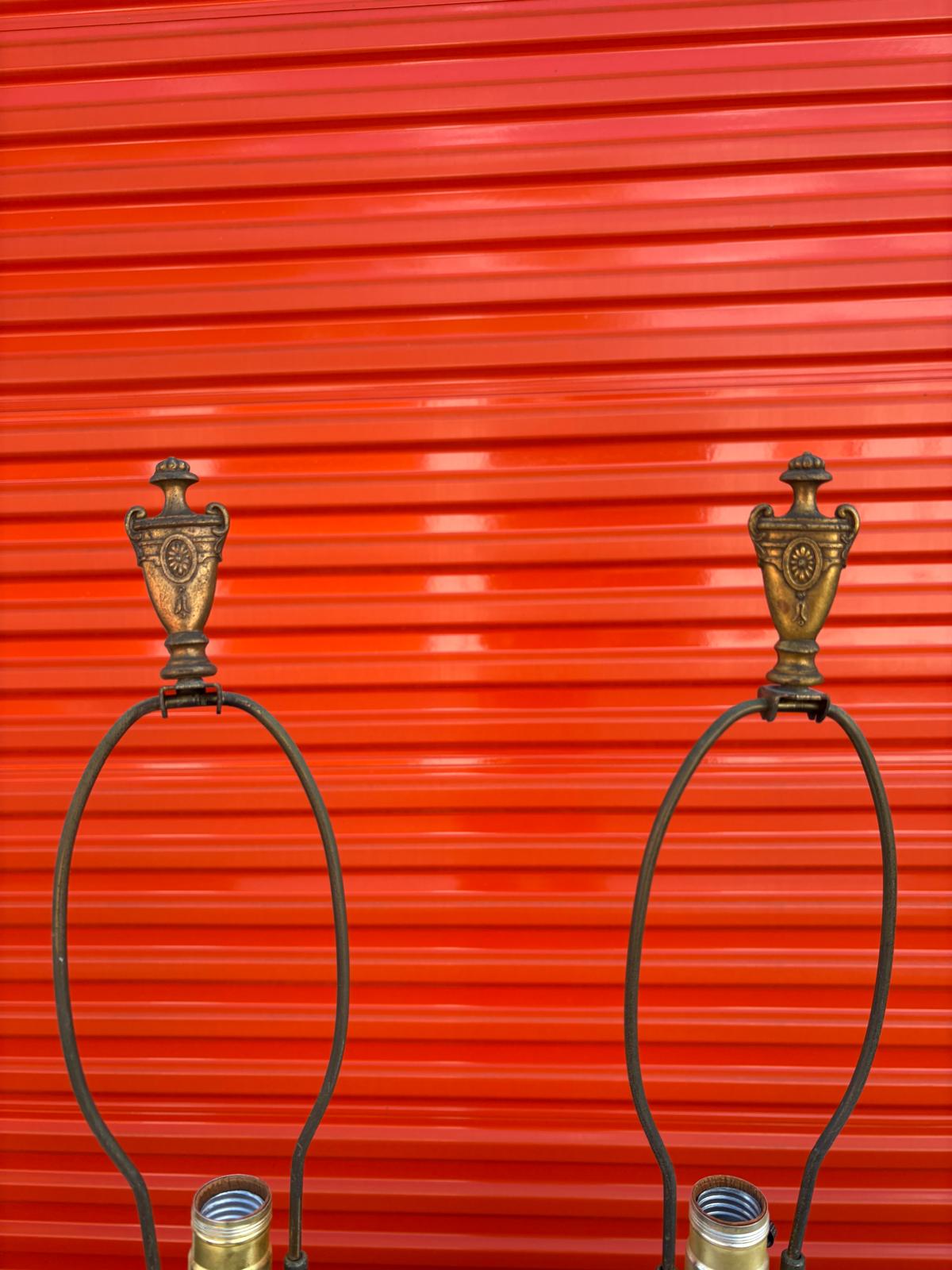 This elegant pair of vintage table lamps brings timeless charm and sophistication to any room. Crafted with ornate ceramic bases, each lamp features a soft cream background adorned with delicate raised hand-painted floral motifs in shades of pink, yellow, and green. Raised scrollwork and gilt accents add a touch of refinement, while the hexagonal brass bases with pierced detailing provide a sturdy and decorative foundation. The lamps do not come with shades.