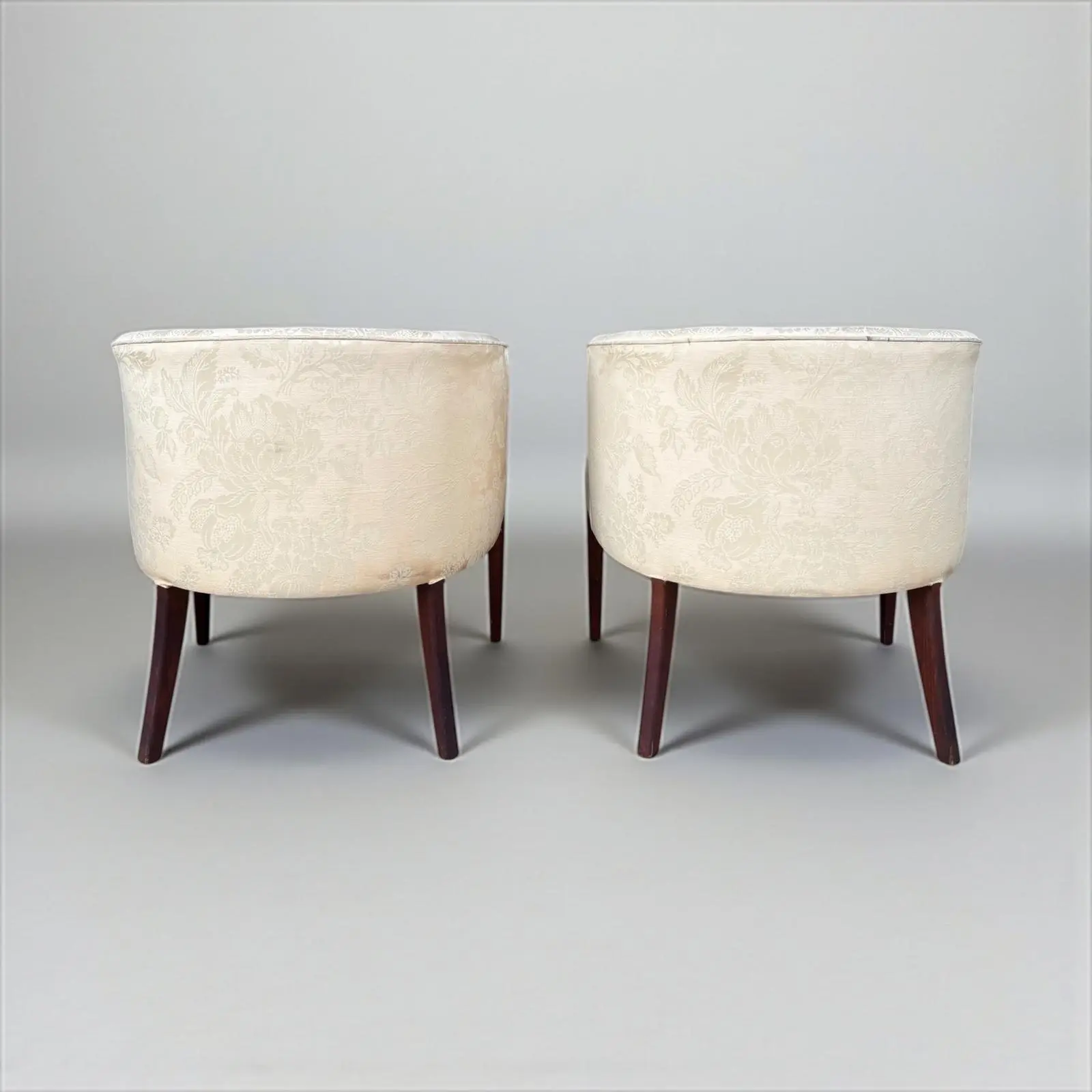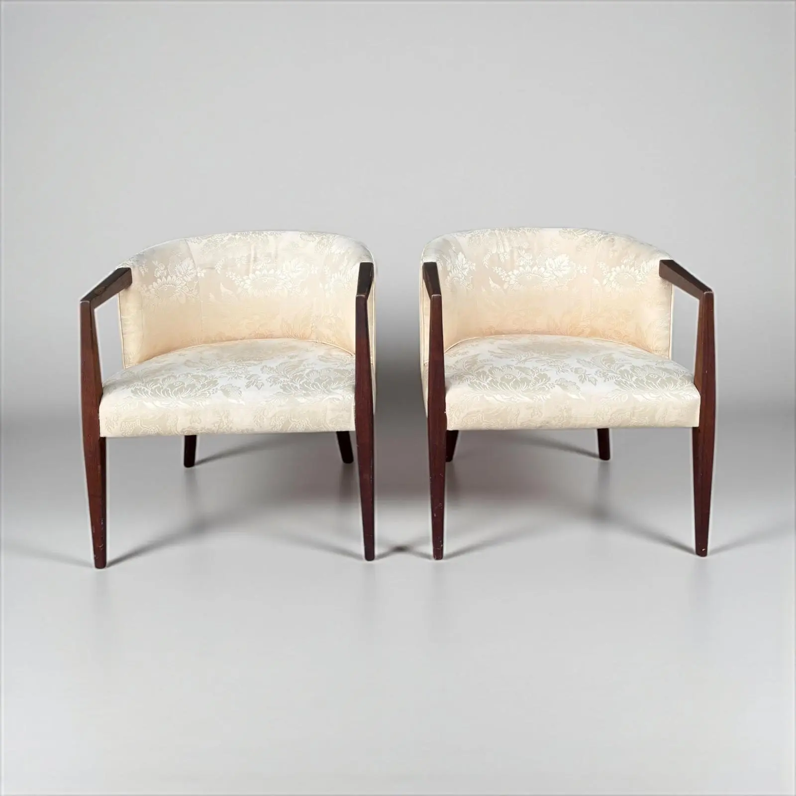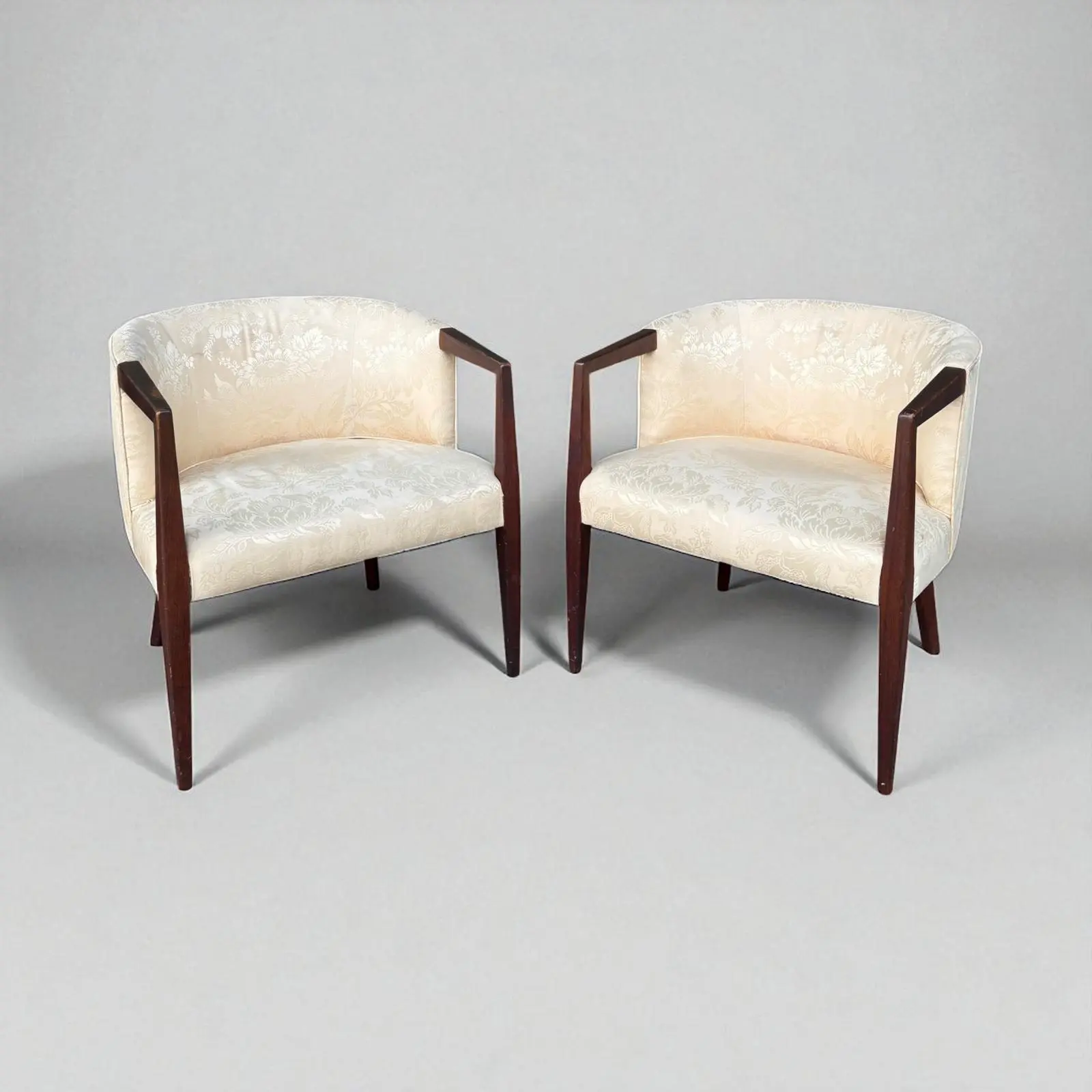 This stunning pair of vintage barrel-back armchairs blends sculptural Mid-Century Modern form with timeless traditional elegance. Featuring gracefully tapered solid walnut legs and angular open arms, each chair offers a refined silhouette that nods to the sleek lines of the 1960s. There are a few stains and marks on the fabric (pics included).